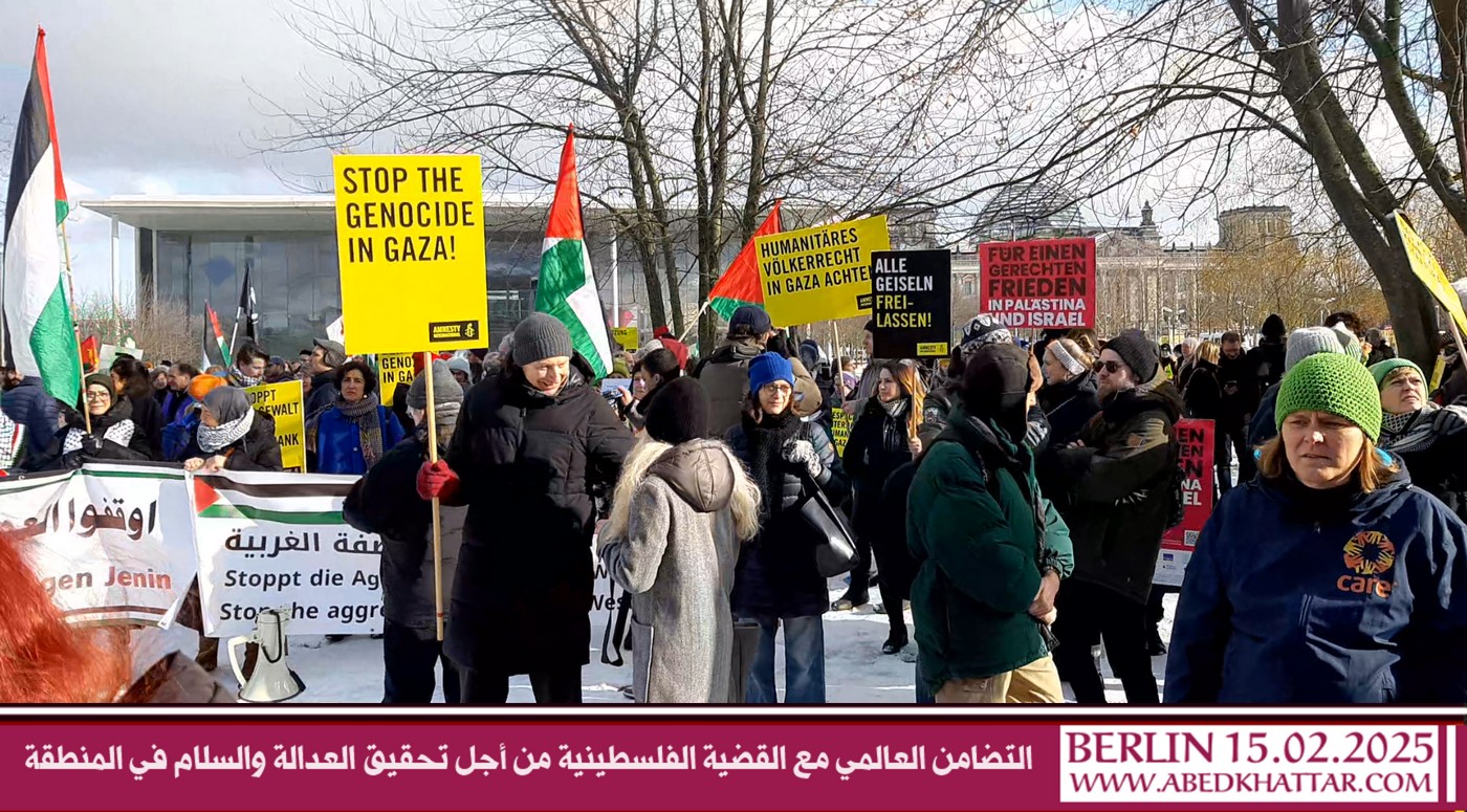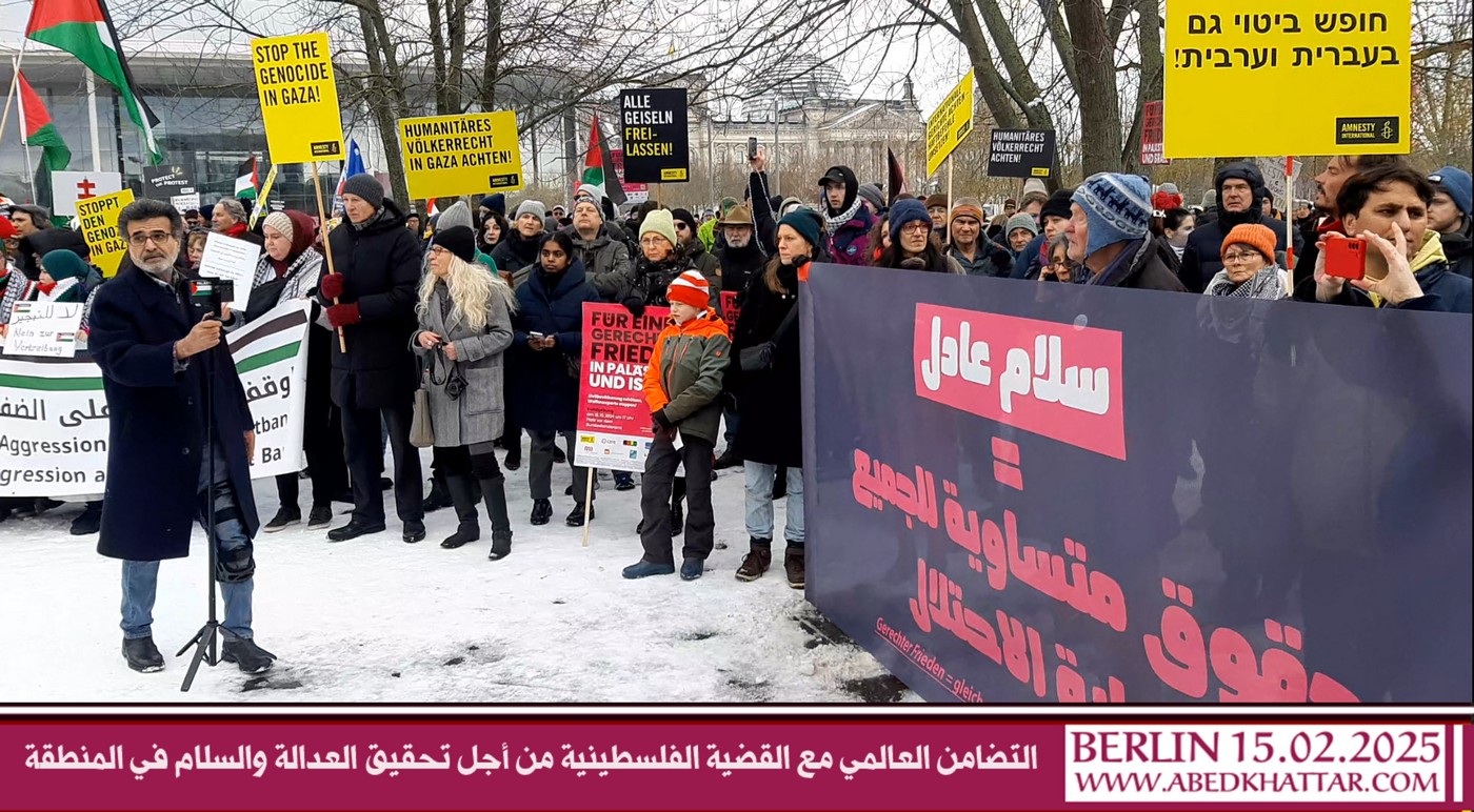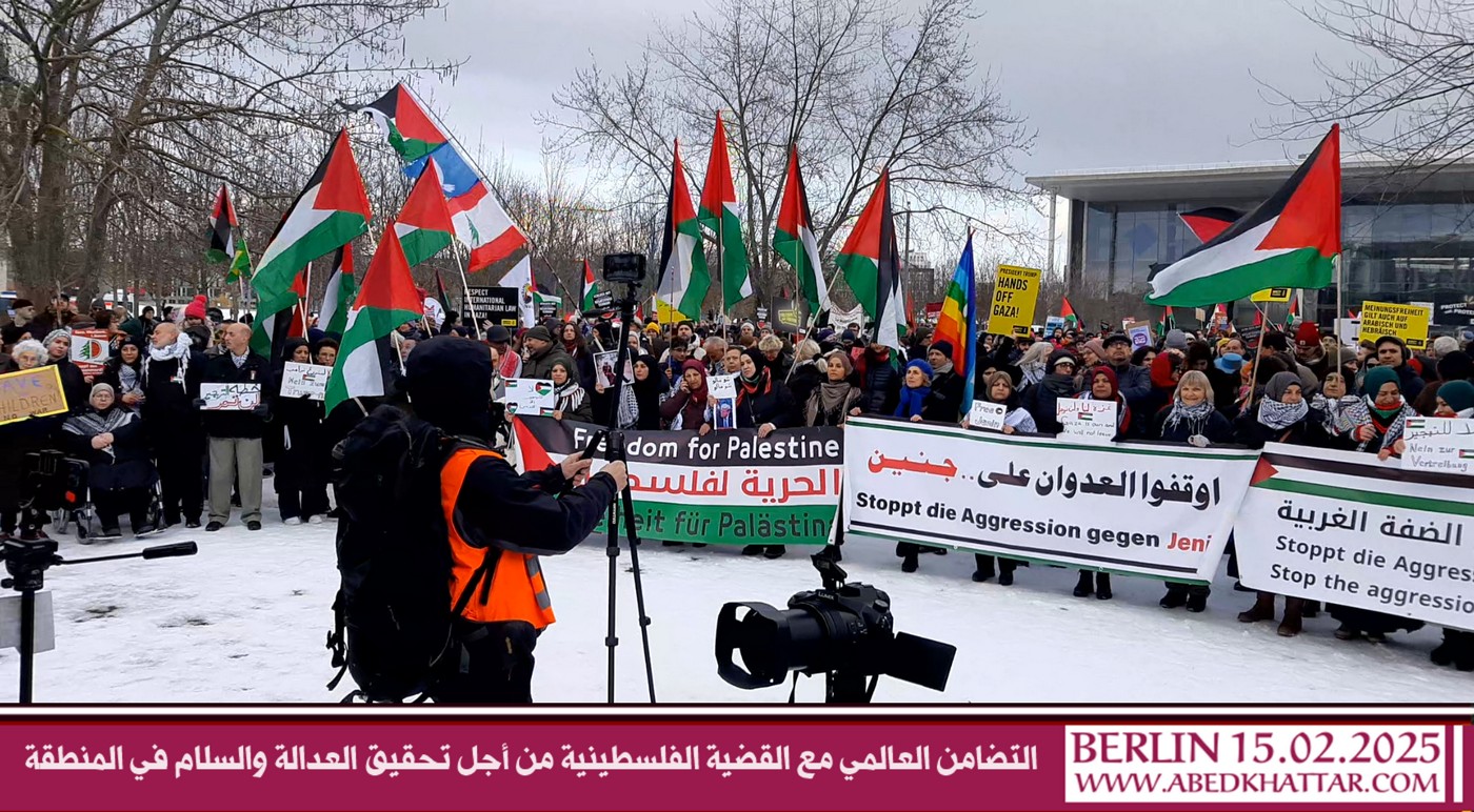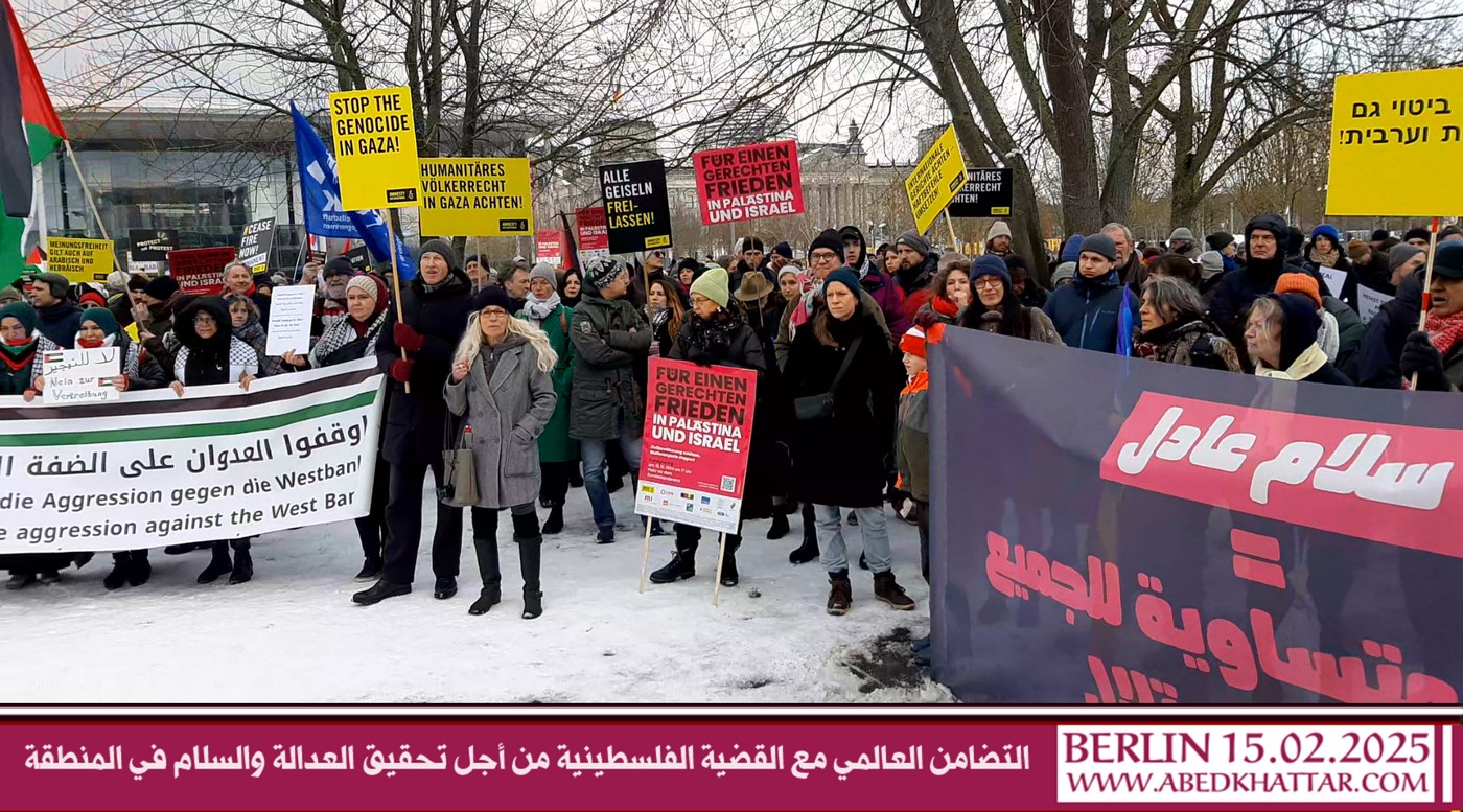 برلين، 15 فبراير 2025 – بدعوة من منظمة العفو الدولية ومنظمات ألمانية عديدة وبمشاركة اللجنة الوطنية الفلسطينية الموحدة في برلين، شهدت العاصمة الألمانية اليوم وقفة حاشدة تدعو إلى السلام العادل والشامل للجميع وليس مع الحكومات .