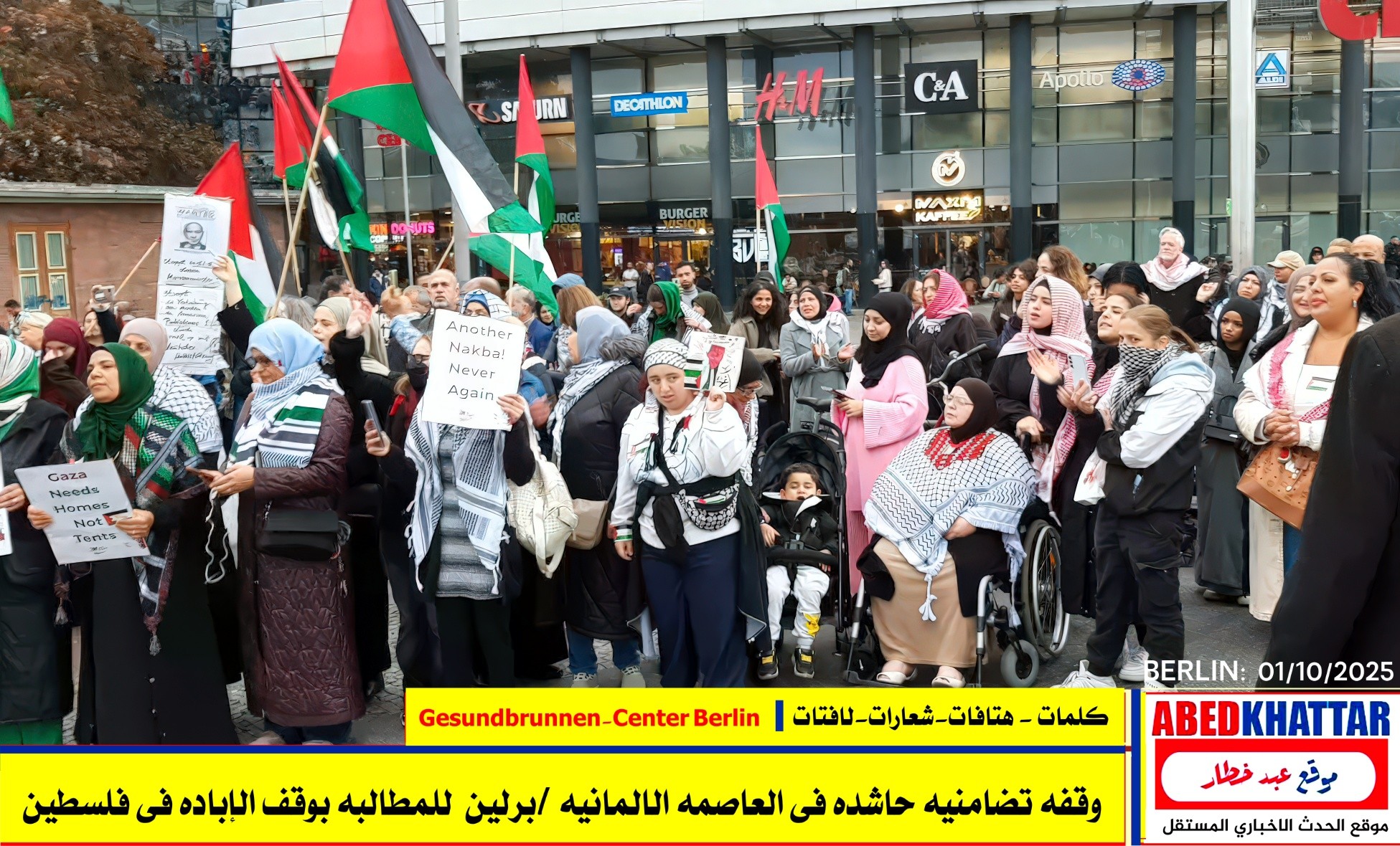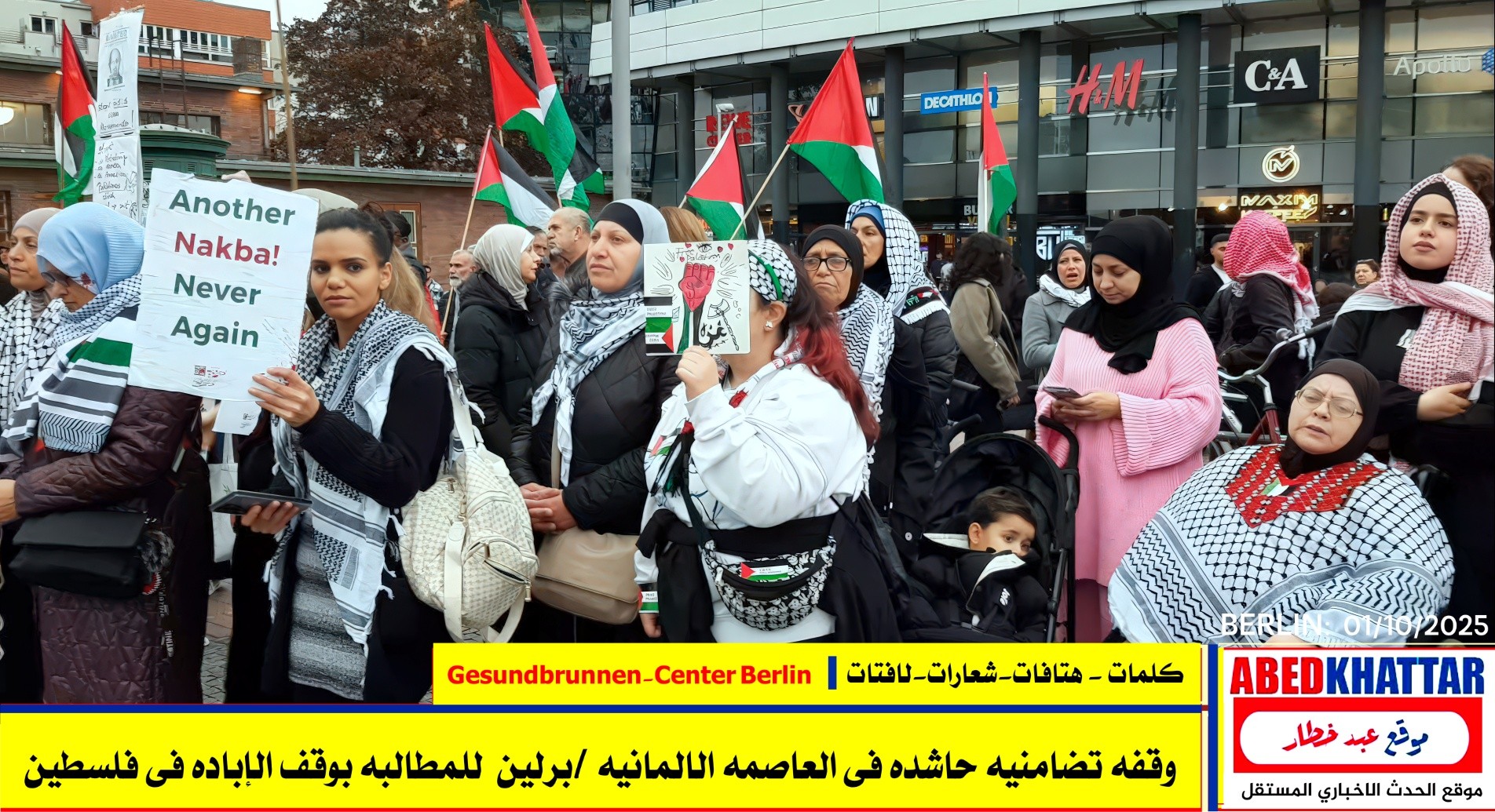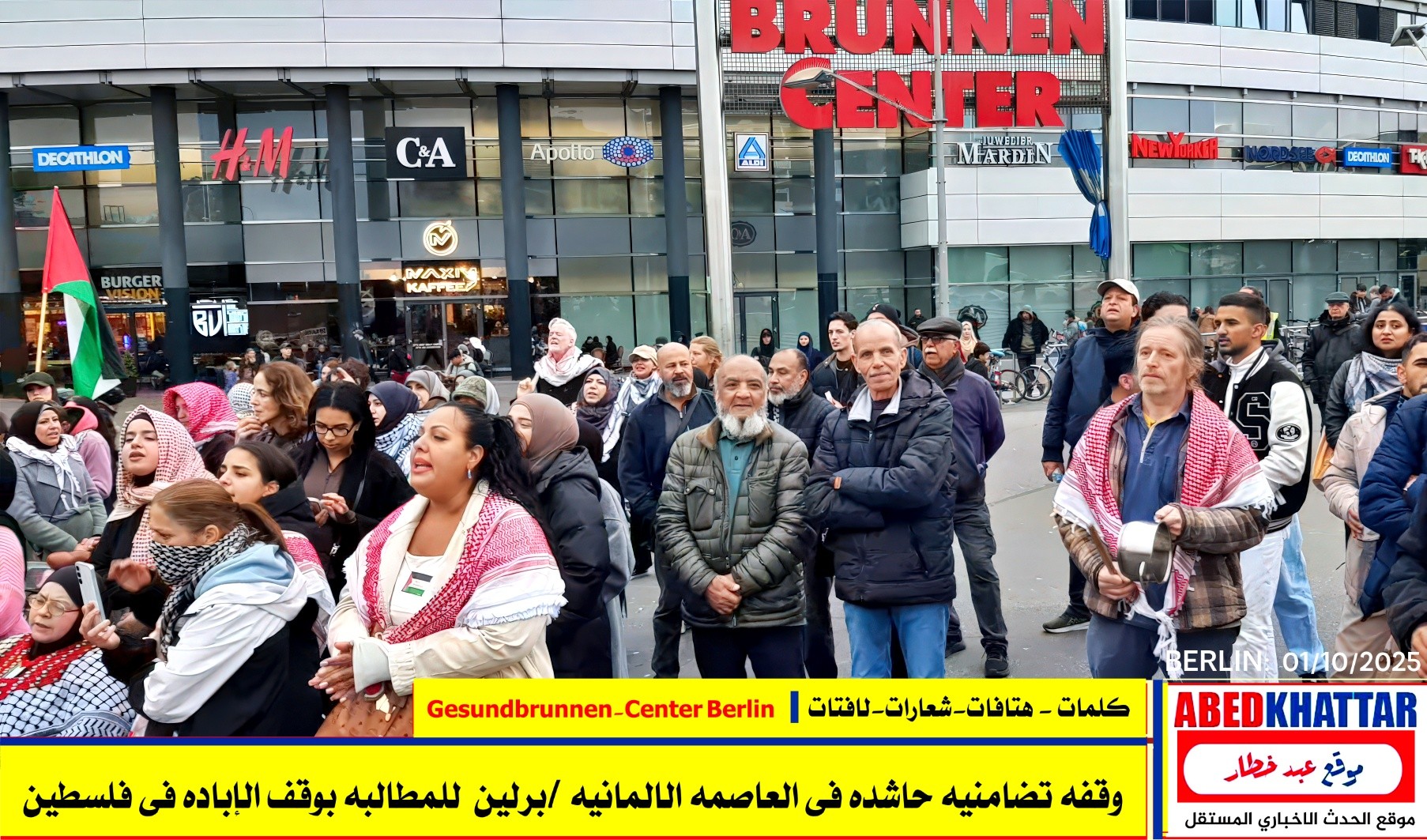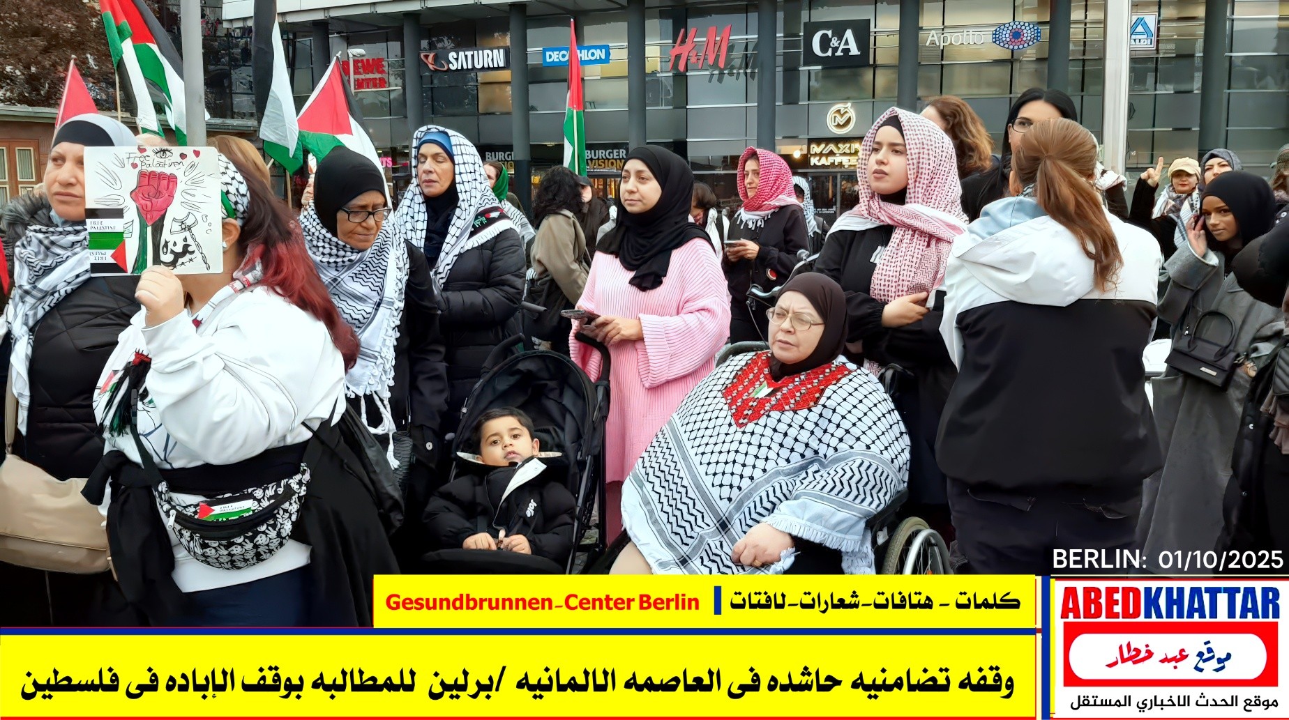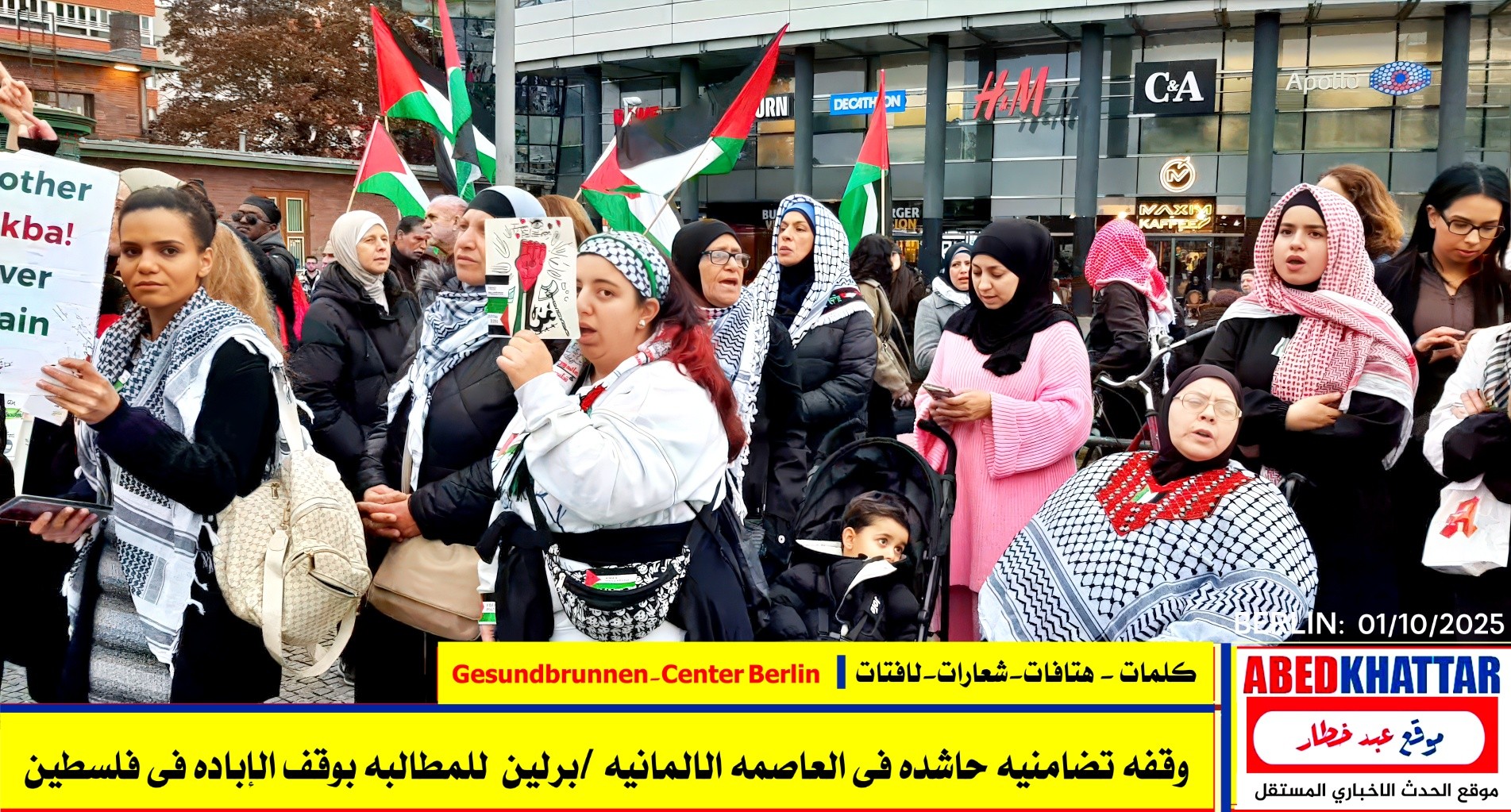 بالصور والفيديو : نظّمت اللجنة الوطنية الفلسطينية الموحدة في برلين اليوم، 1 /10/ 2025، وقفة تضامنية في ساحة Gesundbrunnen-Center Berlin