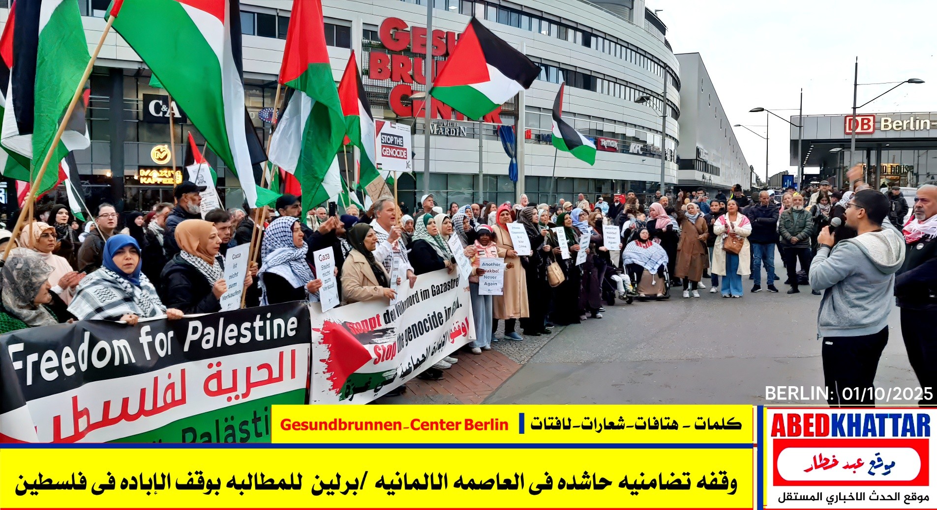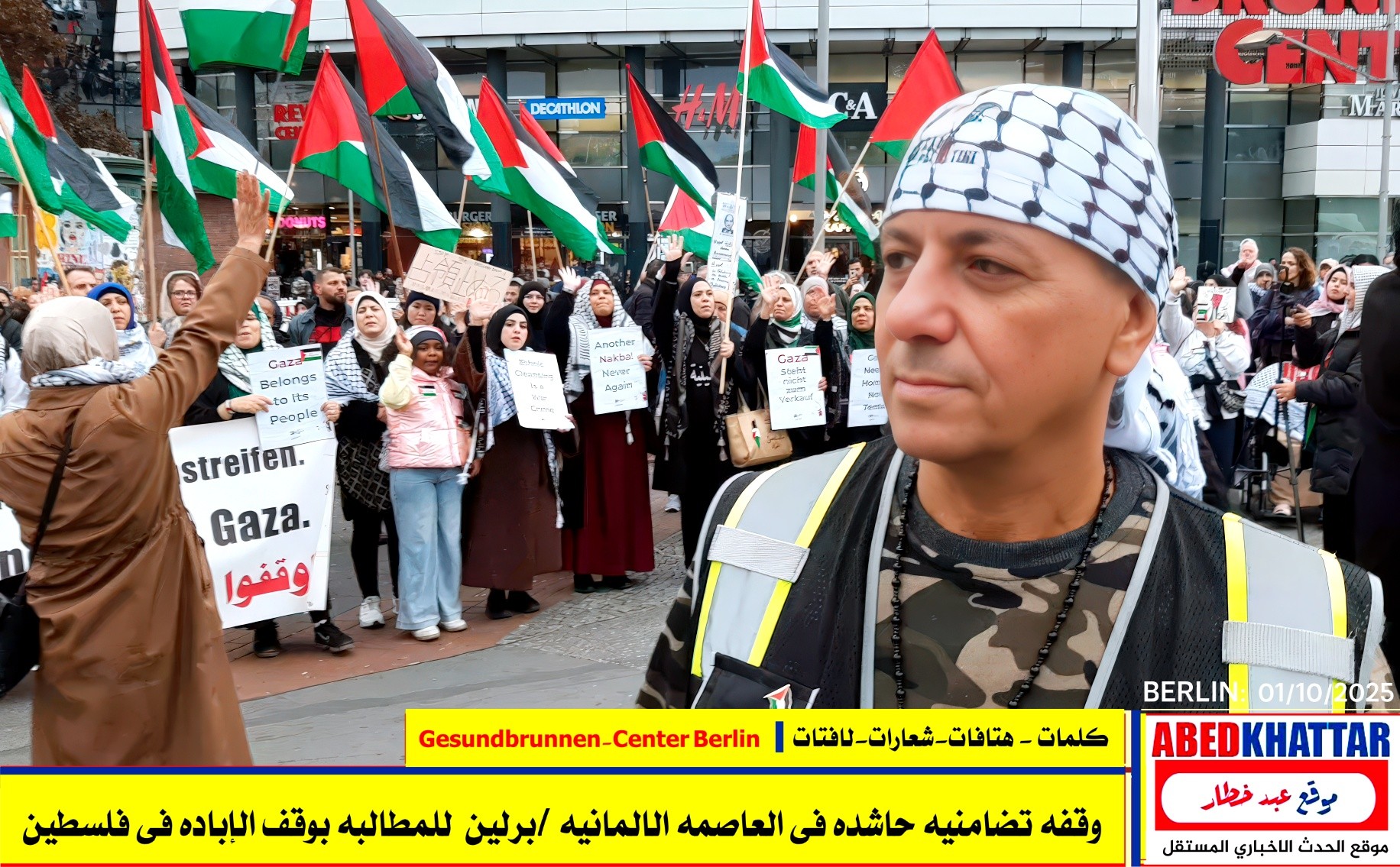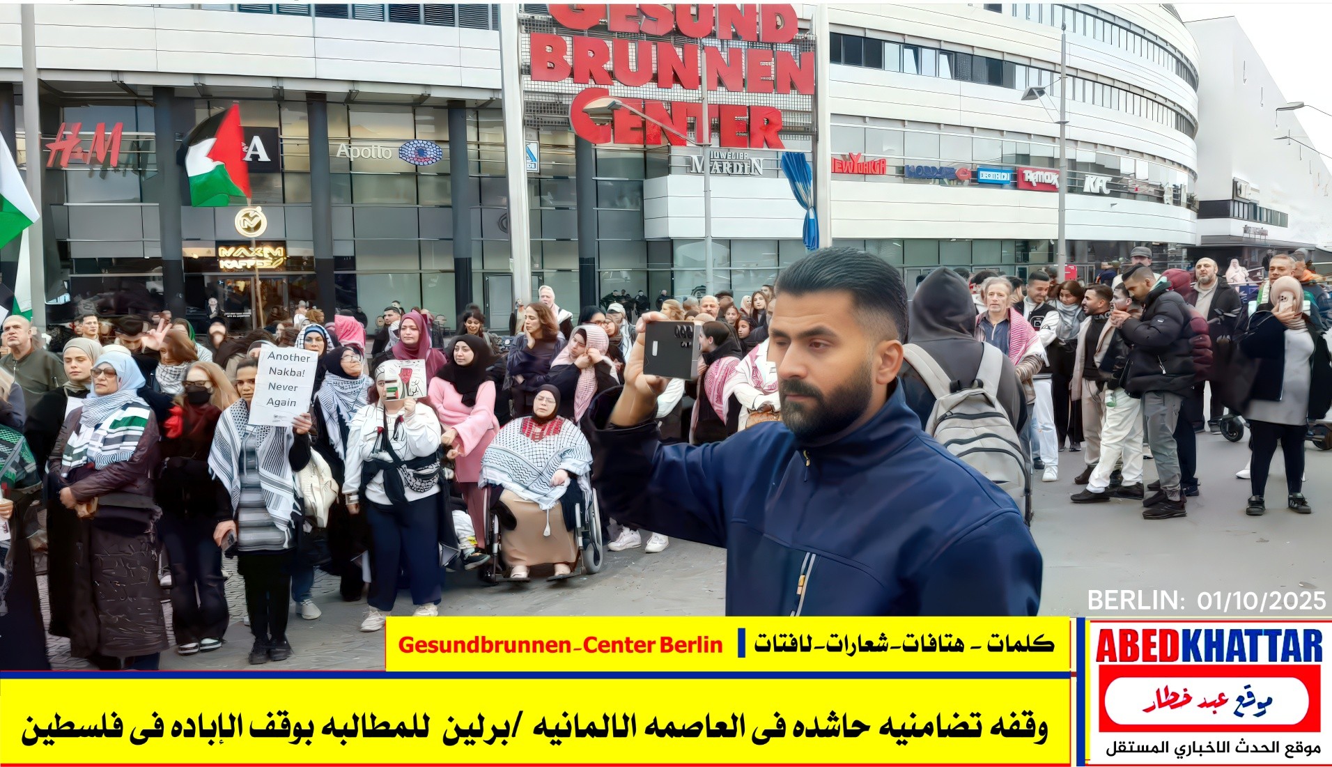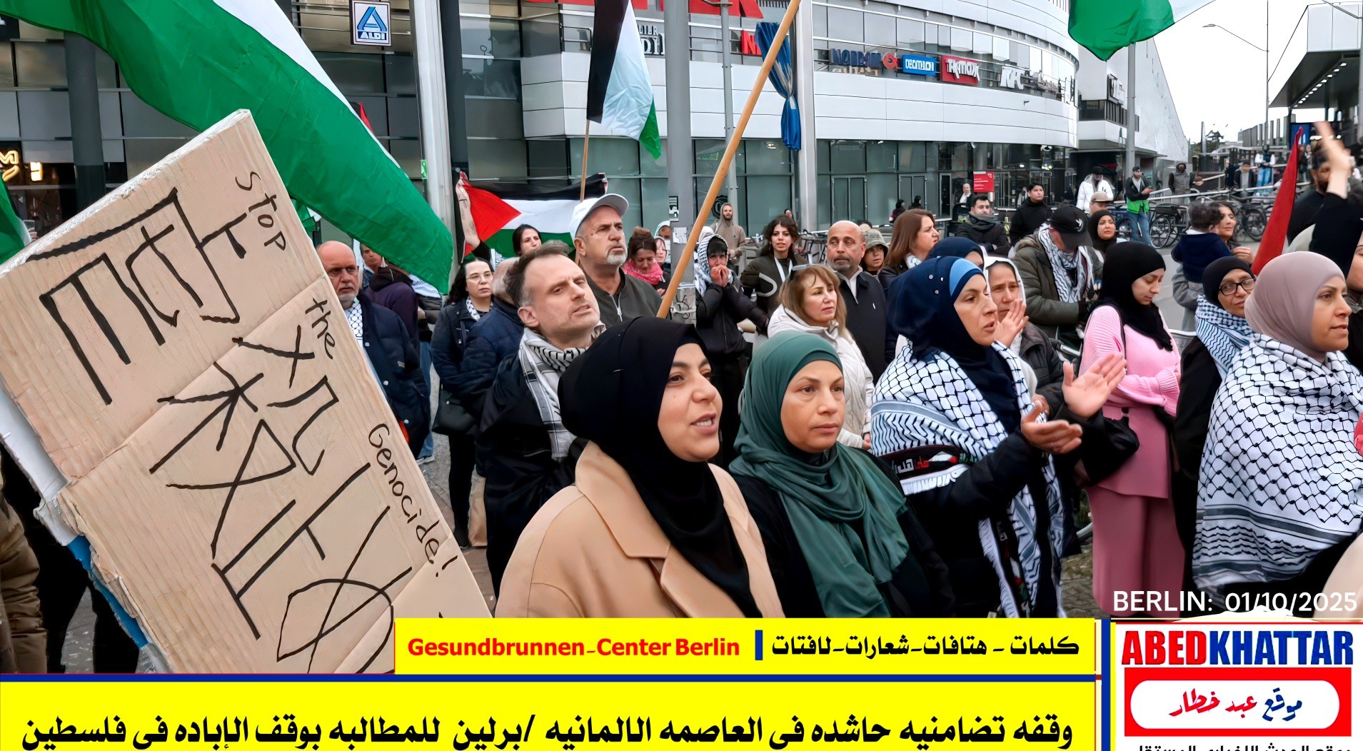 بالصور والفيديو : نظّمت اللجنة الوطنية الفلسطينية الموحدة في برلين اليوم، 1 /10/ 2025، وقفة تضامنية في ساحة Gesundbrunnen-Center Berlin
