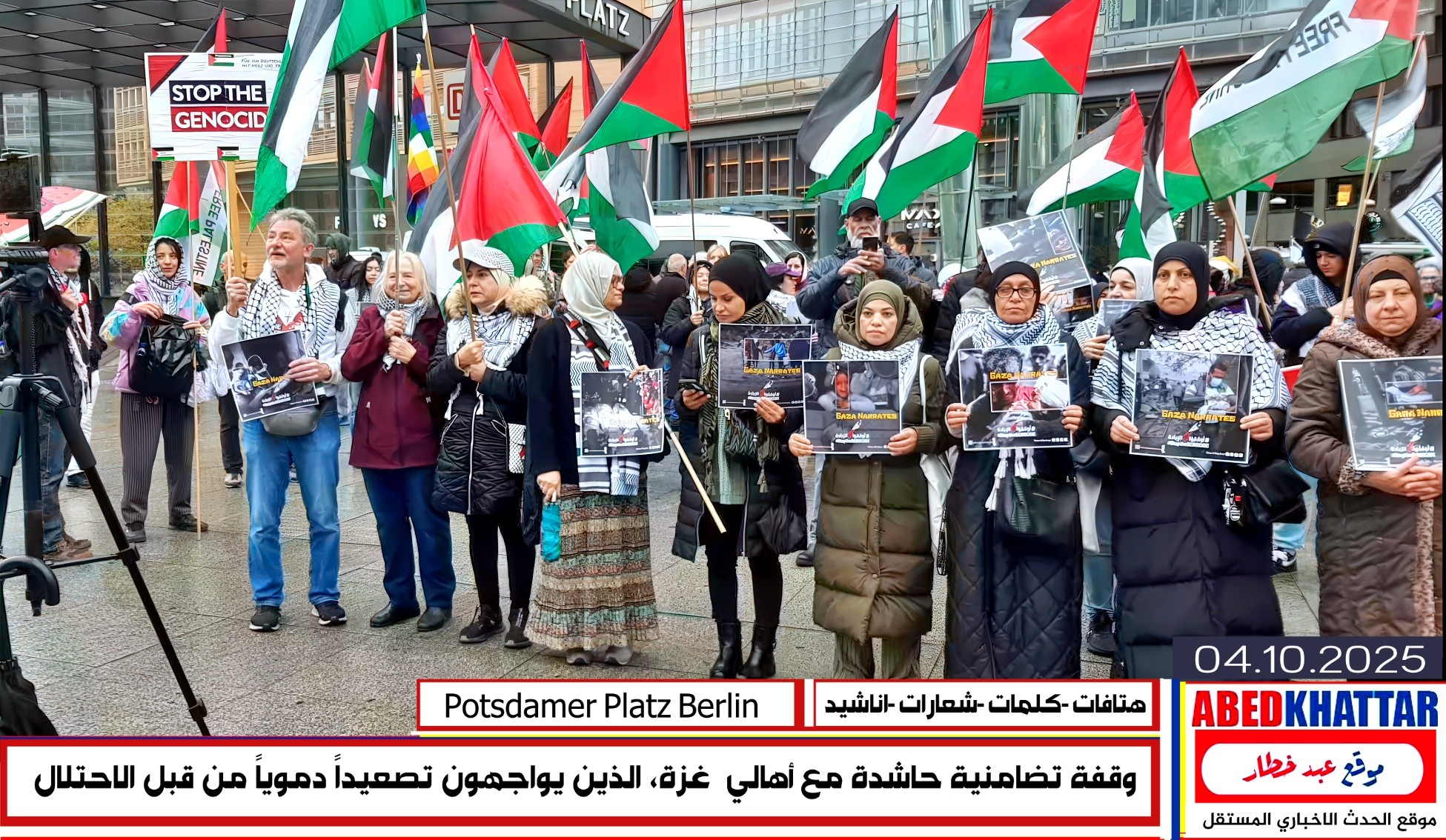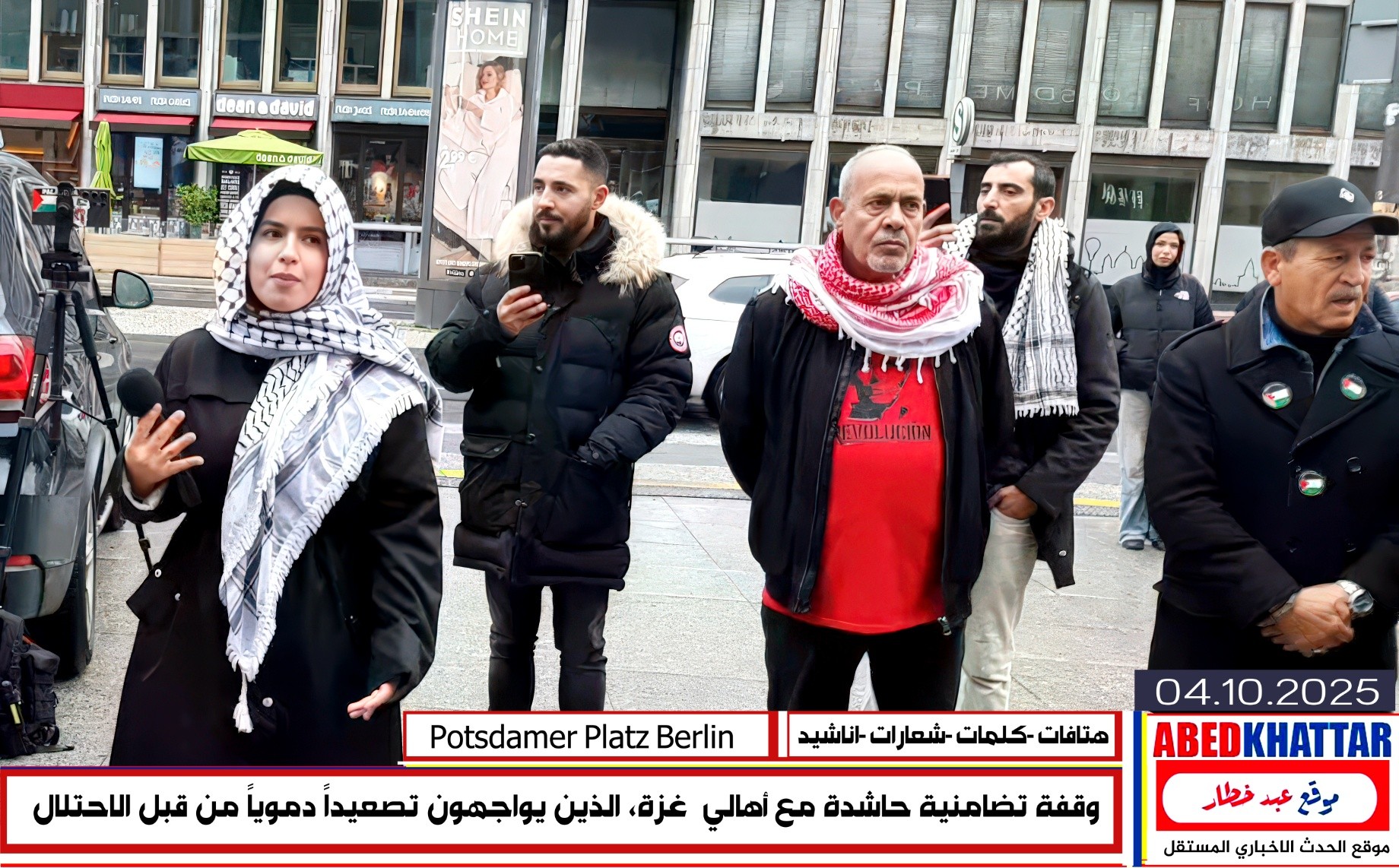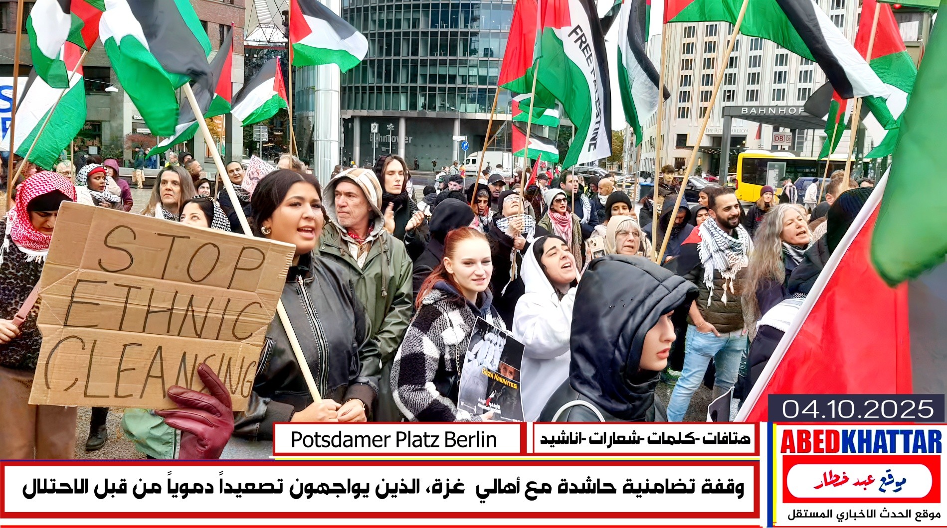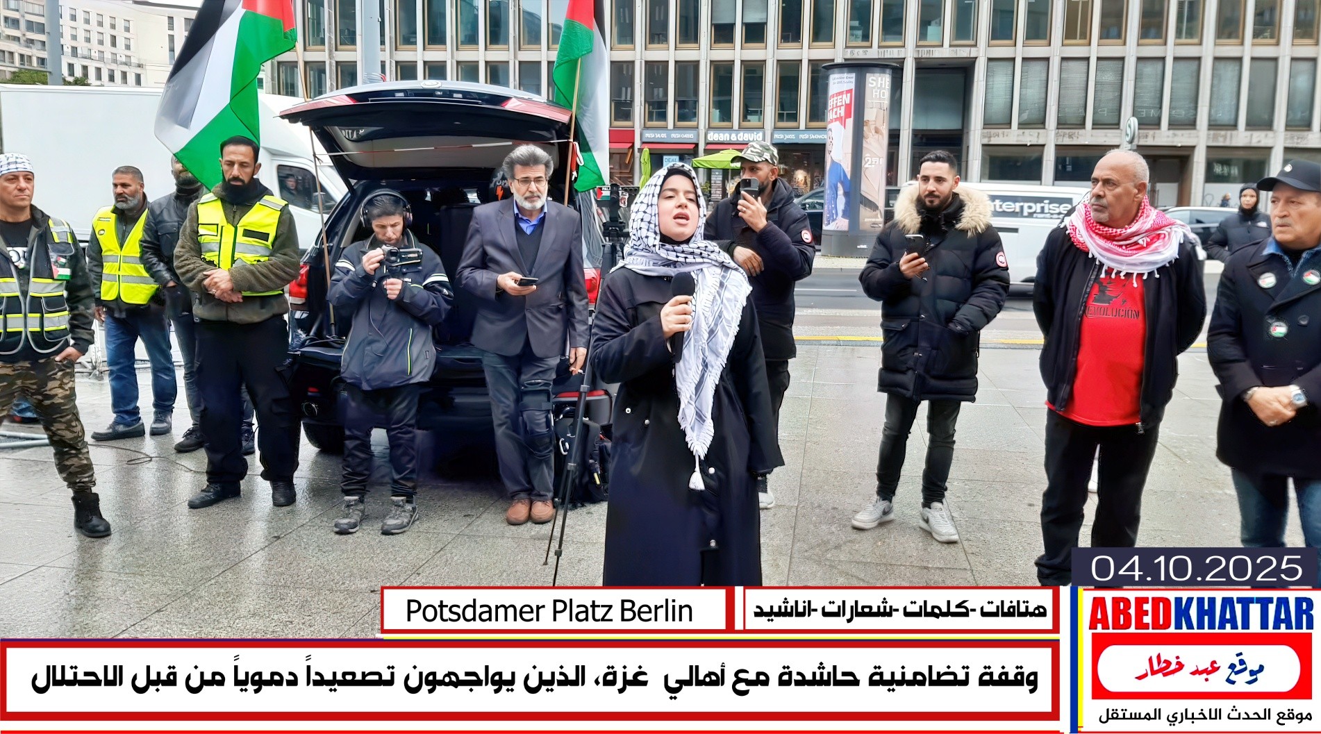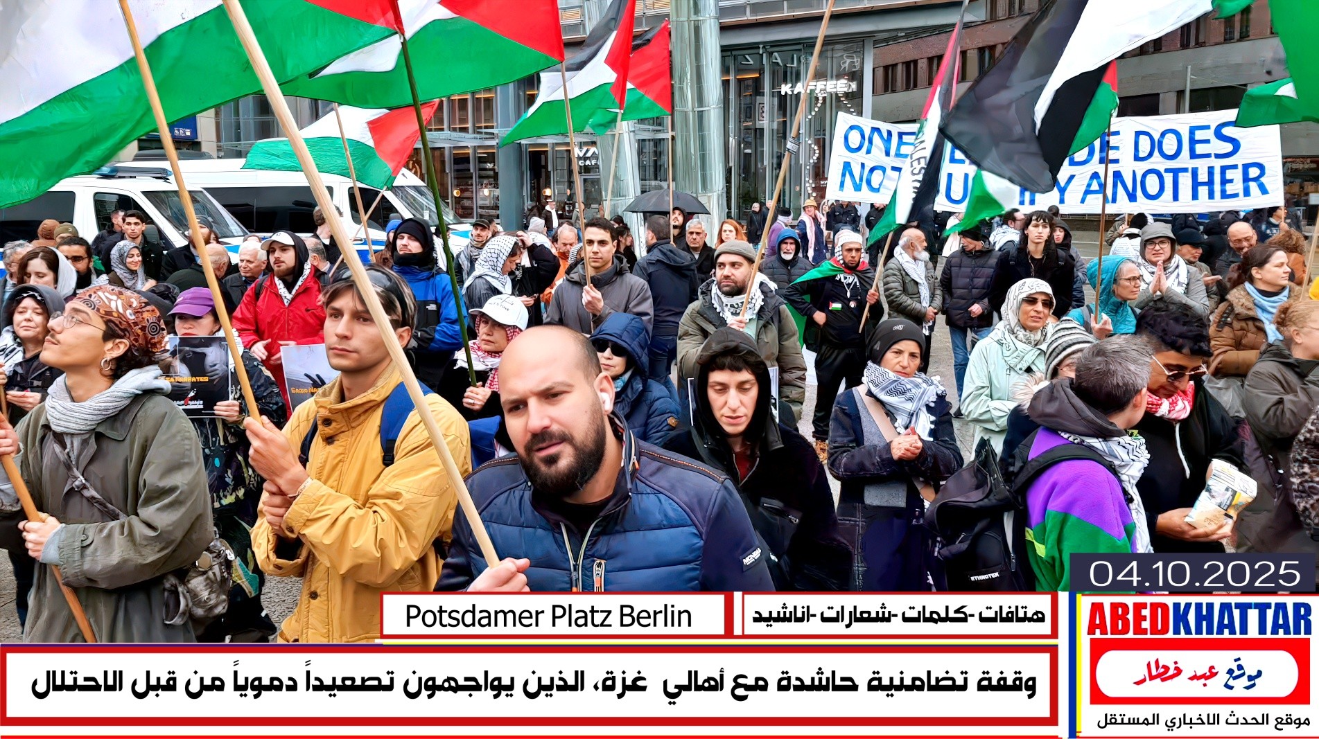 بدعوة من اللجنة الوطنية الفلسطينية الموحدة في برلين ، وقفة تضامنية حاشدة مع أهالي غزة، الذين يواجهون تصعيداً دموياً من قبل الاحتلال الصهيوني في ساحة البوسدامربلاتس