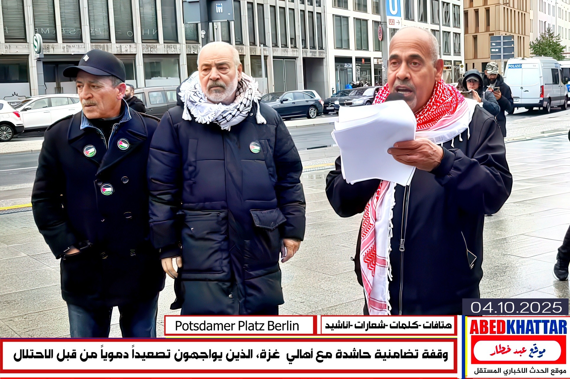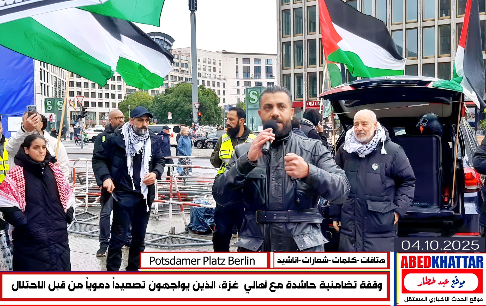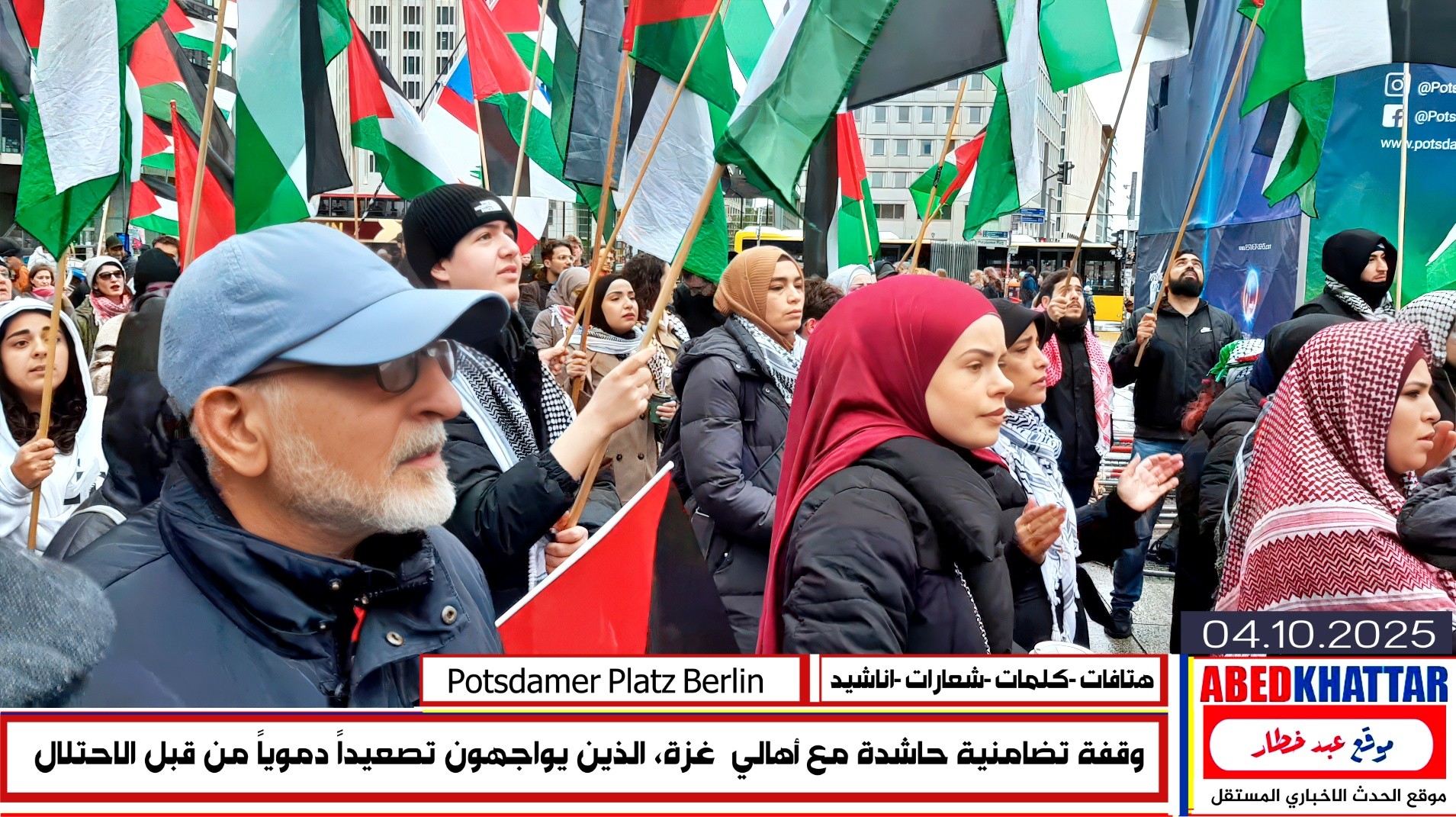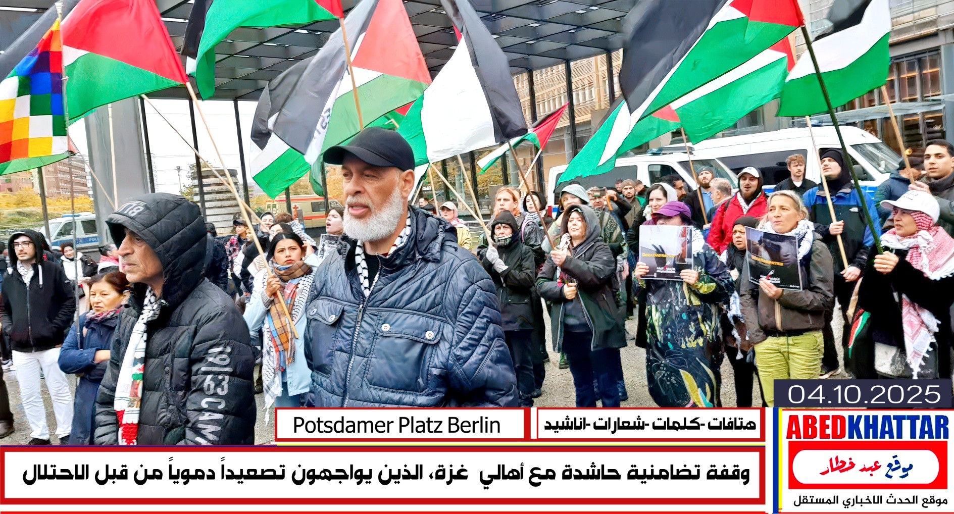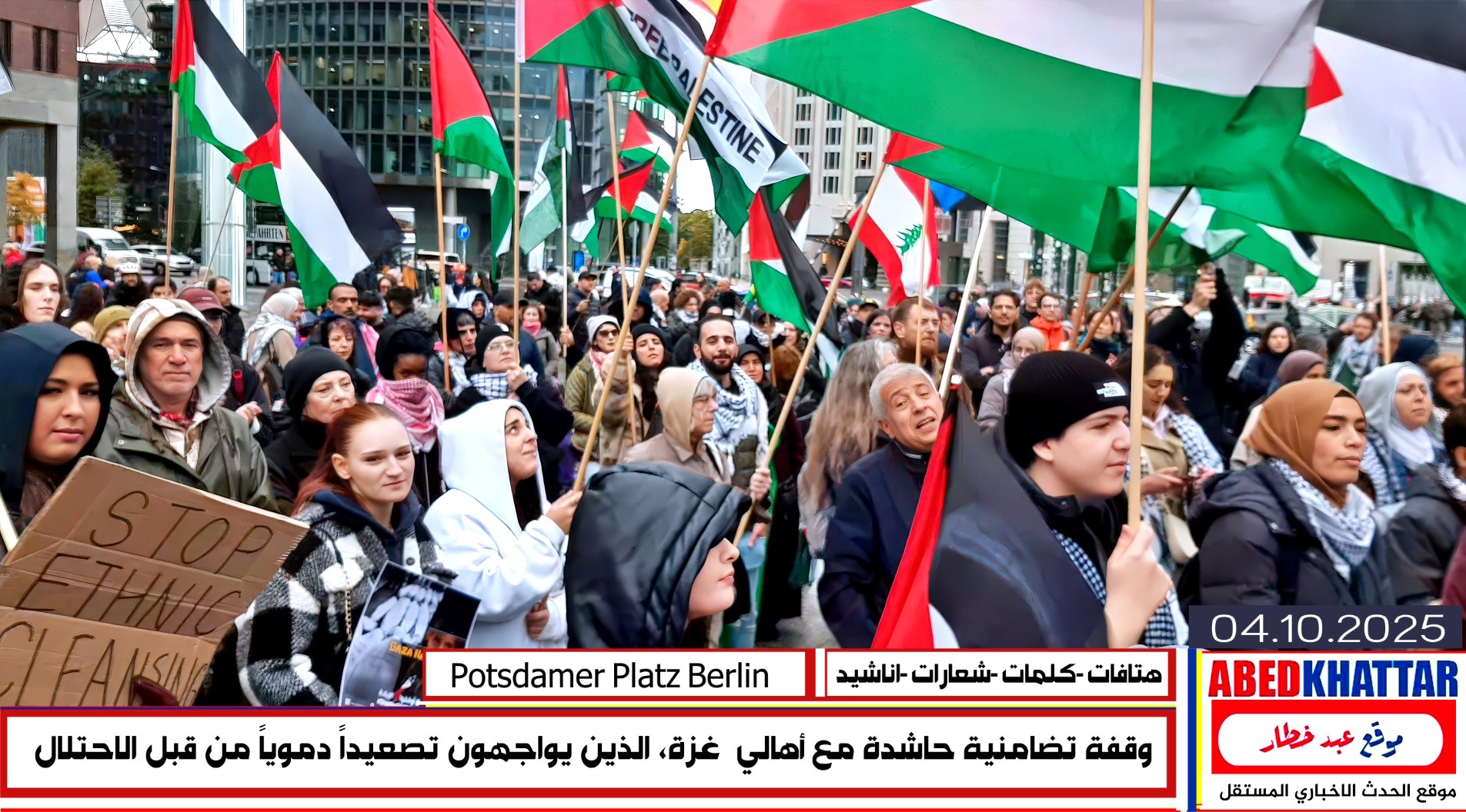 بدعوة من اللجنة الوطنية الفلسطينية الموحدة في برلين ، وقفة تضامنية حاشدة مع أهالي غزة، الذين يواجهون تصعيداً دموياً من قبل الاحتلال الصهيوني في ساحة البوسدامربلاتس