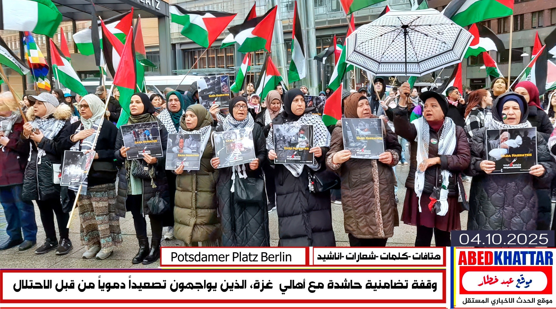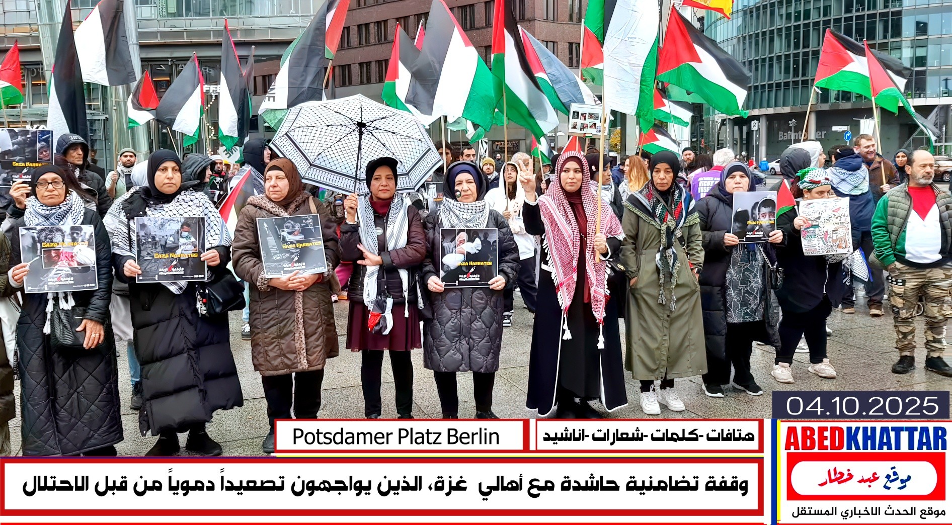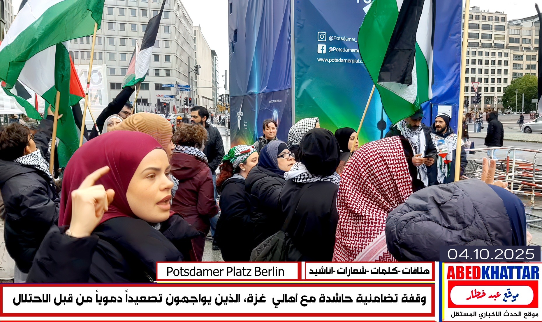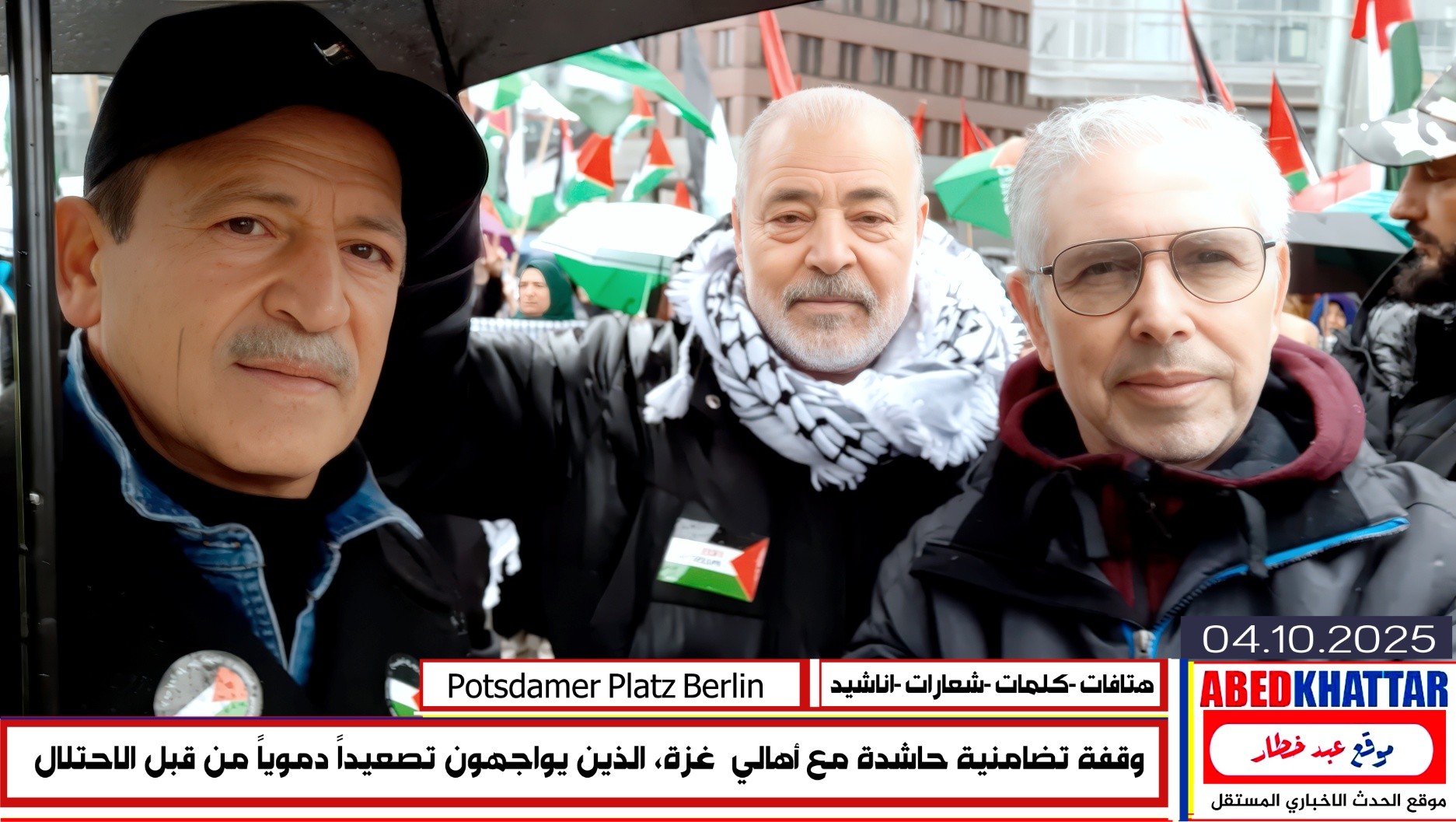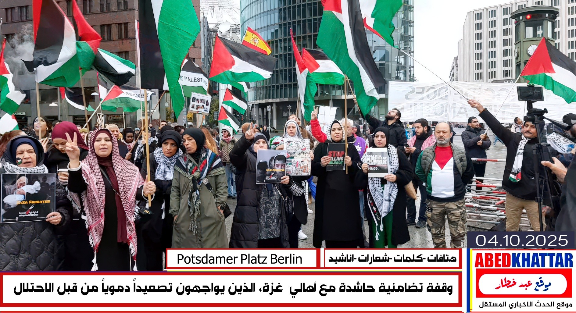 بدعوة من اللجنة الوطنية الفلسطينية الموحدة في برلين ، وقفة تضامنية حاشدة مع أهالي غزة، الذين يواجهون تصعيداً دموياً من قبل الاحتلال الصهيوني في ساحة البوسدامربلاتس
