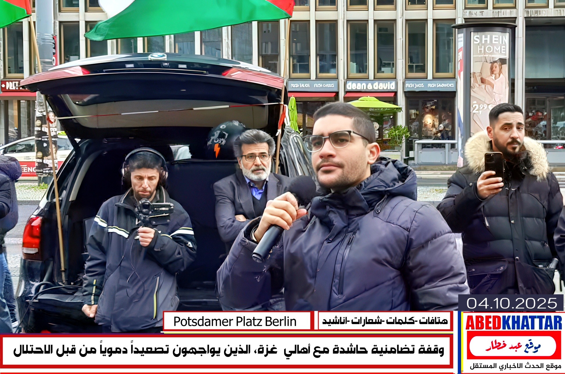بالفيديو والصور :وقفة تضامنية حاشدة مع أهالي غزة، الذين يواجهون تصعيداً دموياً من قبل الاحتلال الصهيوني في ساحة البوسدامربلاتس