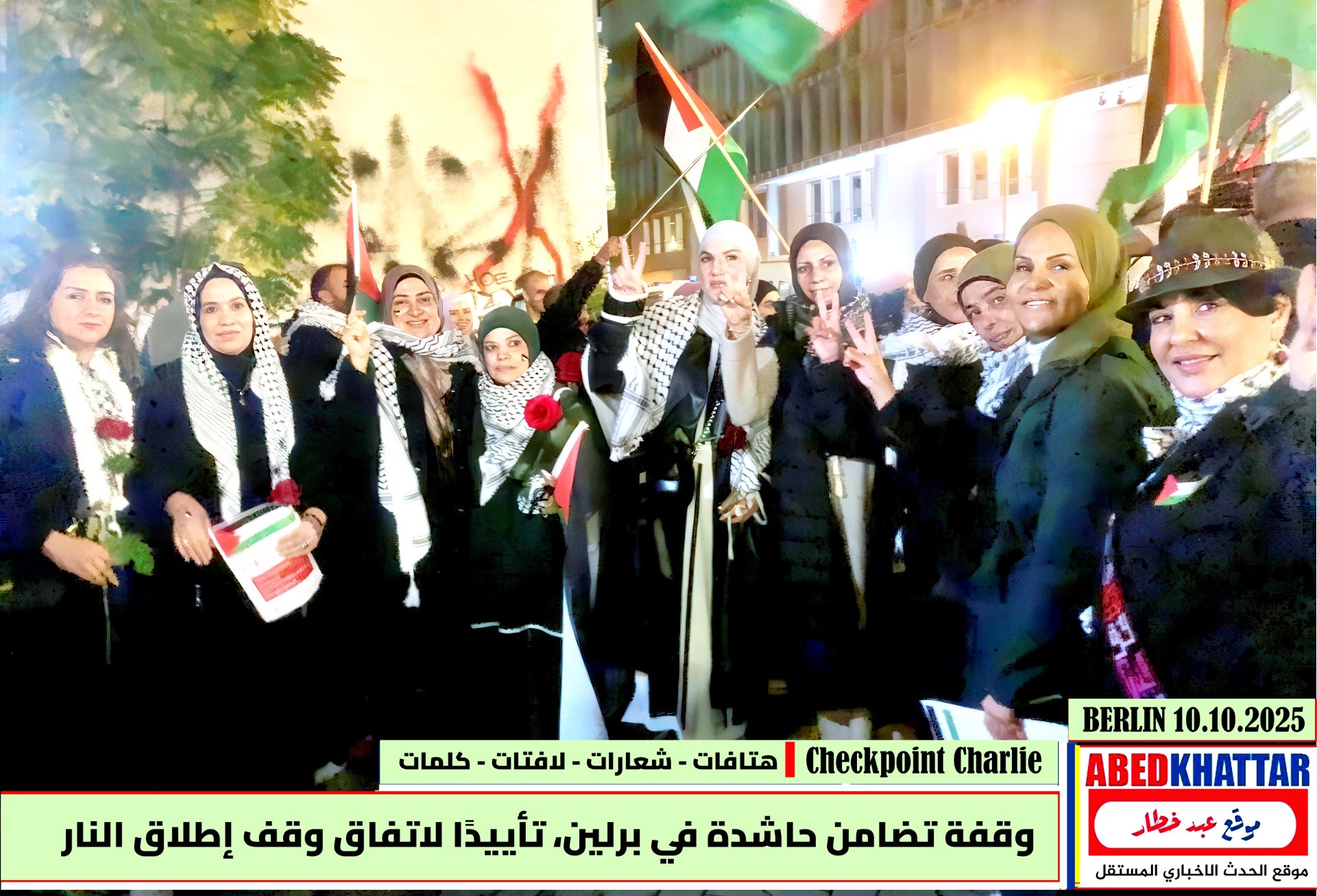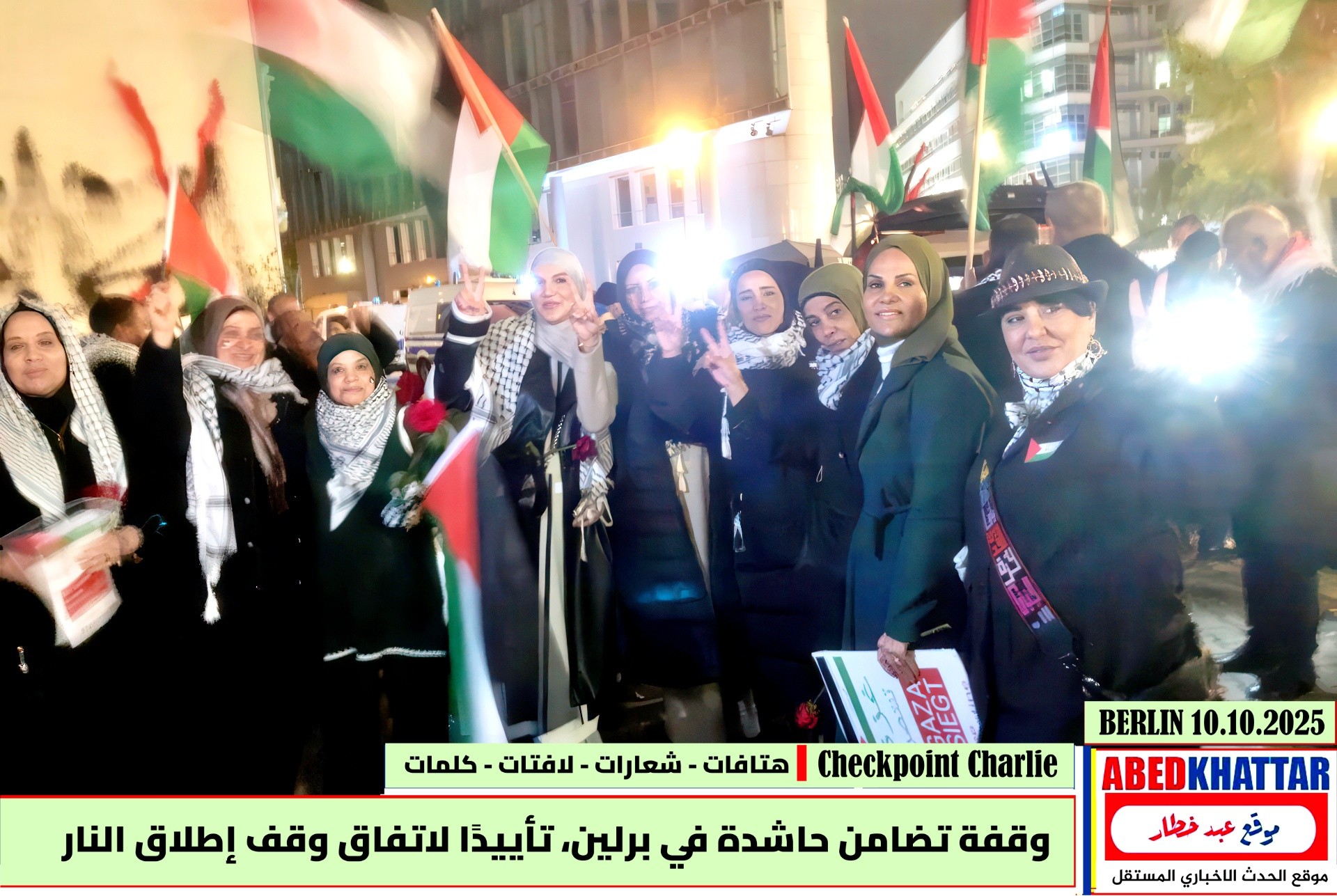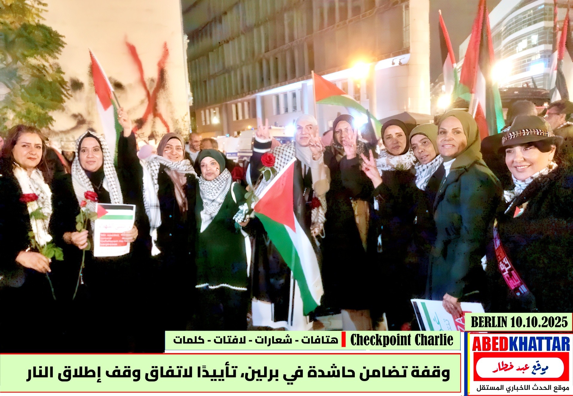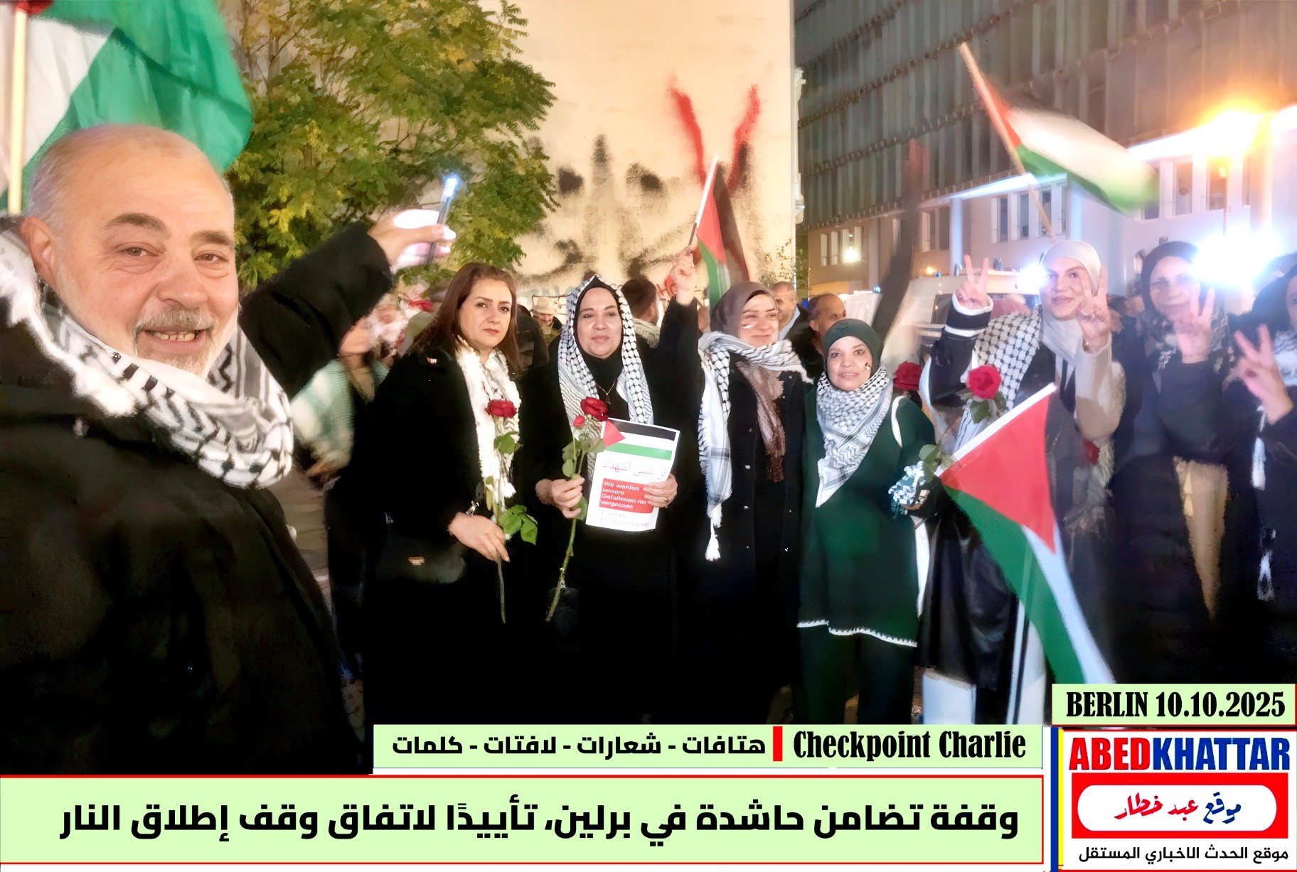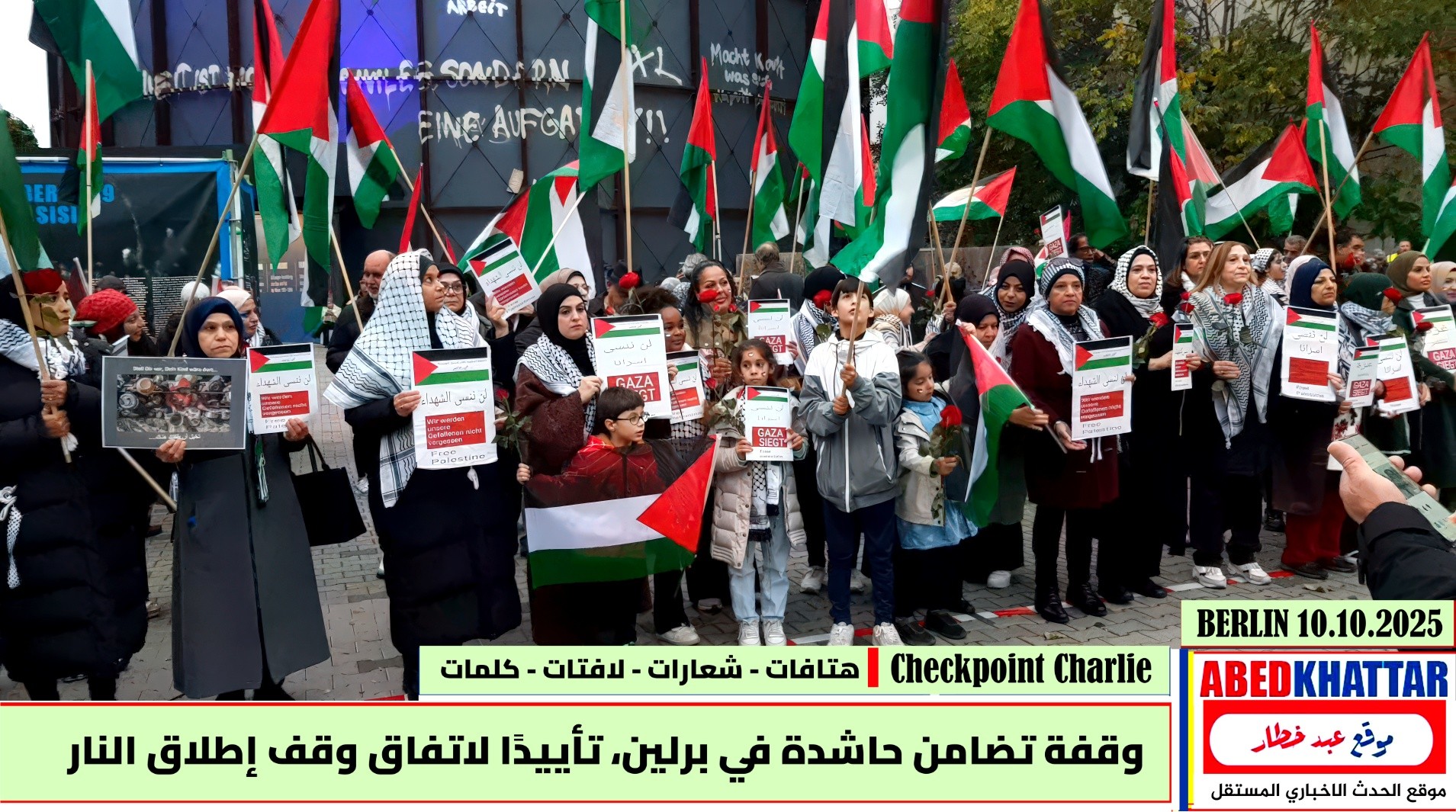 بالصور والفيديو:وقفة تضامن حاشدة في ساحةCheckpoint Charlie بدعوة من اللجنة الوطنية الفلسطينية الموحدة في برلين، تأييدًا لاتفاق وقف إطلاق النار في غزة