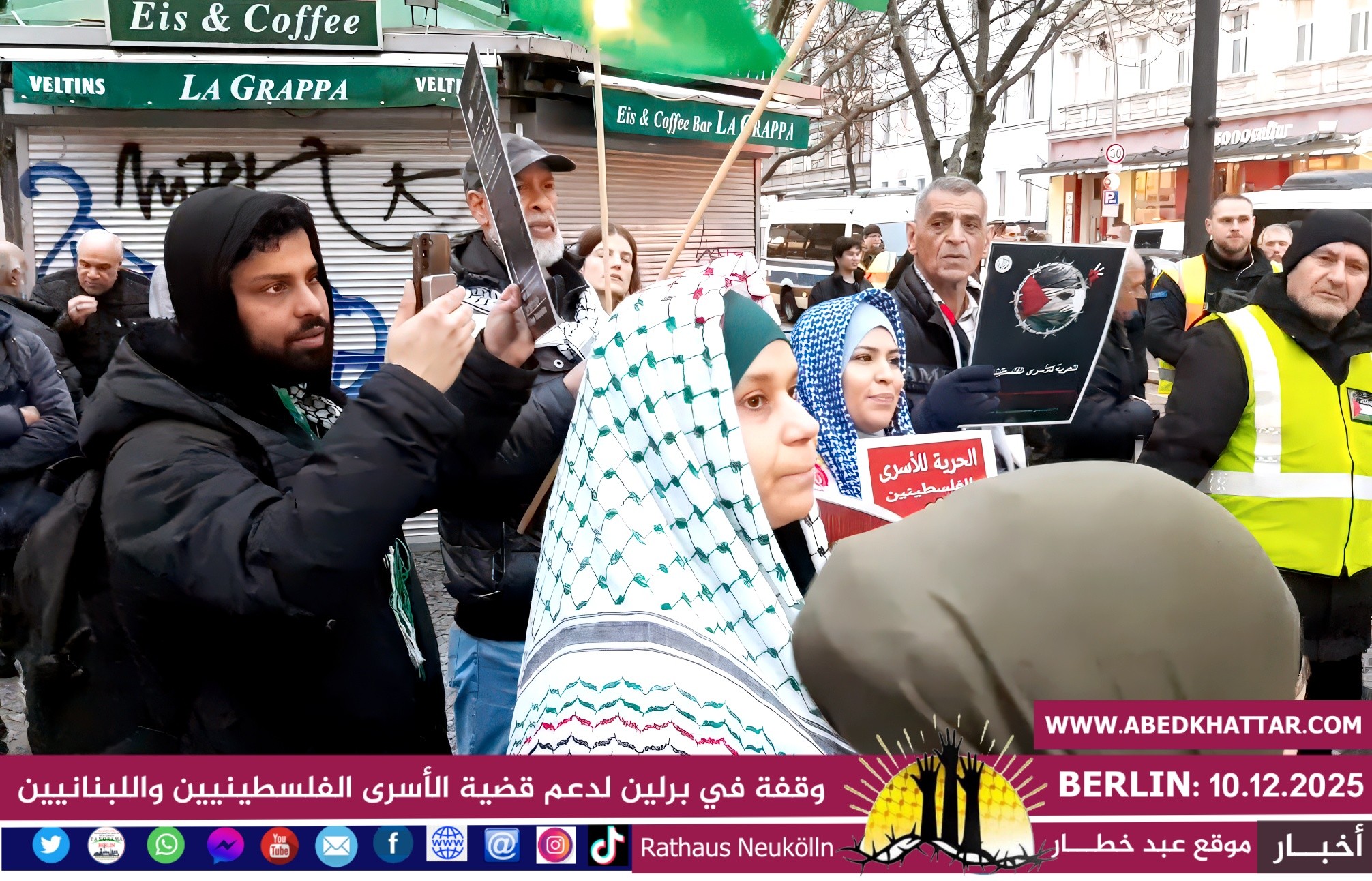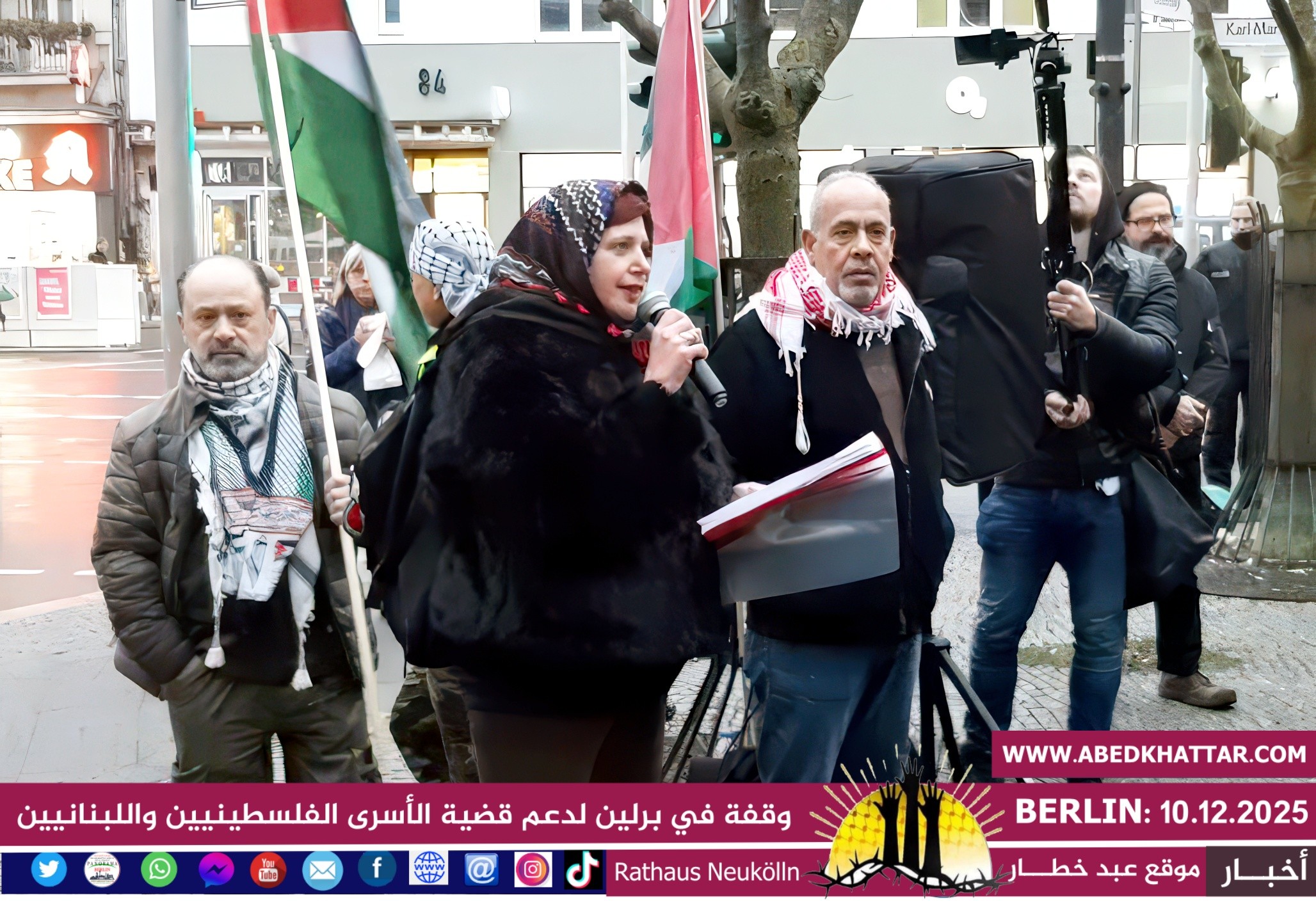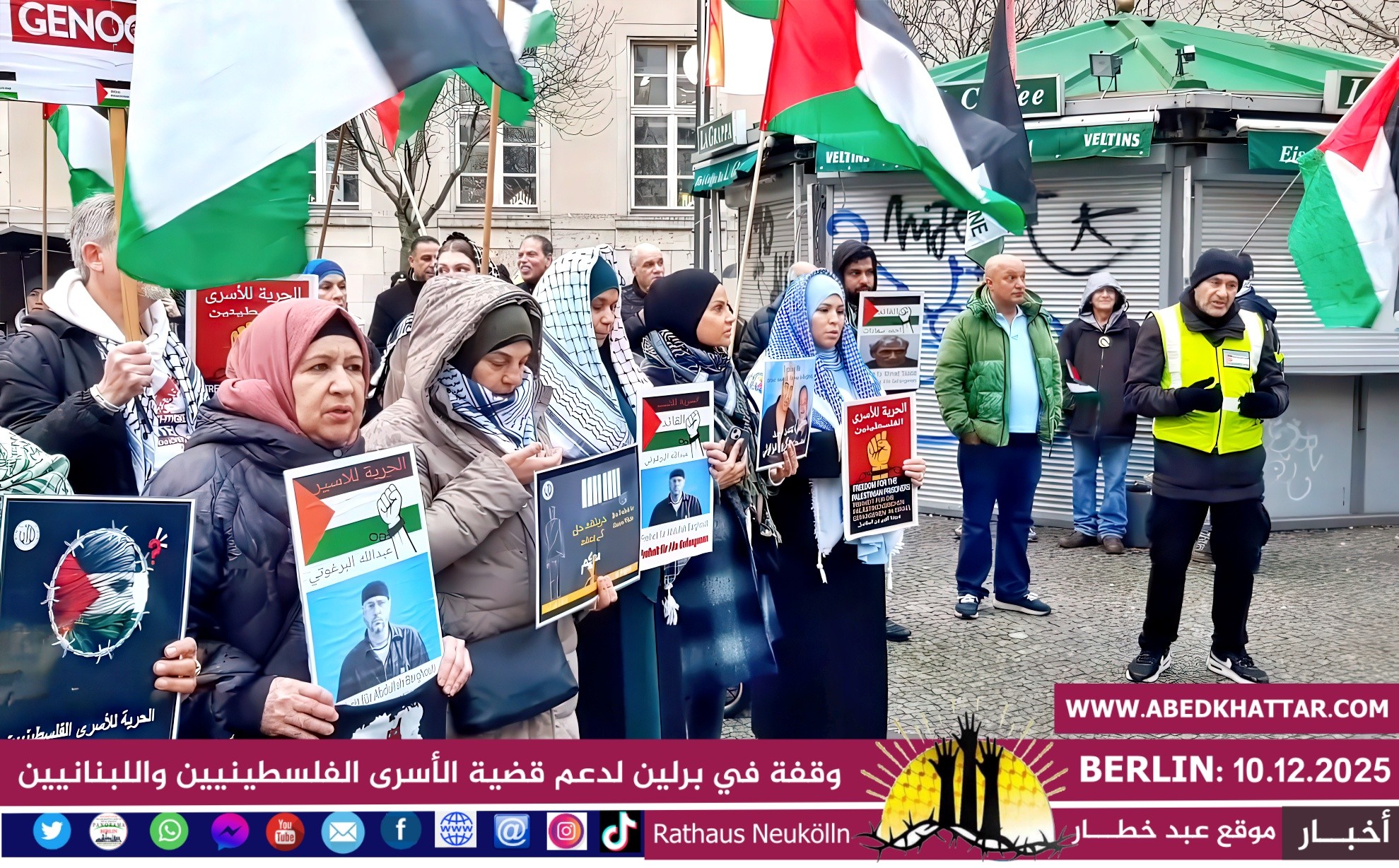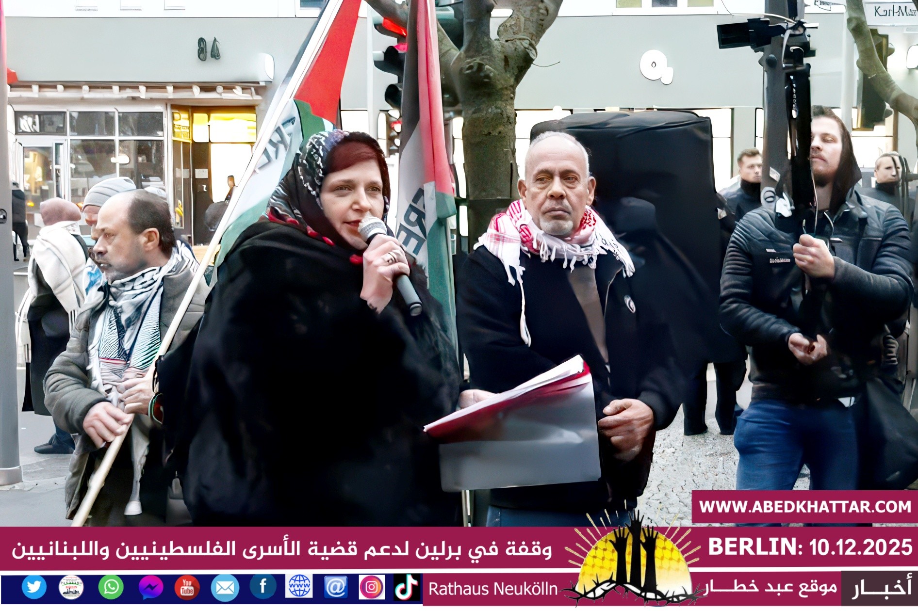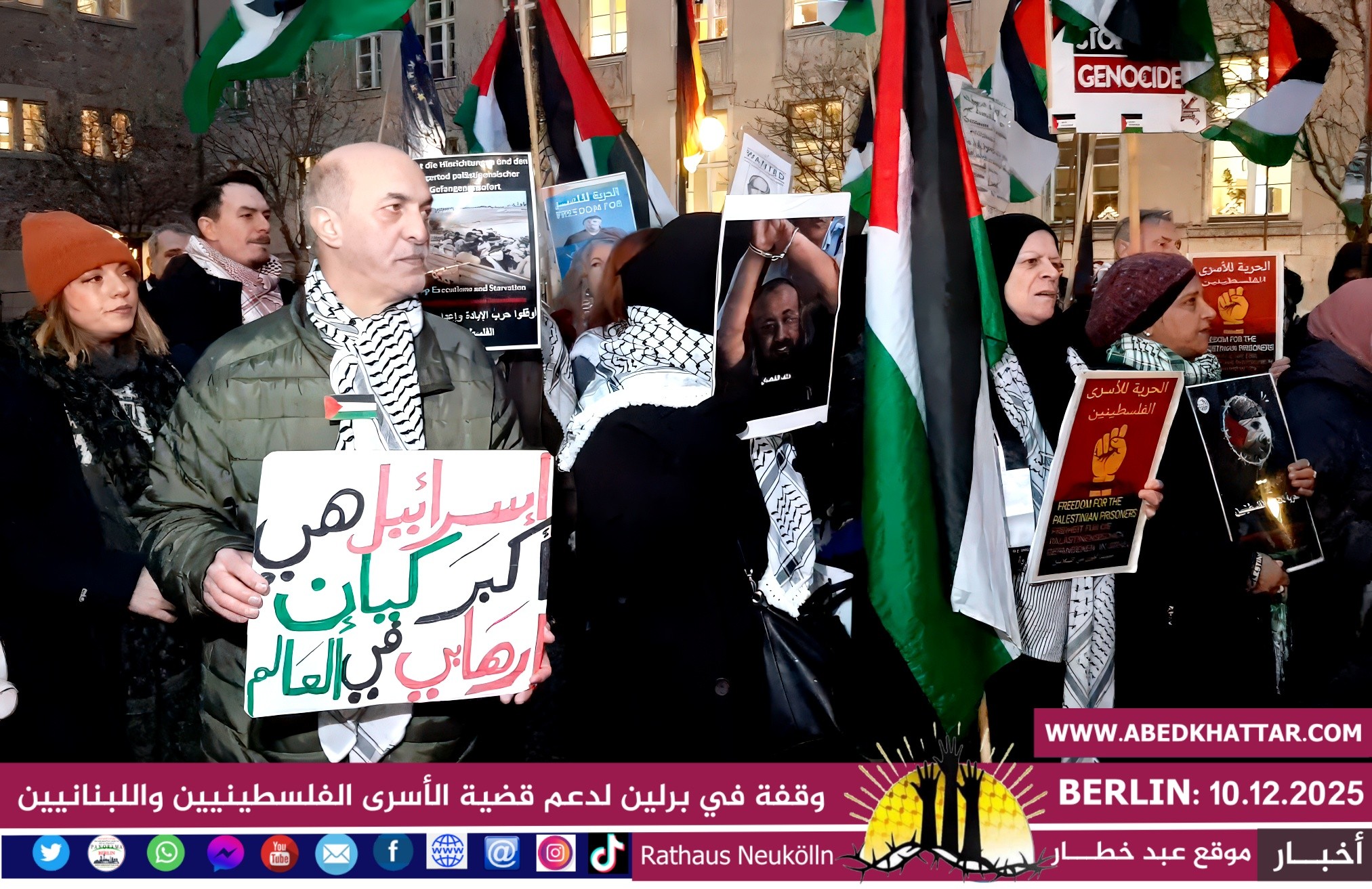 بدعوة من اللجنة الوطنية الفلسطينية في وقفة جماهيرية في برلين للتأكيد على دعم قضية الأسرى الفلسطينيين واللبنانيين، وعلى التضامن مع غزة والضفة الغربية والقدس في مواجهة العدوان المستمر