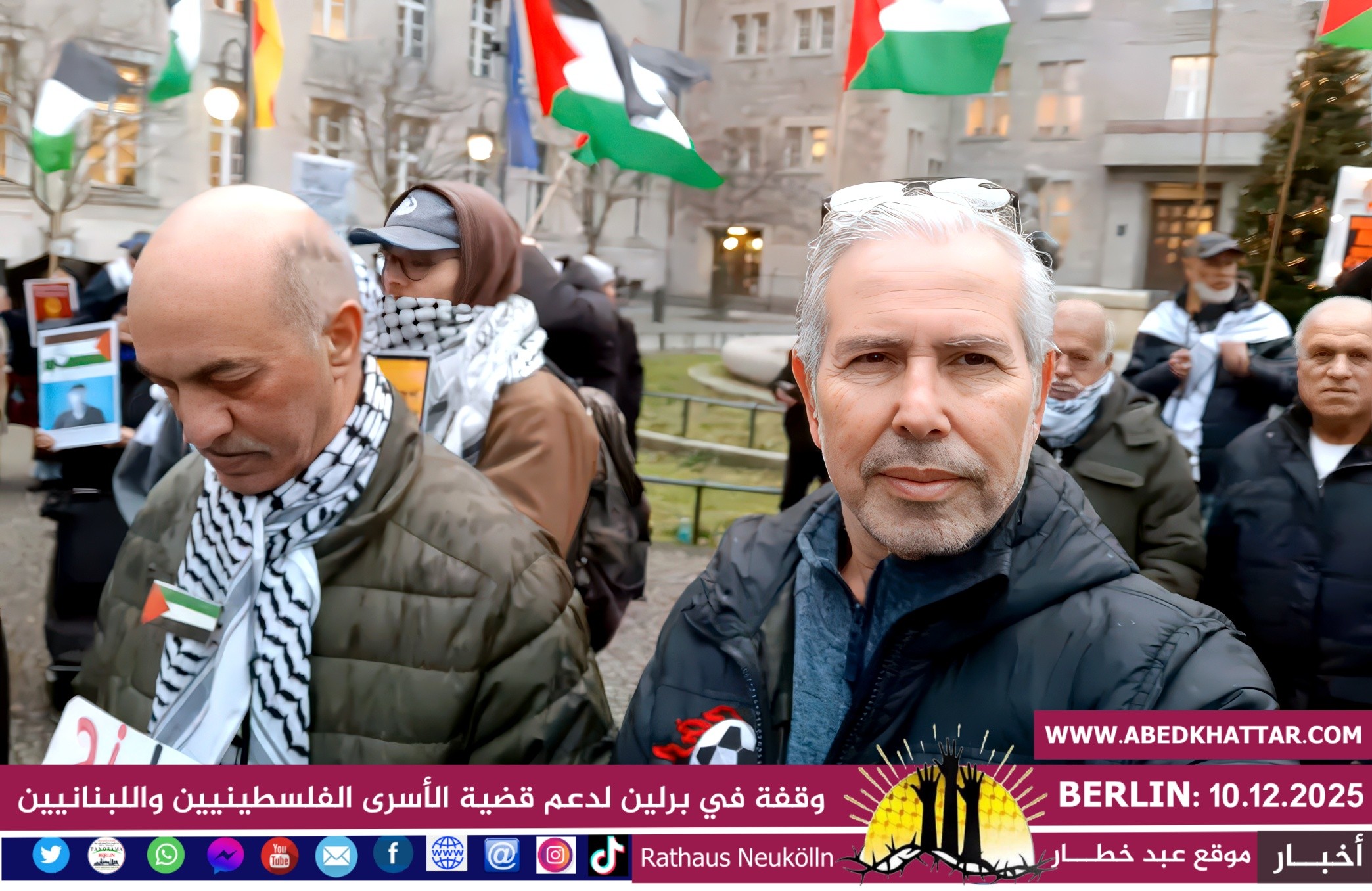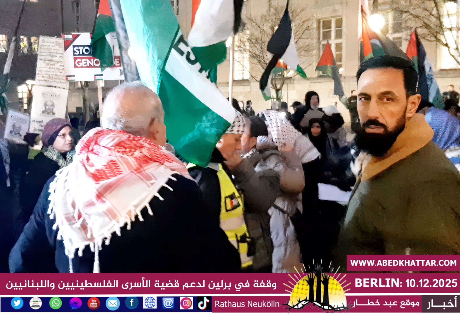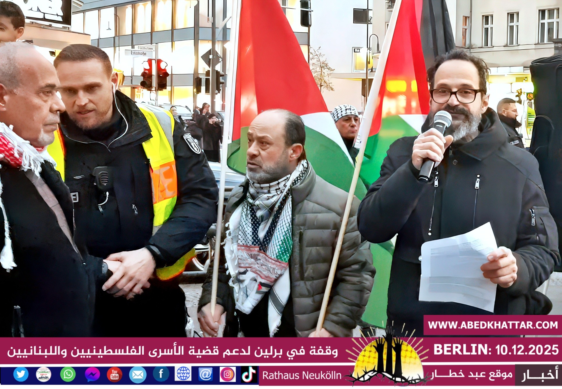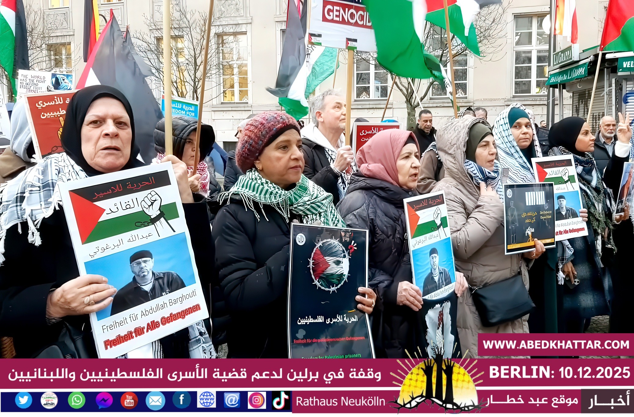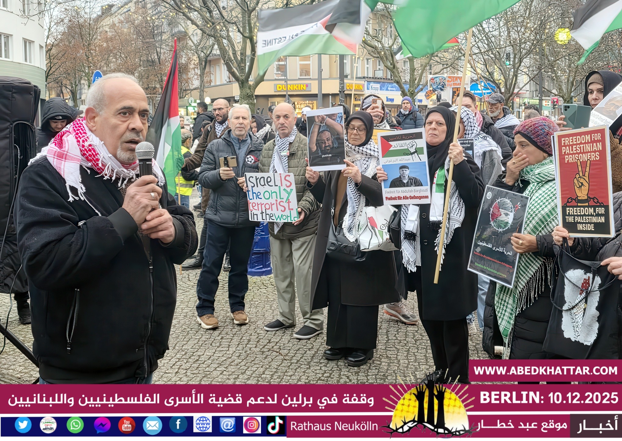 بدعوة من اللجنة الوطنية الفلسطينية في وقفة جماهيرية في برلين للتأكيد على دعم قضية الأسرى الفلسطينيين واللبنانيين، وعلى التضامن مع غزة والضفة الغربية والقدس في مواجهة العدوان المستمر