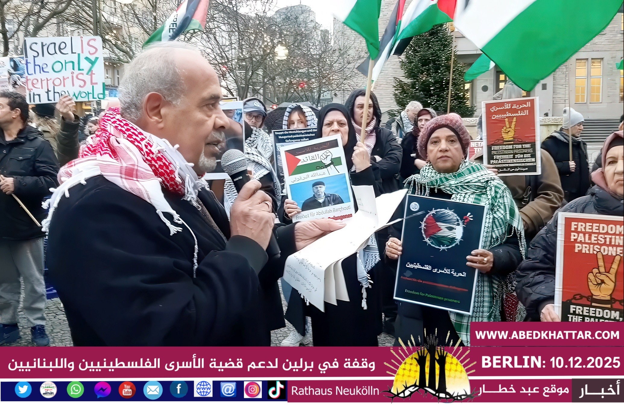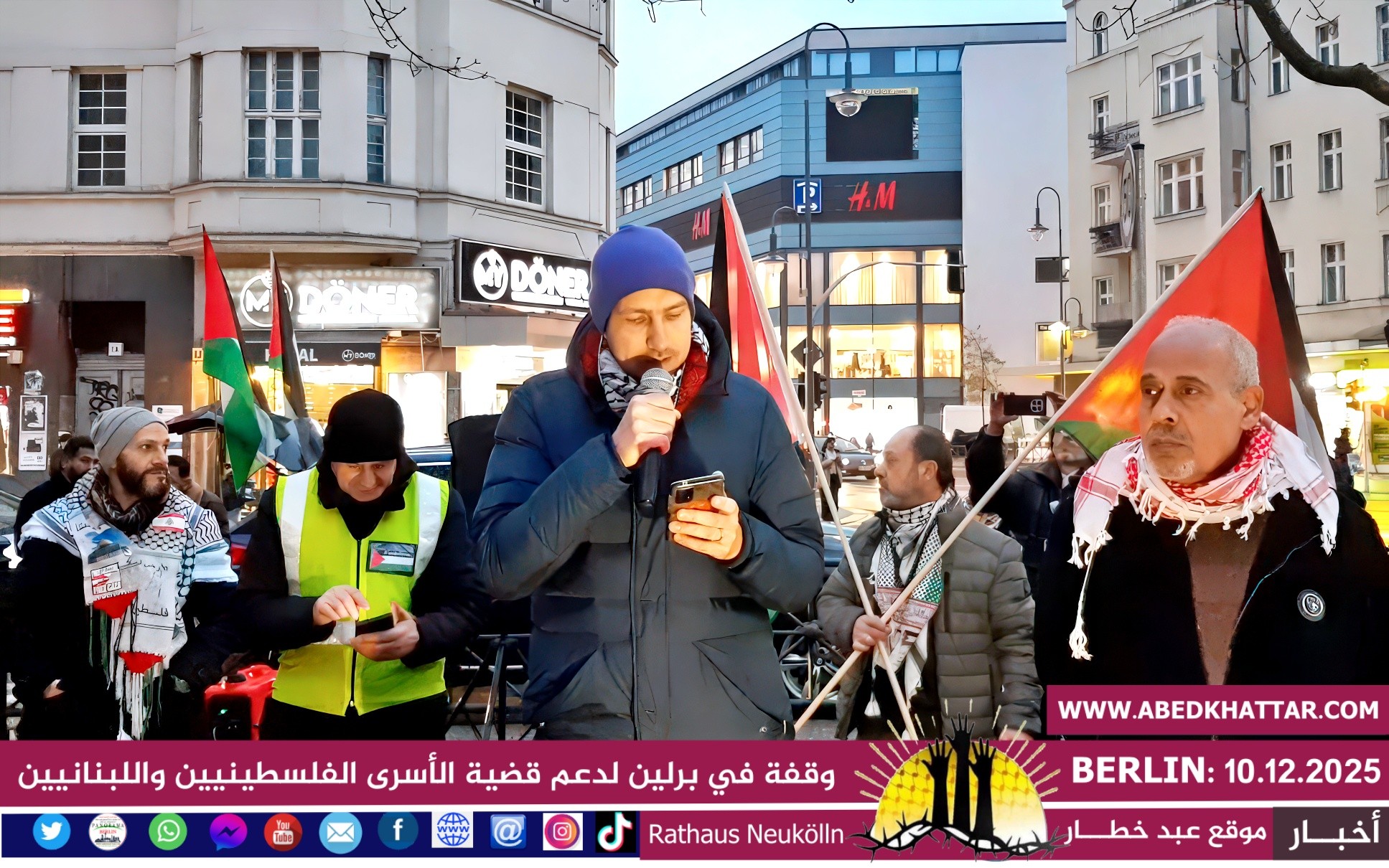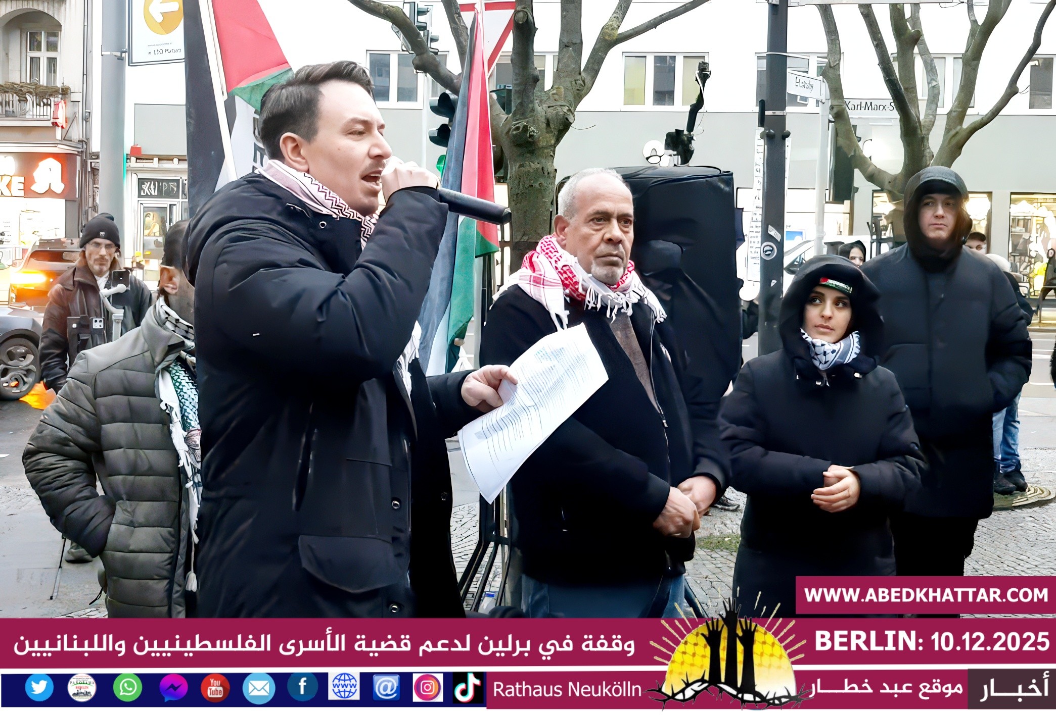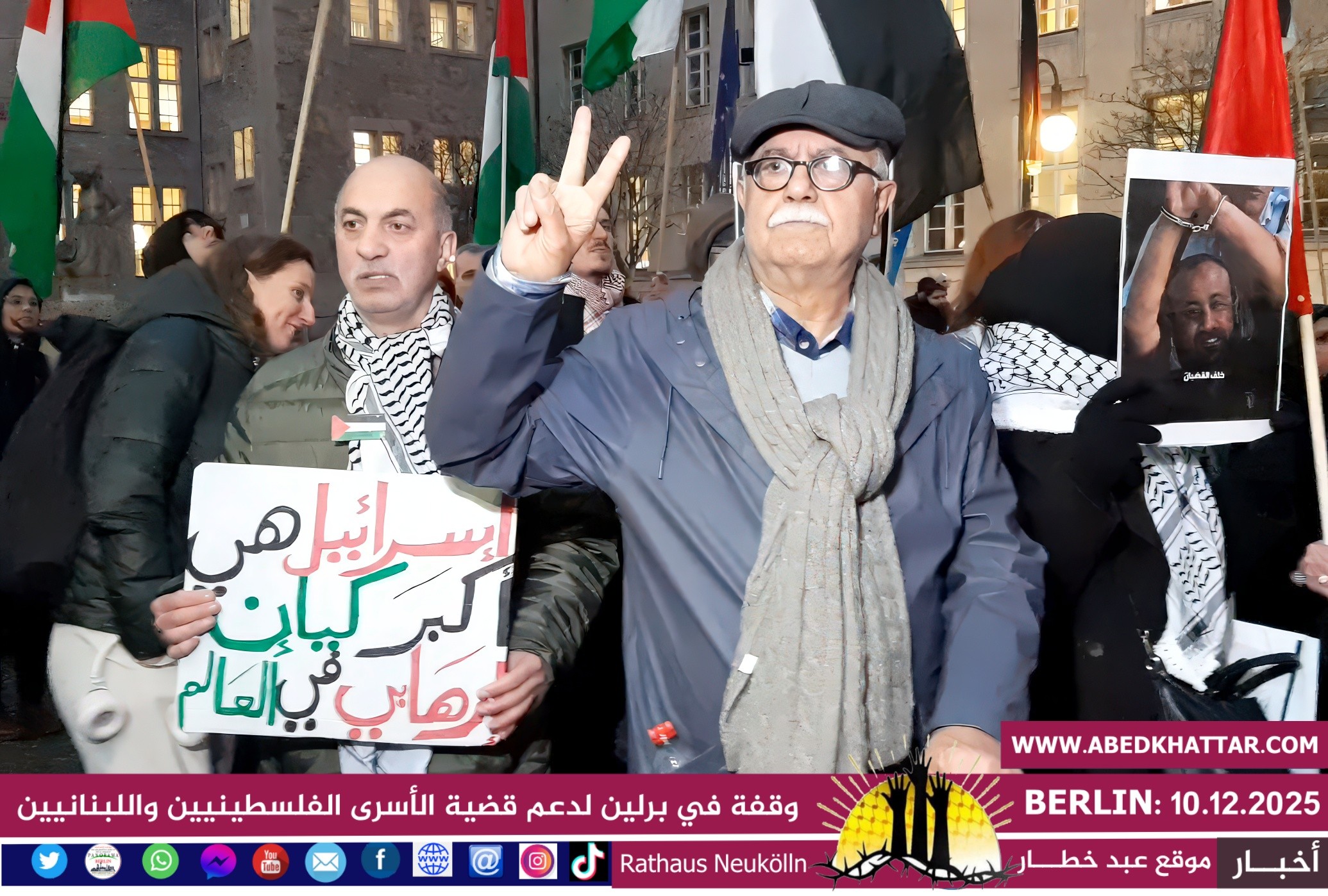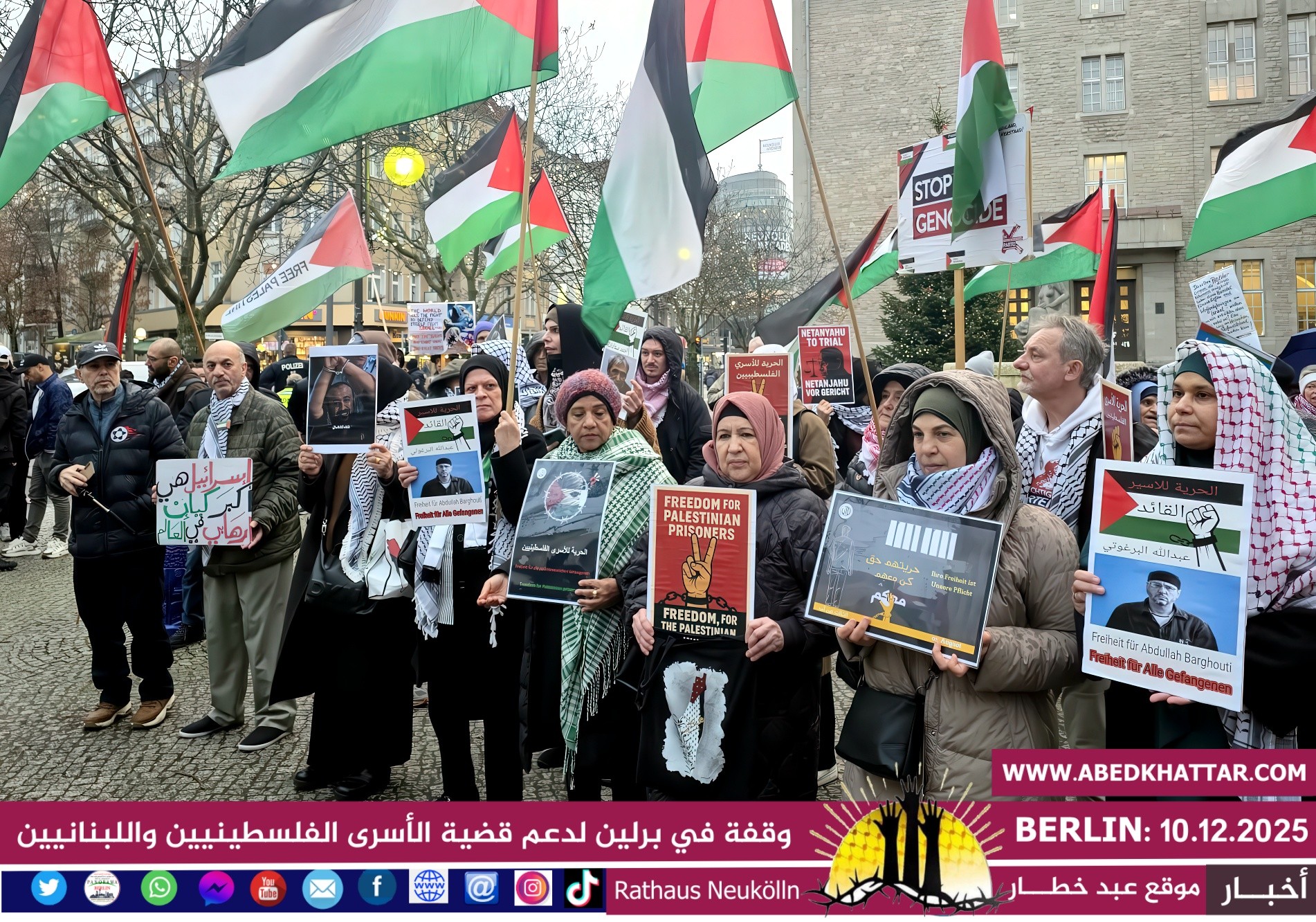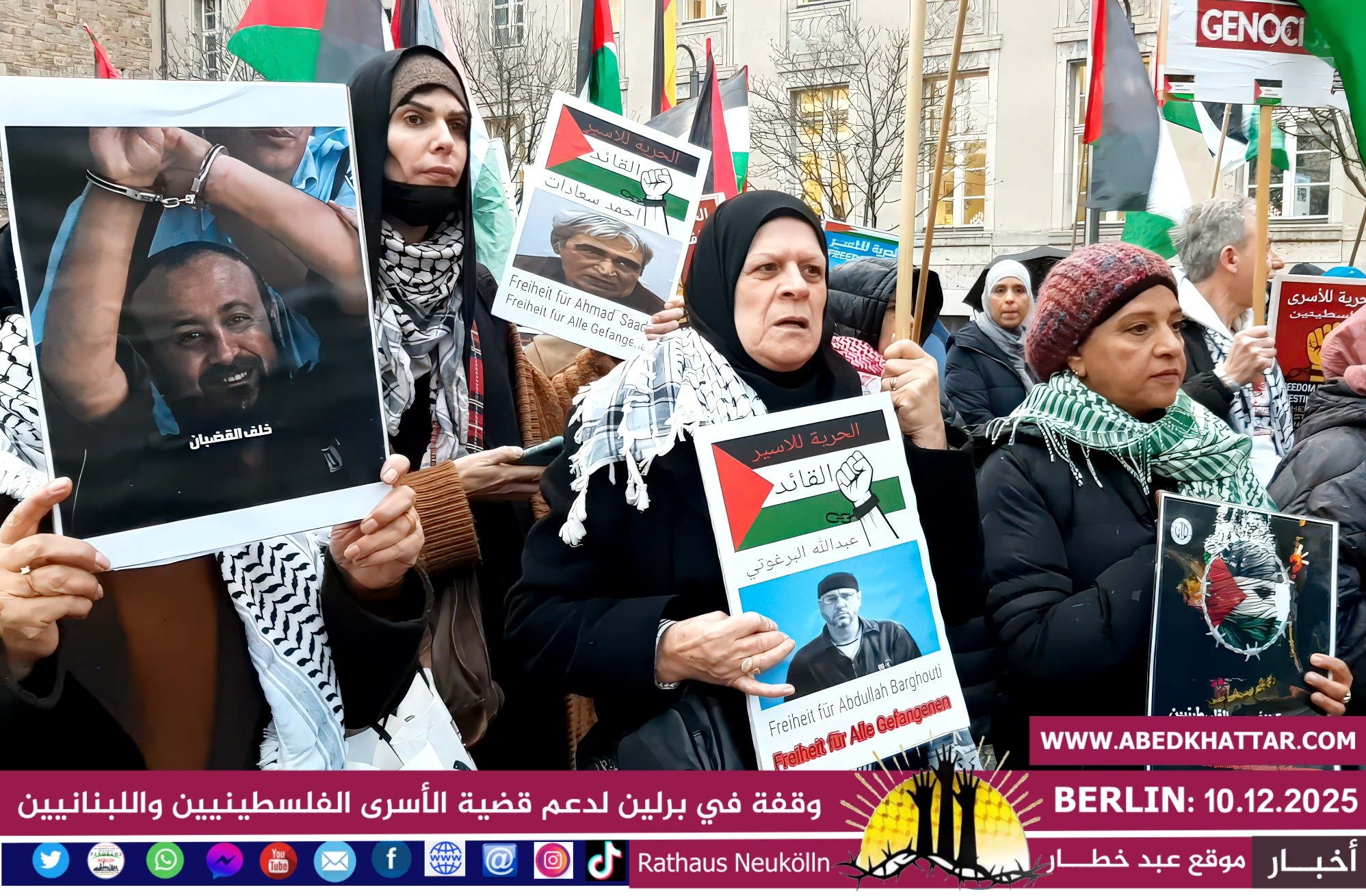 بدعوة من اللجنة الوطنية الفلسطينية في وقفة جماهيرية في برلين للتأكيد على دعم قضية الأسرى الفلسطينيين واللبنانيين، وعلى التضامن مع غزة والضفة الغربية والقدس في مواجهة العدوان المستمر