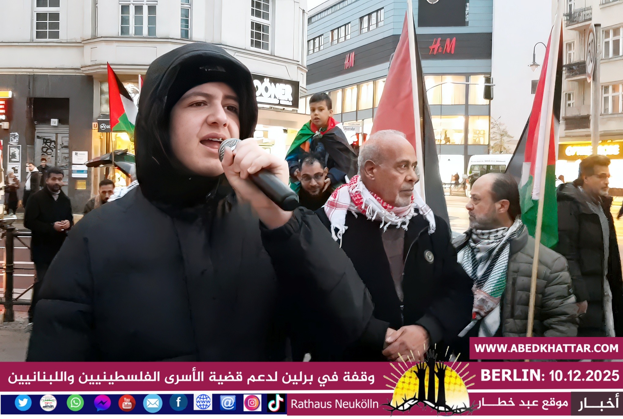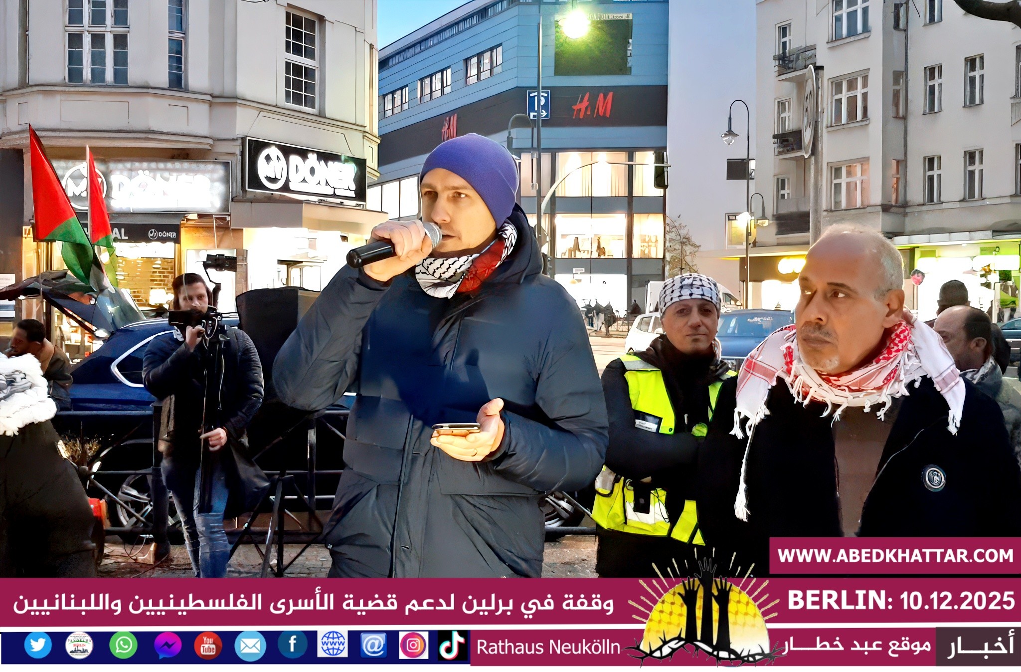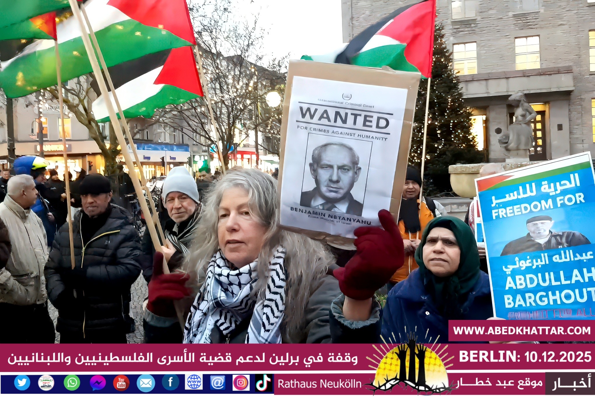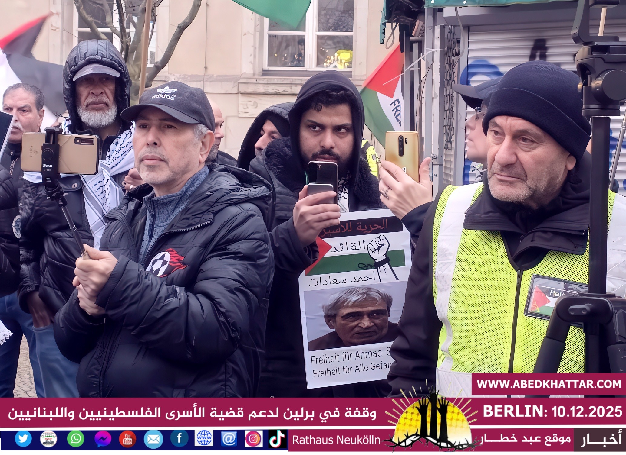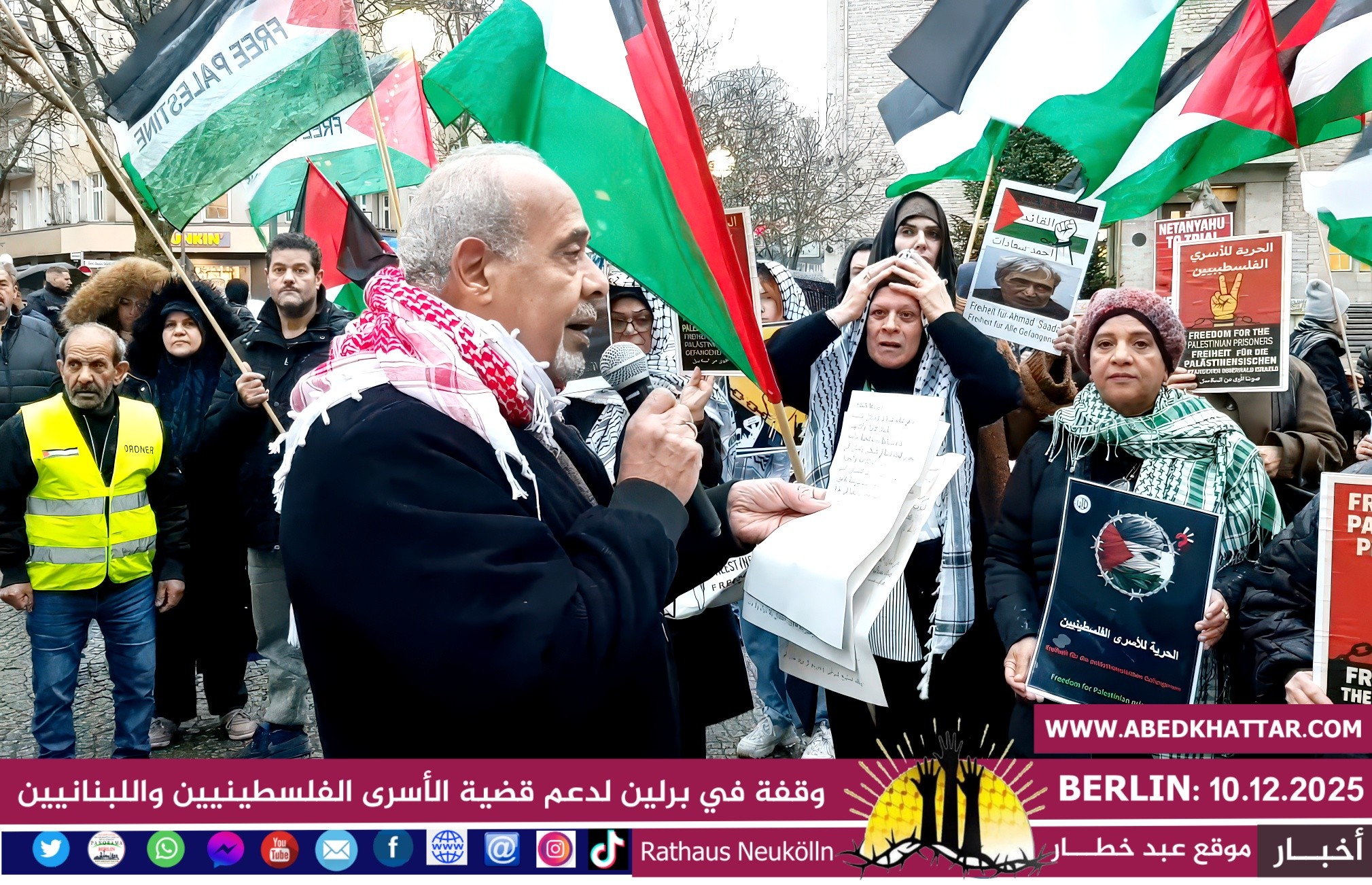 بدعوة من اللجنة الوطنية الفلسطينية في وقفة جماهيرية في برلين للتأكيد على دعم قضية الأسرى الفلسطينيين واللبنانيين، وعلى التضامن مع غزة والضفة الغربية والقدس في مواجهة العدوان المستمر