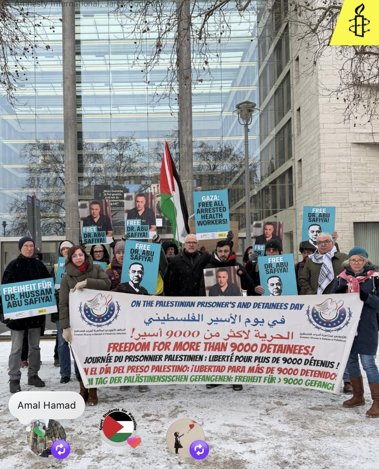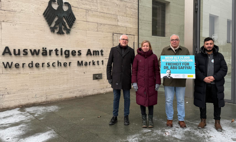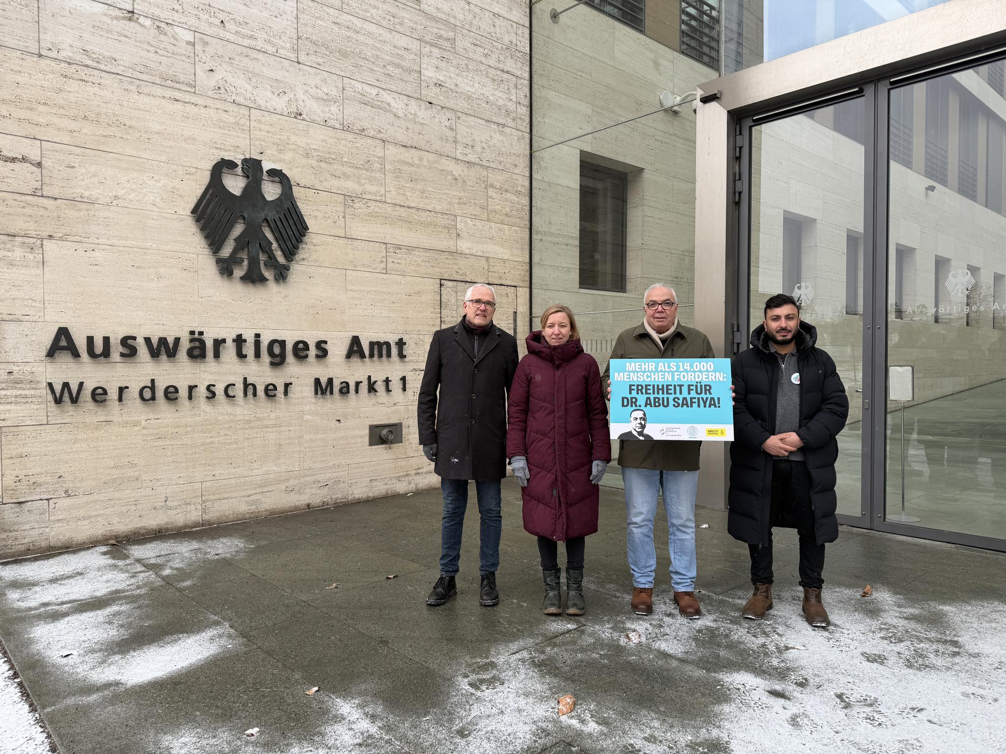 سلّم وفد حقوقي وطبي إلى وزارة الخارجية الألمانية في برلين يوم 16/2/ 2026عريضة موقعة من أكثر من 15 ألف شخص، مطالبًا بالتحرك العاجل للإفراج عن الطبيب الفلسطيني الدكتور حسام أبو صفية وعدد من العاملين في القطاع الصحي المعتقلين في قطاع غزة.