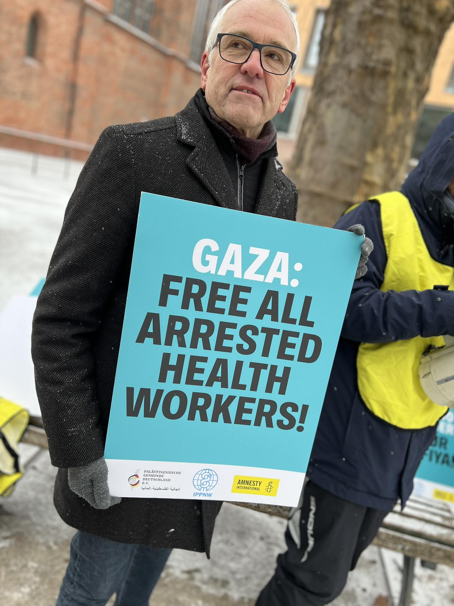 وضم الوفد كاتيا مولر-فايلبوش (متحدثة الشرق الأوسط في منظمة العفو الدولية ألمانيا) والدكتور أوفي ترشمان (IPPNW) والدكتور خالد حمد (الجالية الفلسطينية في ألمانيا) وباسم سعيد (الجالية الفلسطينية في برلين)، حيث استقبلهم ممثل قسم الشرق الأوسط في الوزارة السيد ويلمس.