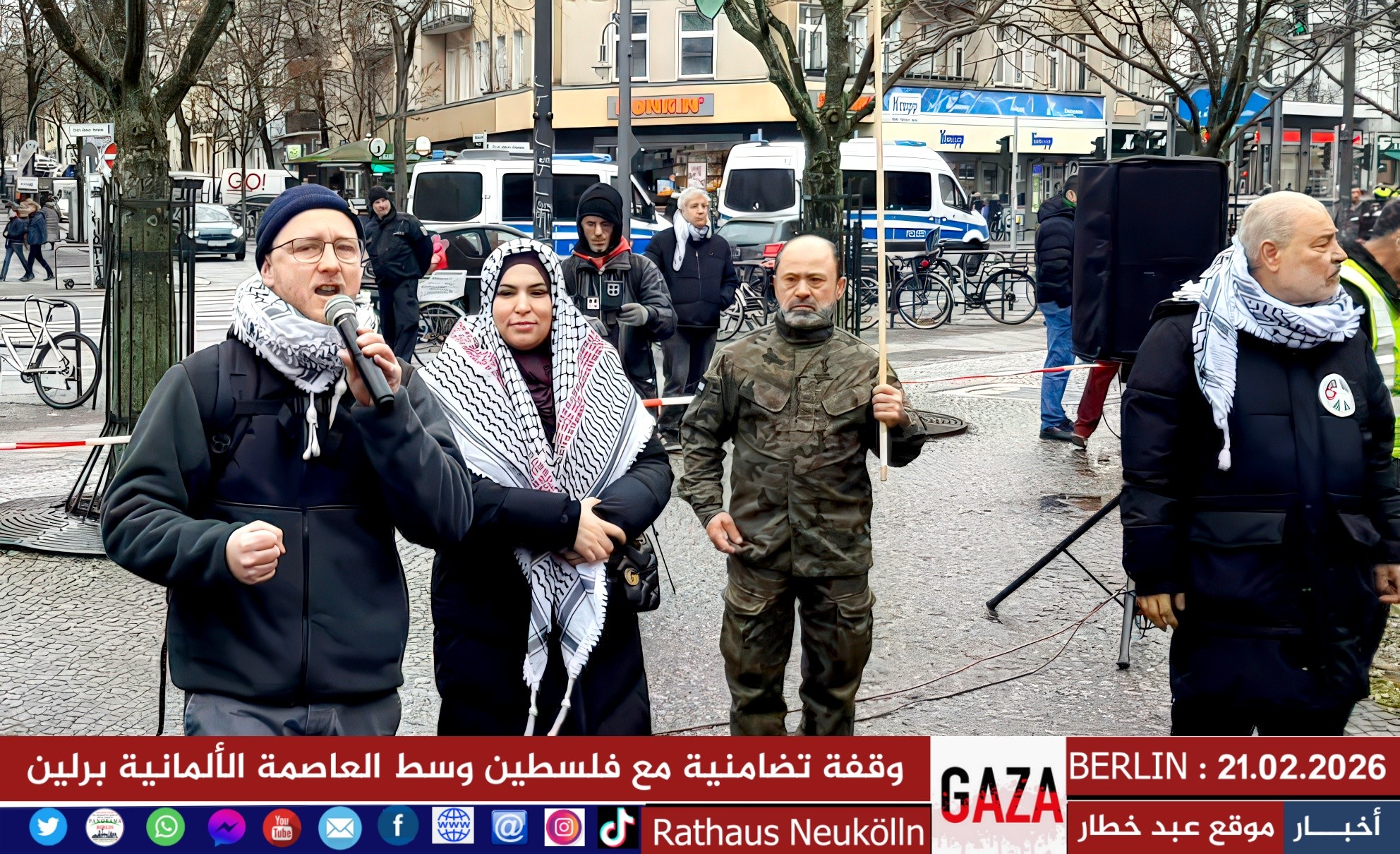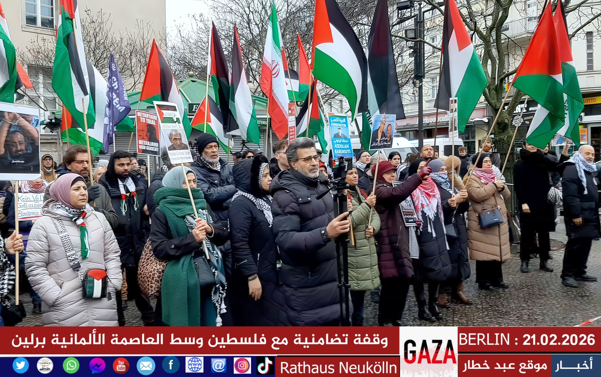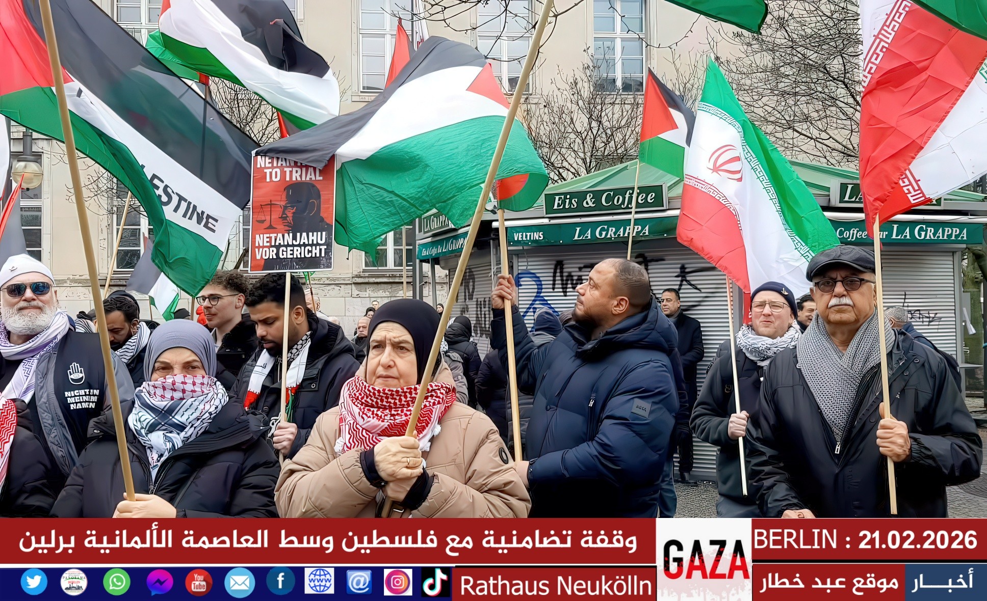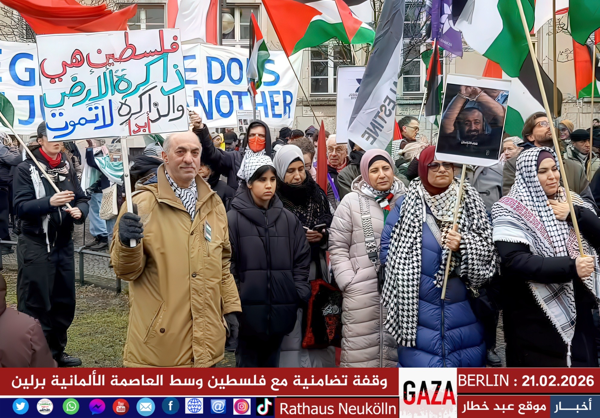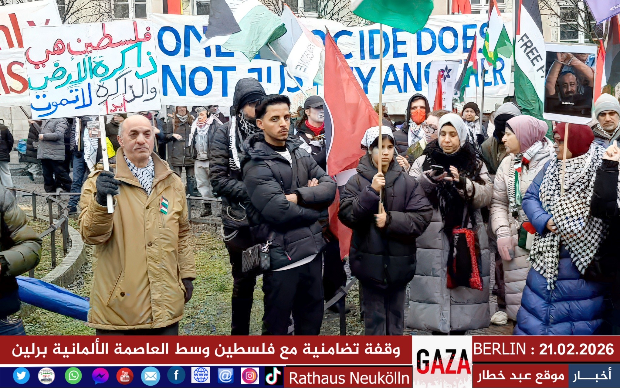 بدعوة من اللجنة الوطنية الفلسطينية الموحدة في برلين، نُظّمت يوم السبت الموافق 21 شباط/فبراير 2026 وقفة تضامن مع فلسطين وغزة