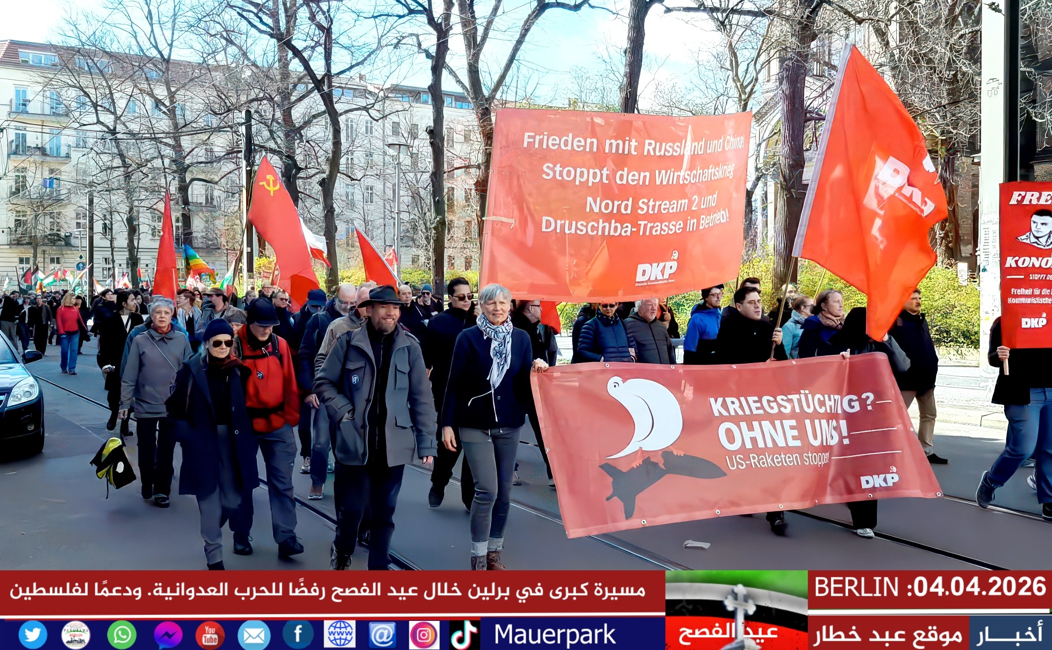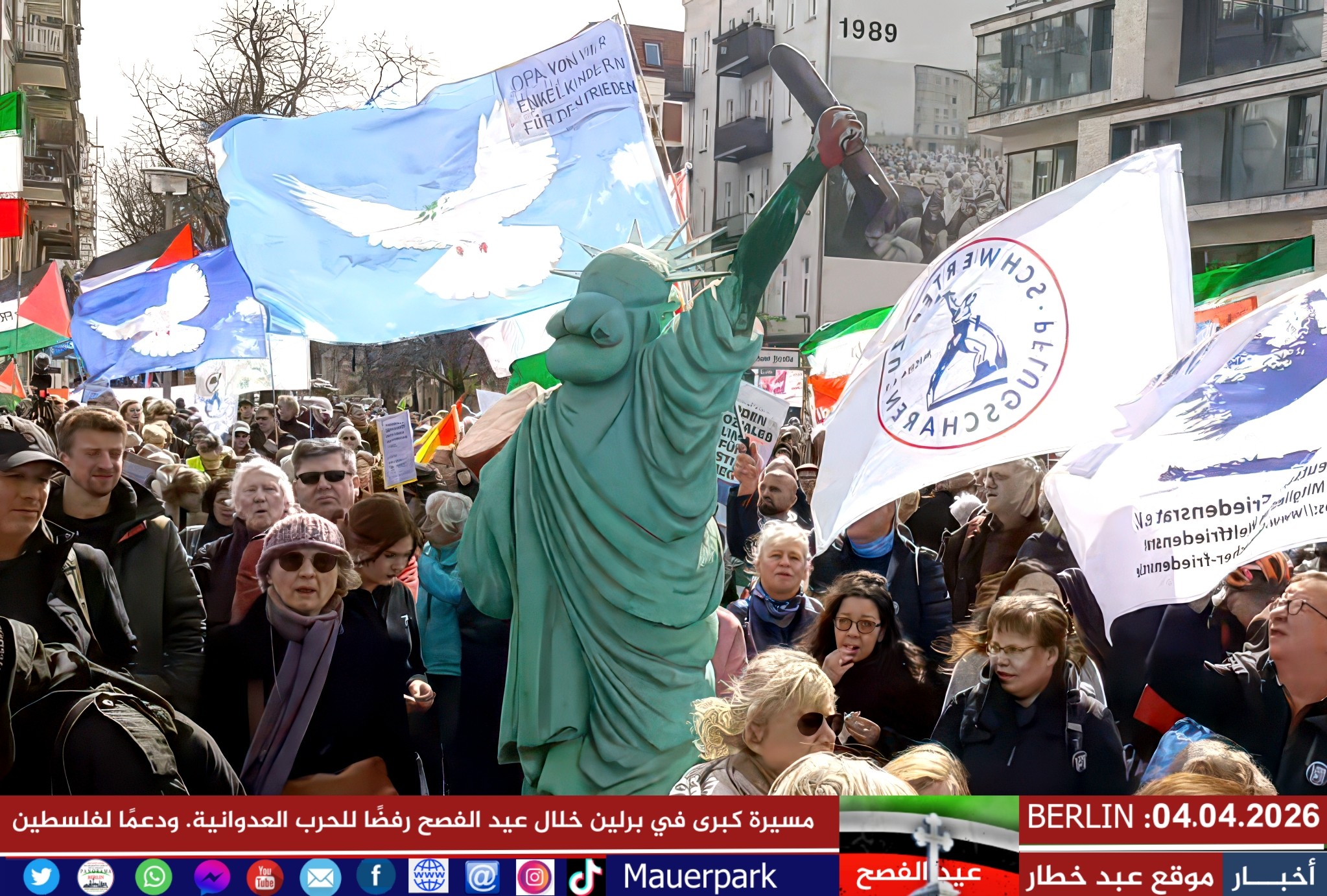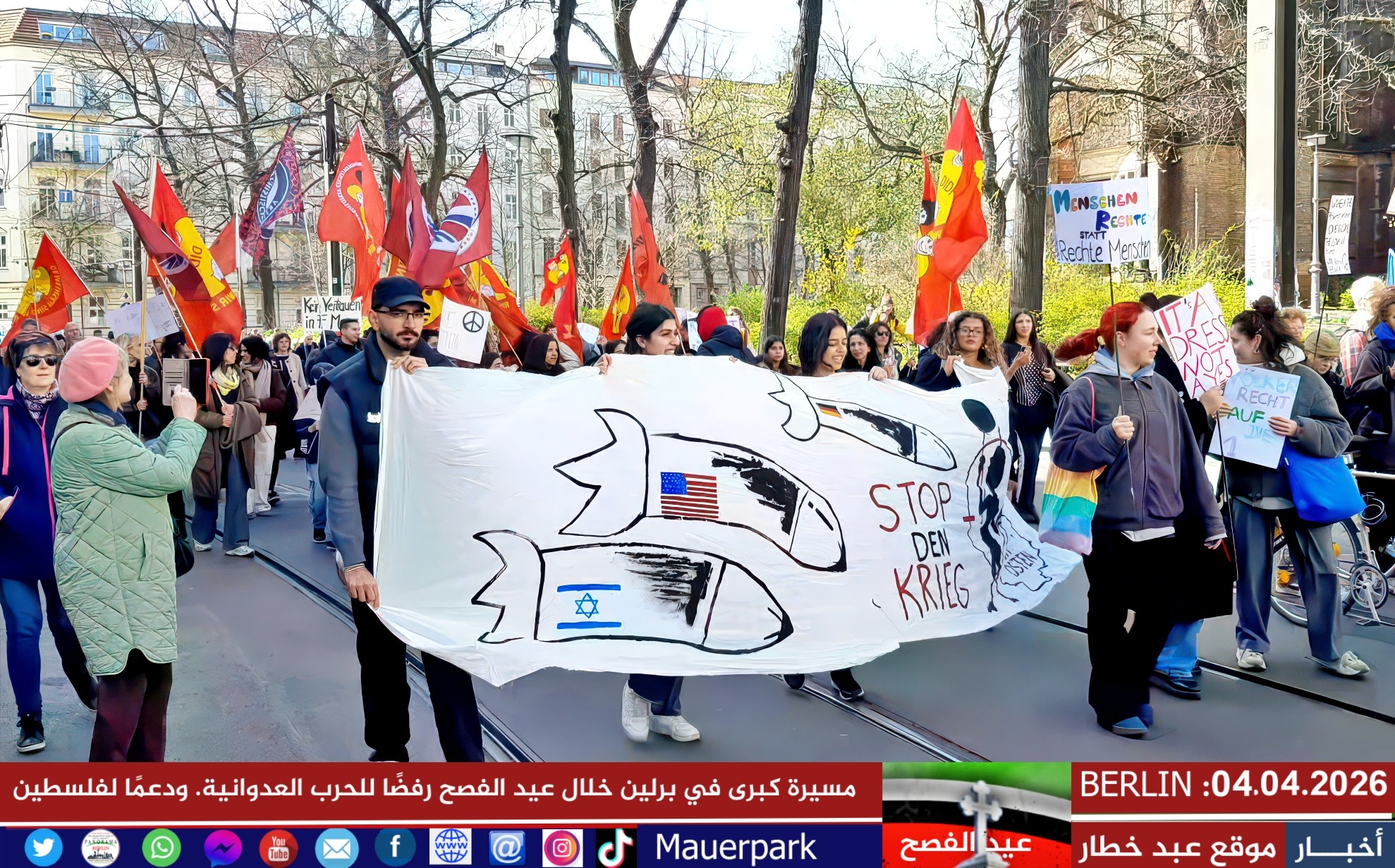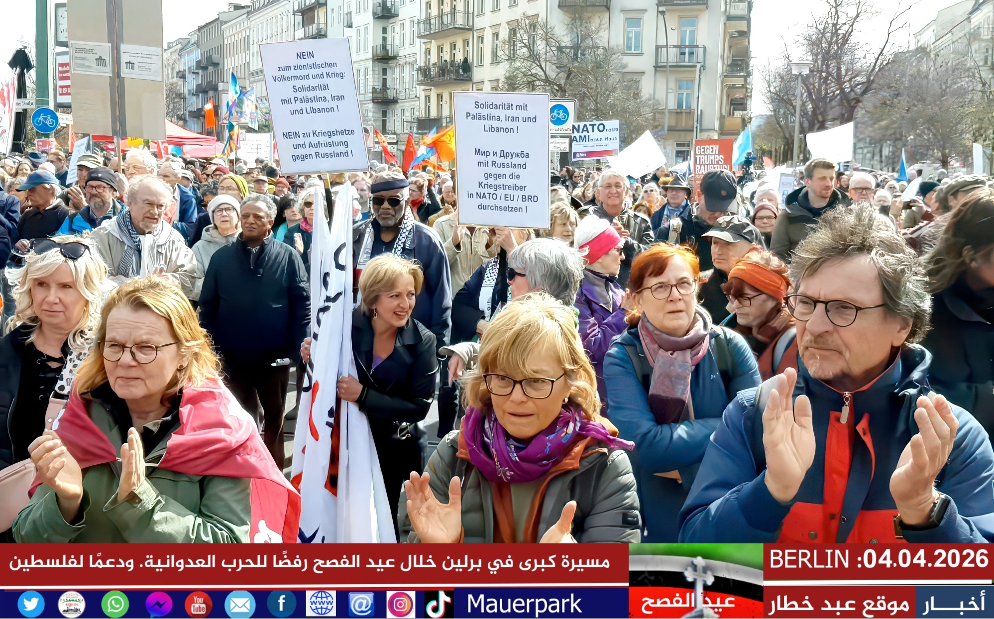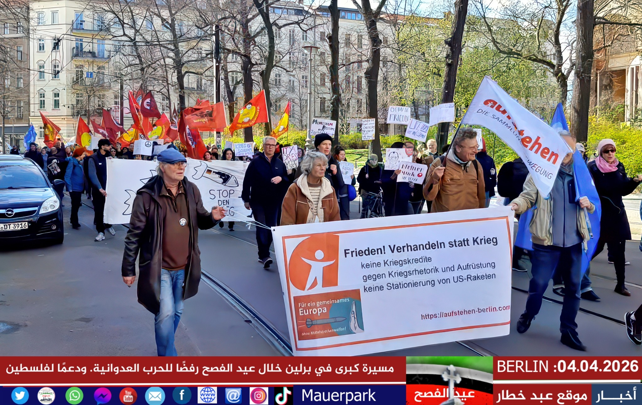 شهدت العاصمة الألمانية برلين اليوم السبت، الموافق 04 أبريل 2026، واحدة من أكبر المسيرات السياسية التي تشهدها المدينة خلال عطلة عيد الفصح، حيث احتشد آلاف المتظاهرين في شوارع وسط المدينة استجابة لدعوات أطلقتها عدة قوى سياسية واجتماعية ألمانية ودولية، من بينها حركة السلام الألمانية، ومجموعات يسارية وتقدمية مثل KDP، إضافة إلى اللجنة الوطنية الفلسطينية الموحّدة في برلين، والتحالف الأممي المناهض للإمبريالية والصهيونية.