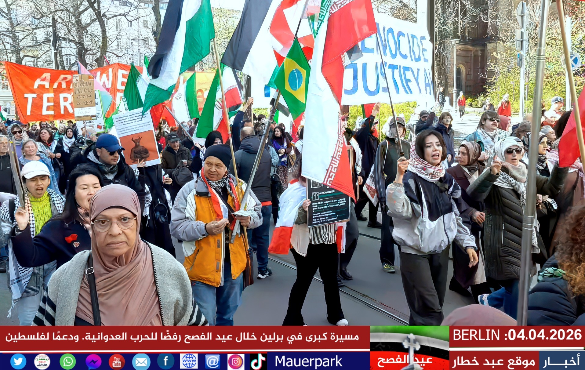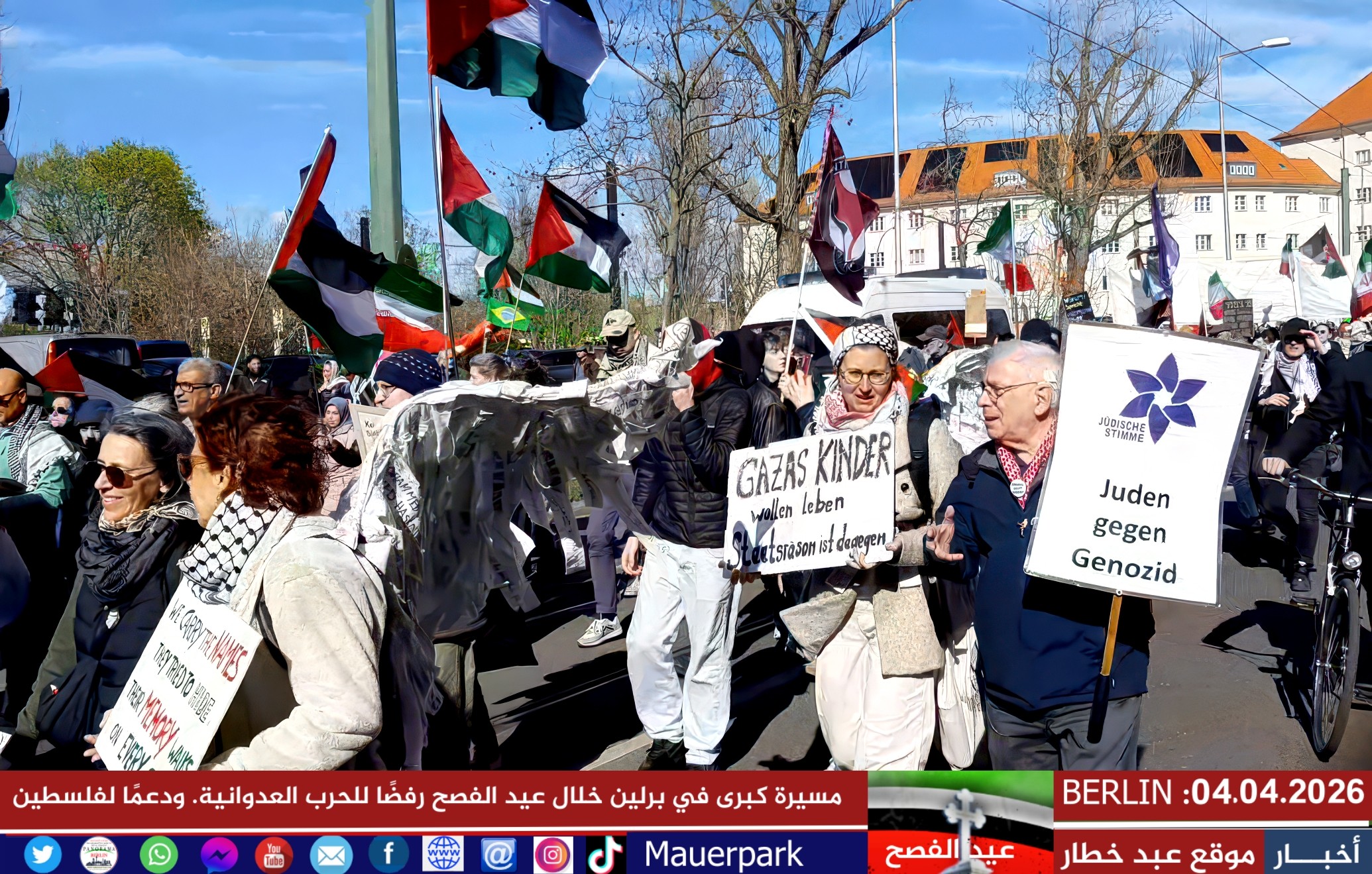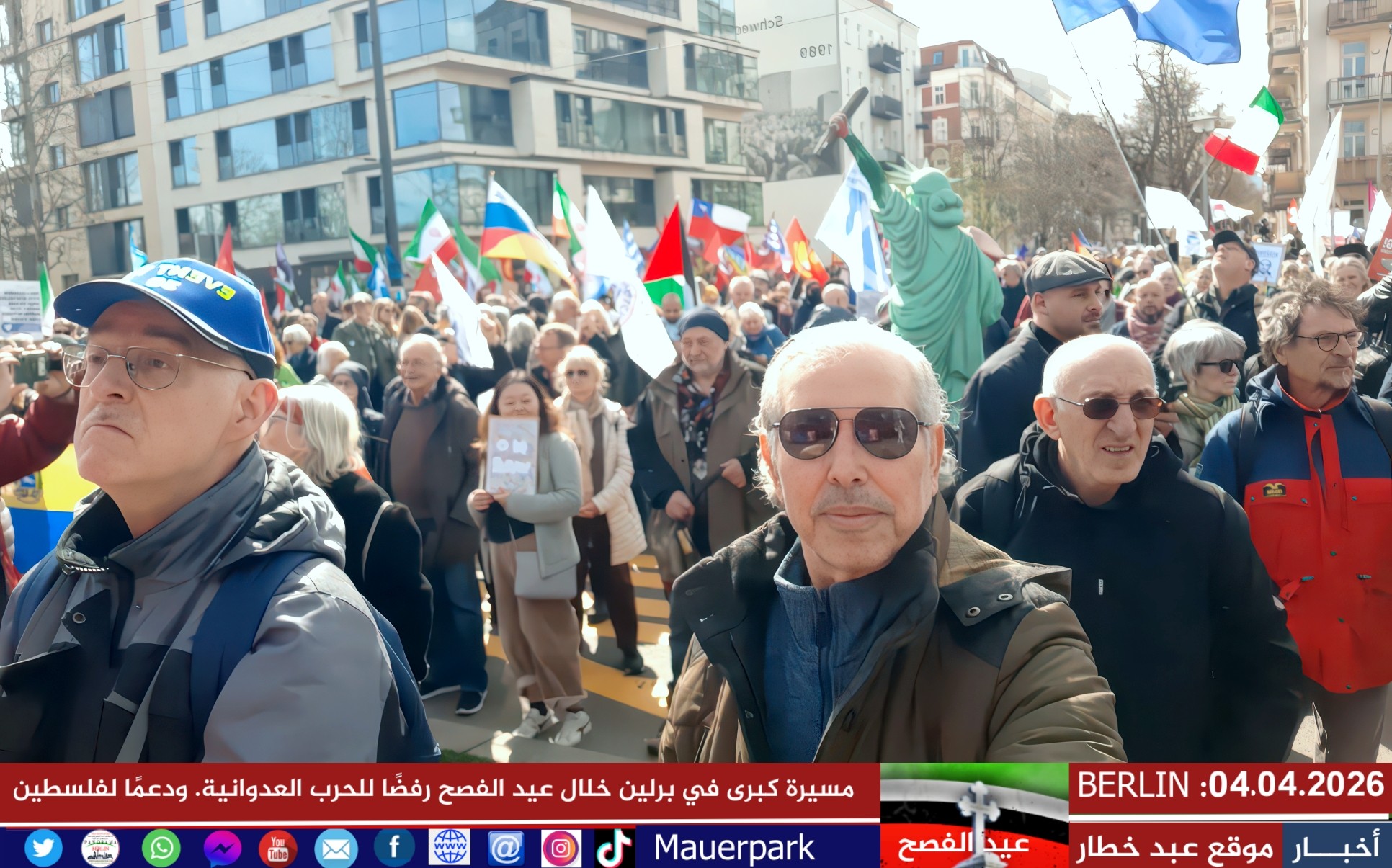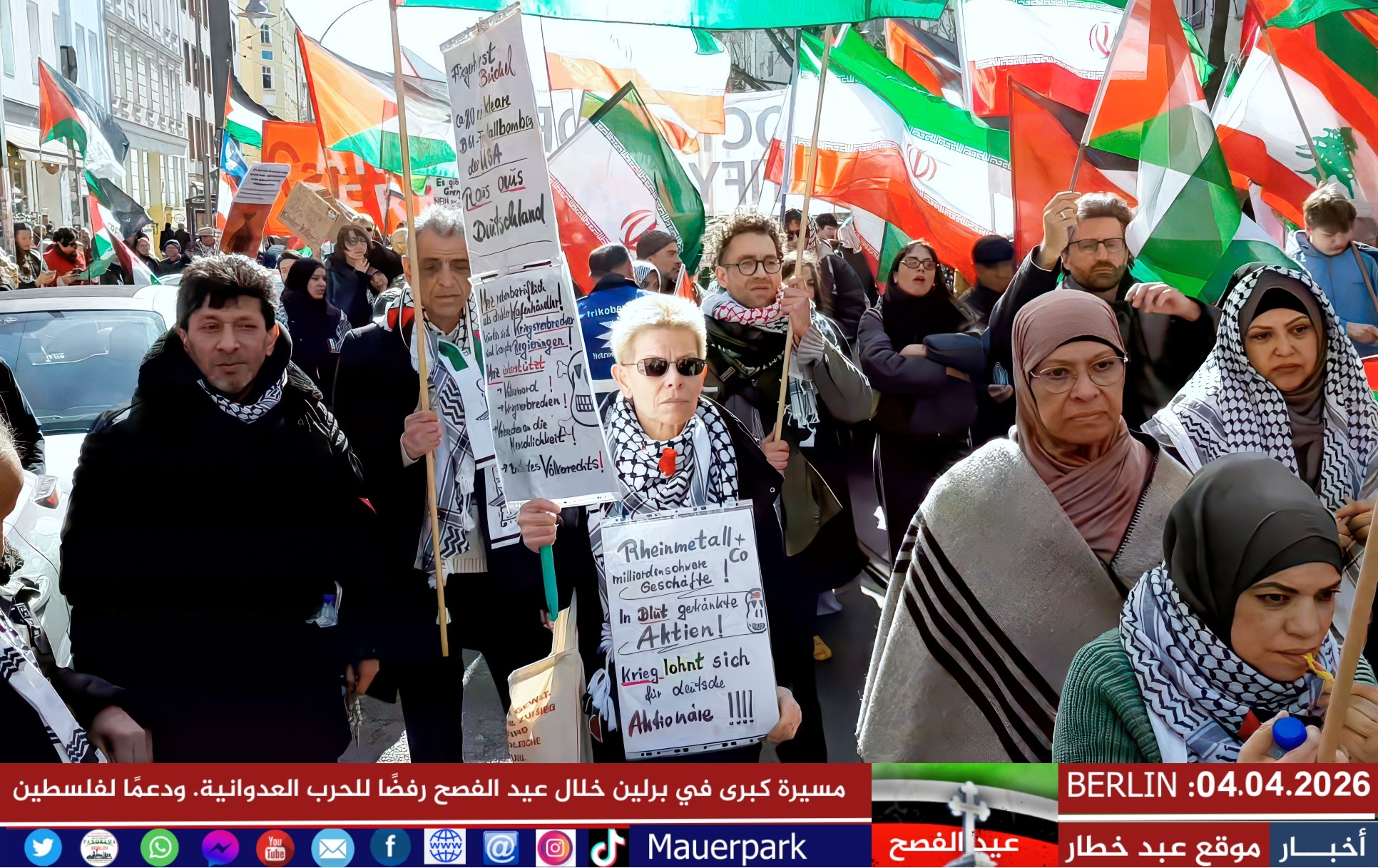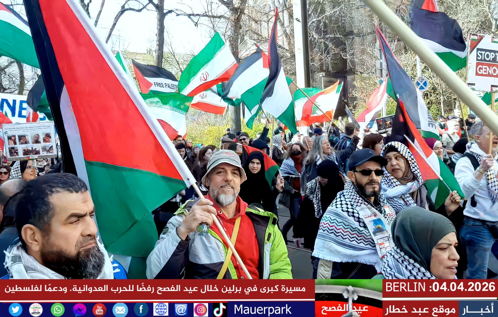 شهدت العاصمة الألمانية برلين اليوم السبت، الموافق 04 أبريل 2026، واحدة من أكبر المسيرات السياسية التي تشهدها المدينة خلال عطلة عيد الفصح، حيث احتشد آلاف المتظاهرين في شوارع وسط المدينة استجابة لدعوات أطلقتها عدة قوى سياسية واجتماعية ألمانية ودولية، من بينها حركة السلام الألمانية، ومجموعات يسارية وتقدمية مثل KDP، إضافة إلى اللجنة الوطنية الفلسطينية الموحّدة في برلين، والتحالف الأممي المناهض للإمبريالية والصهيونية.