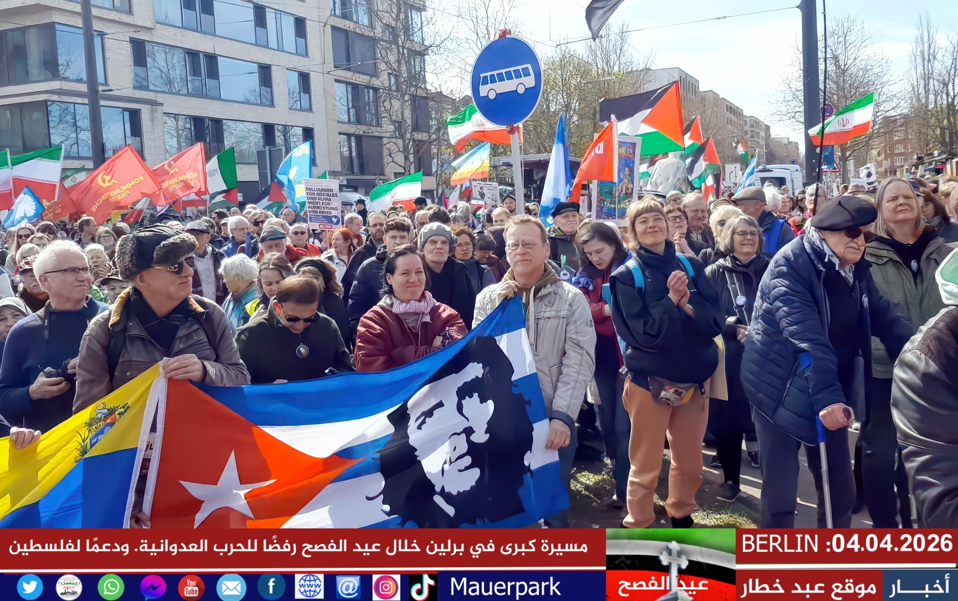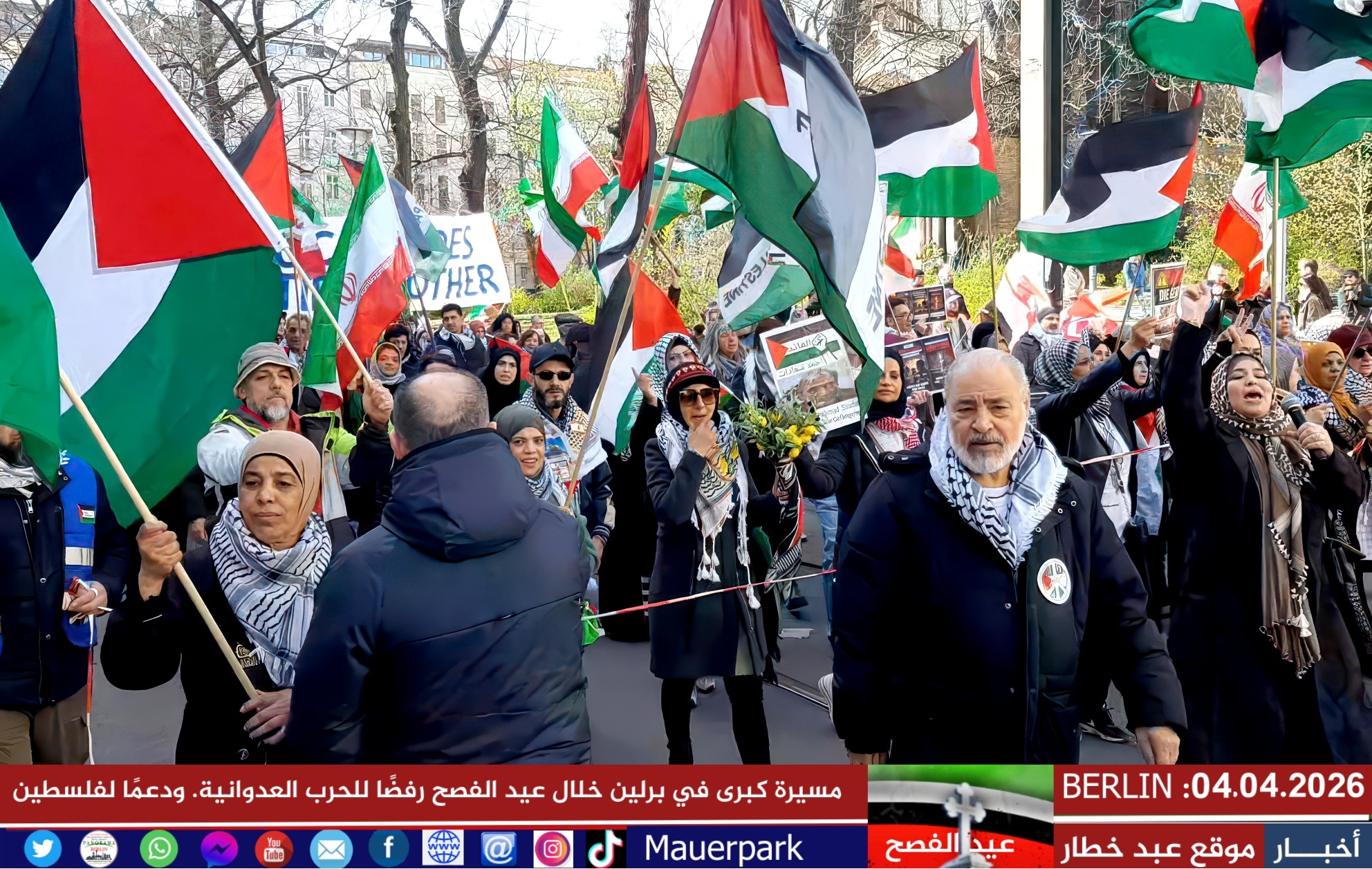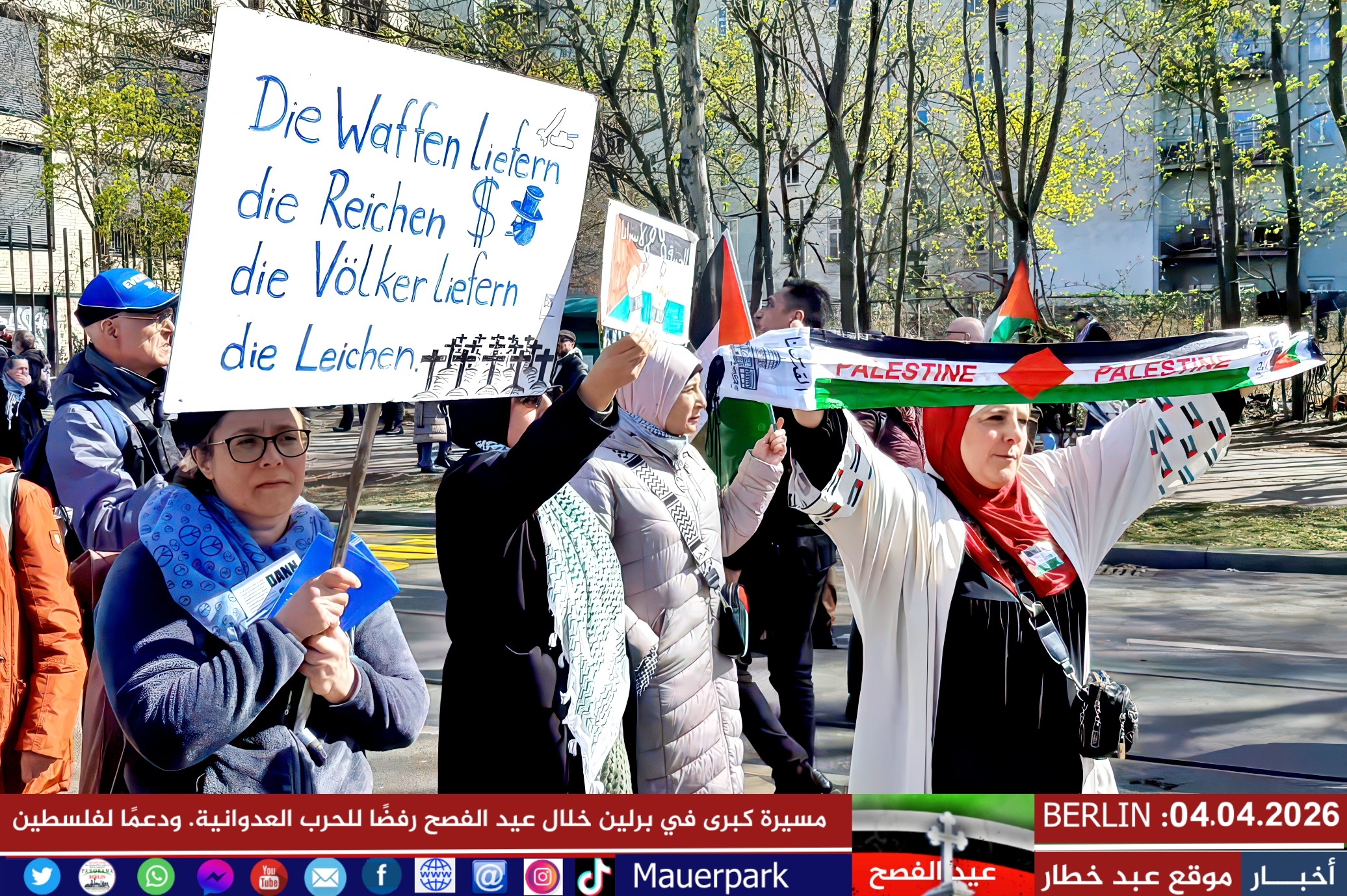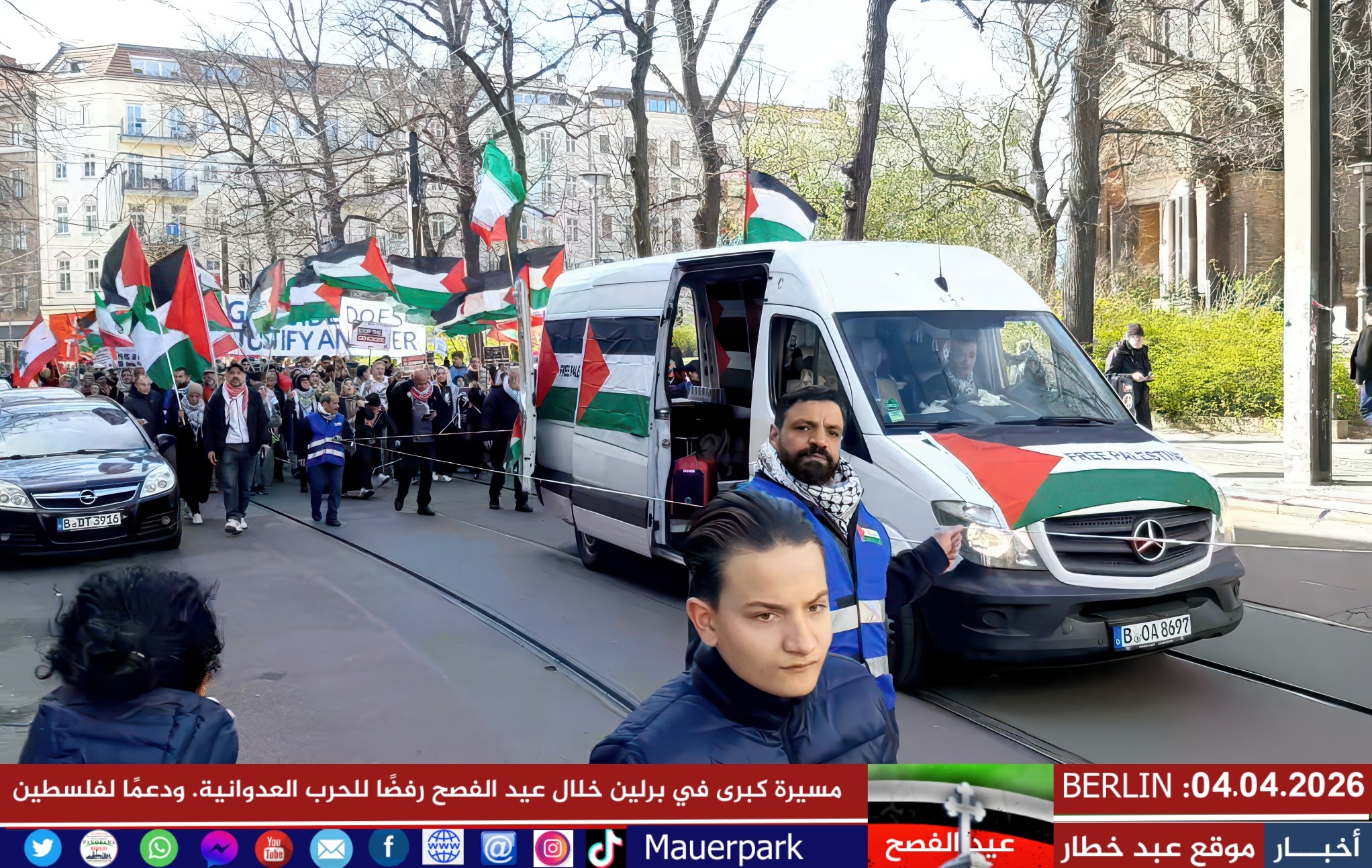 شهدت العاصمة الألمانية برلين اليوم السبت، الموافق 04 أبريل 2026، واحدة من أكبر المسيرات السياسية التي تشهدها المدينة خلال عطلة عيد الفصح، حيث احتشد آلاف المتظاهرين في شوارع وسط المدينة استجابة لدعوات أطلقتها عدة قوى سياسية واجتماعية ألمانية ودولية، من بينها حركة السلام الألمانية، ومجموعات يسارية وتقدمية مثل KDP، إضافة إلى اللجنة الوطنية الفلسطينية الموحّدة في برلين، والتحالف الأممي المناهض للإمبريالية والصهيونية.