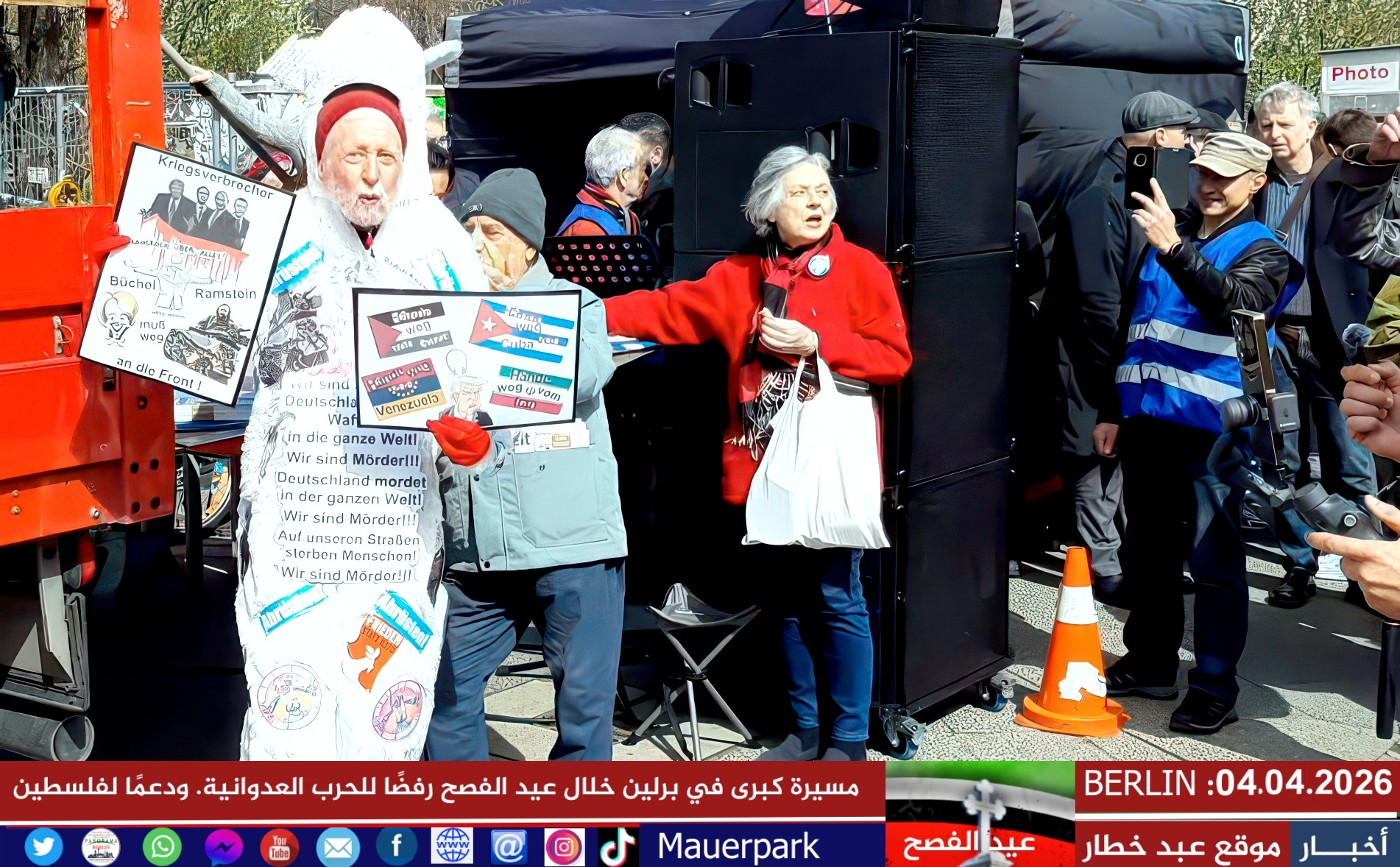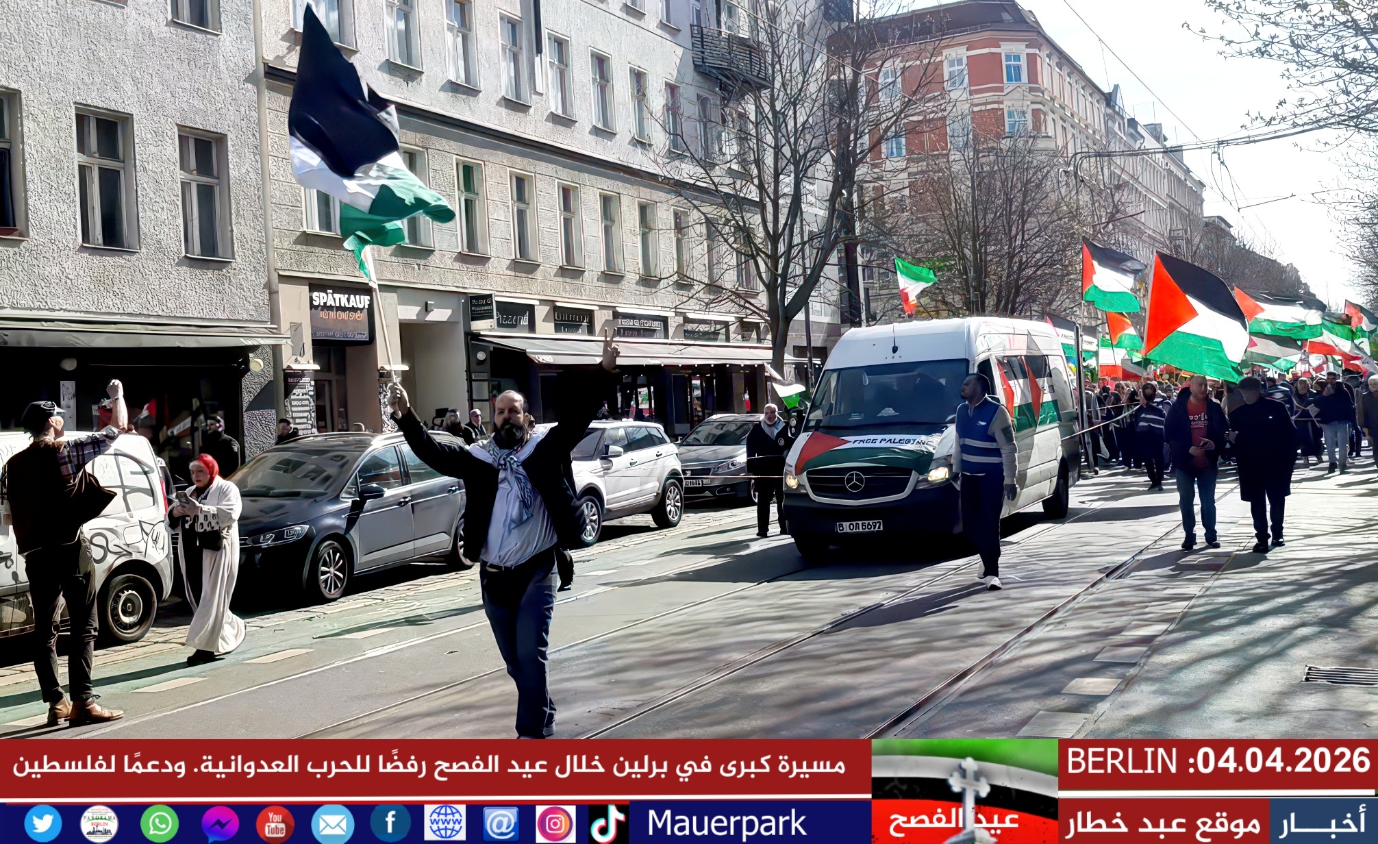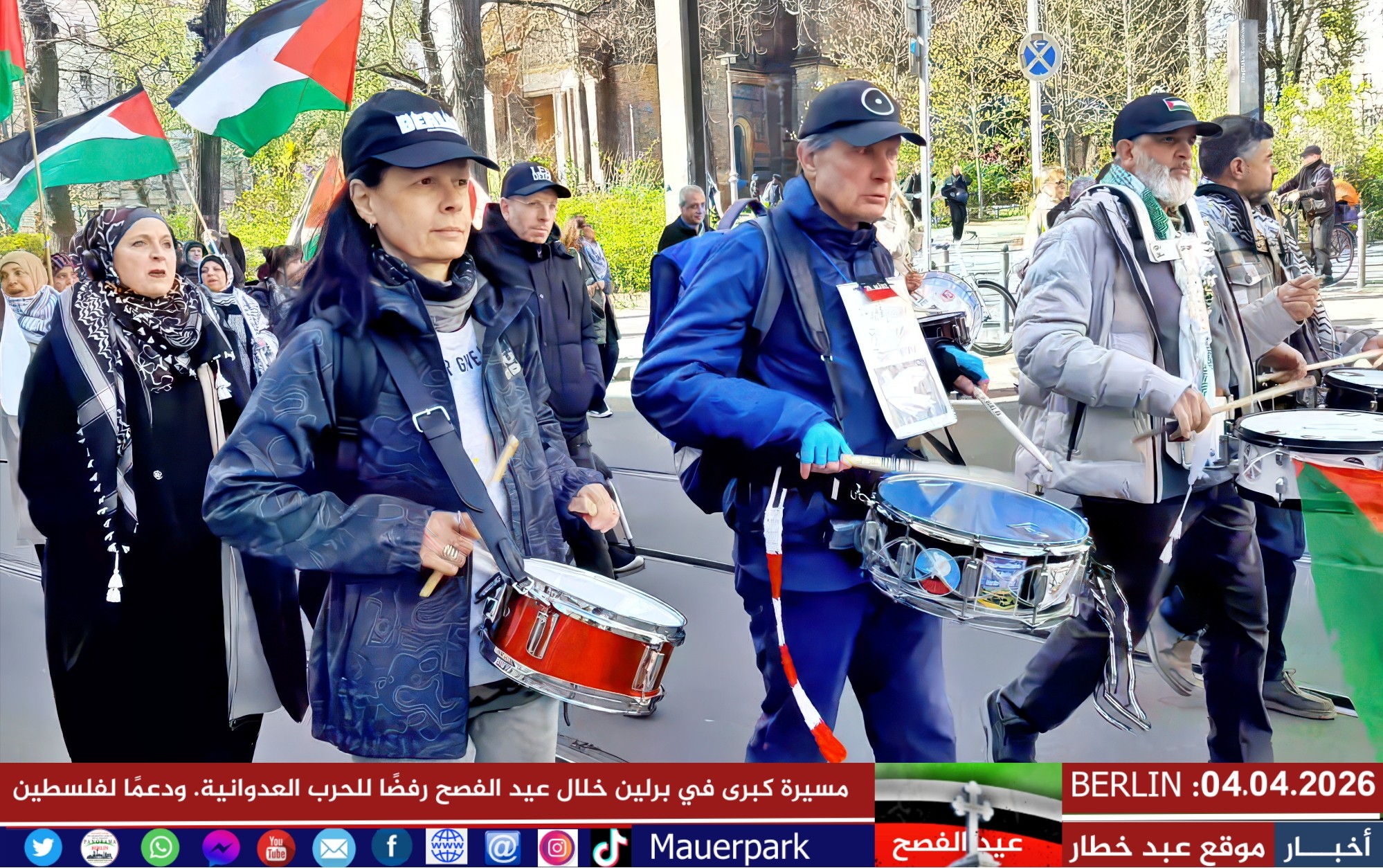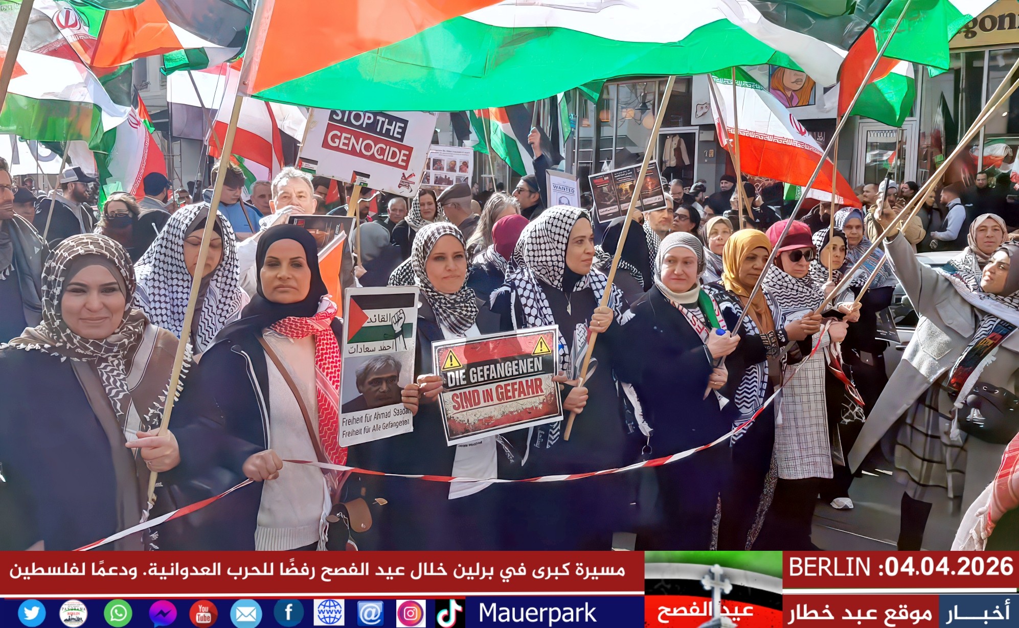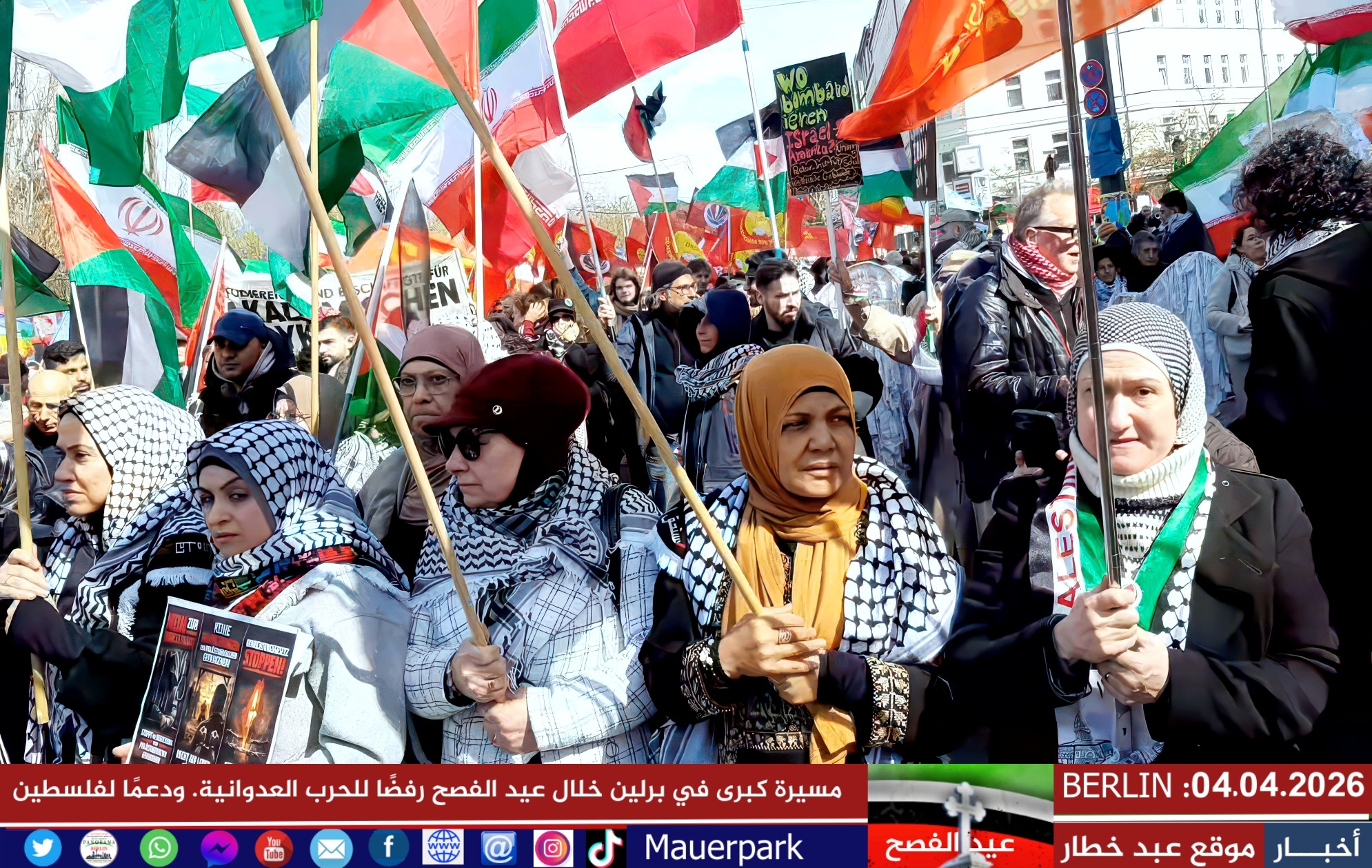 شهدت العاصمة الألمانية برلين اليوم السبت، الموافق 04 أبريل 2026، واحدة من أكبر المسيرات السياسية التي تشهدها المدينة خلال عطلة عيد الفصح، حيث احتشد آلاف المتظاهرين في شوارع وسط المدينة استجابة لدعوات أطلقتها عدة قوى سياسية واجتماعية ألمانية ودولية، من بينها حركة السلام الألمانية، ومجموعات يسارية وتقدمية مثل KDP، إضافة إلى اللجنة الوطنية الفلسطينية الموحّدة في برلين، والتحالف الأممي المناهض للإمبريالية والصهيونية.