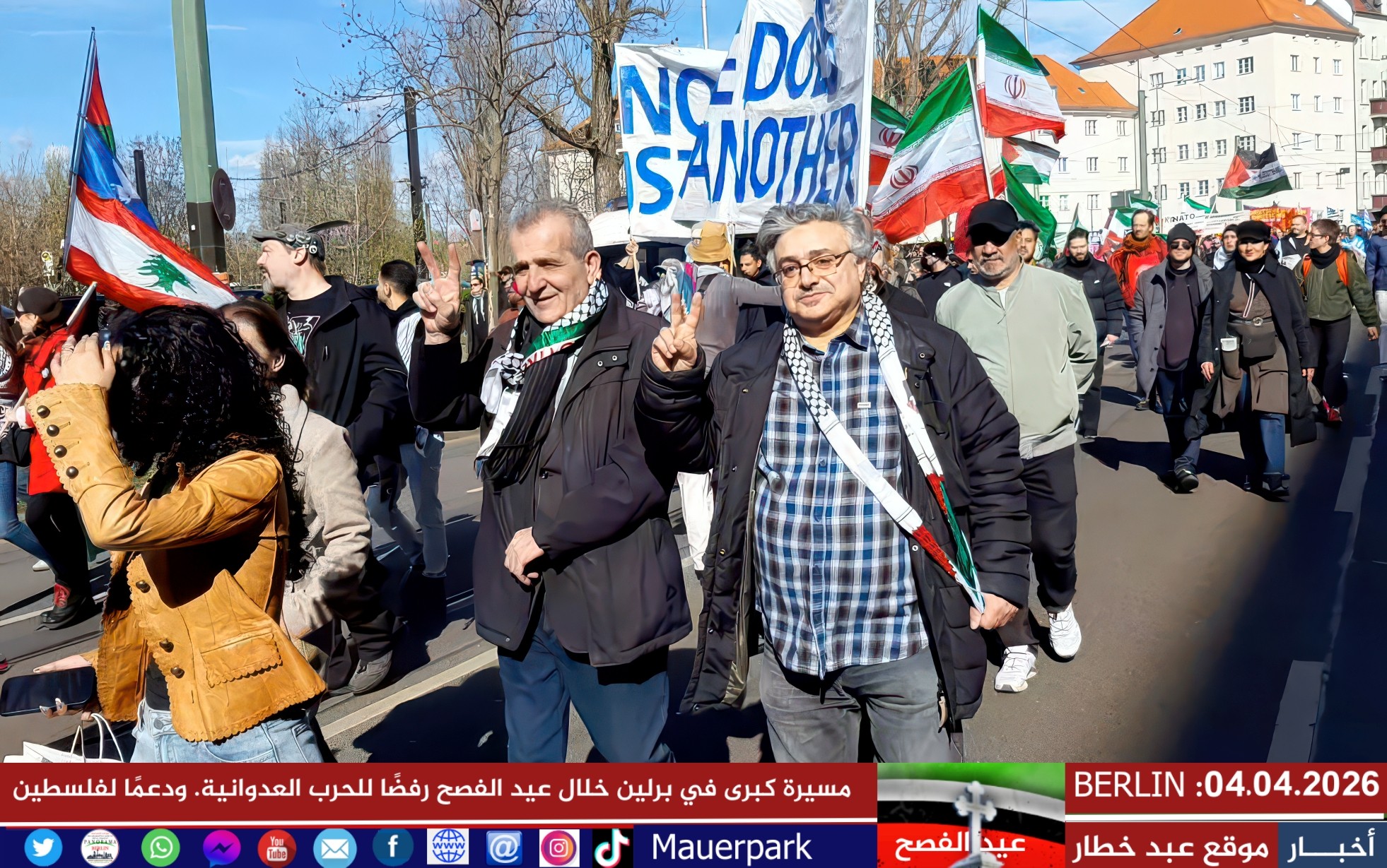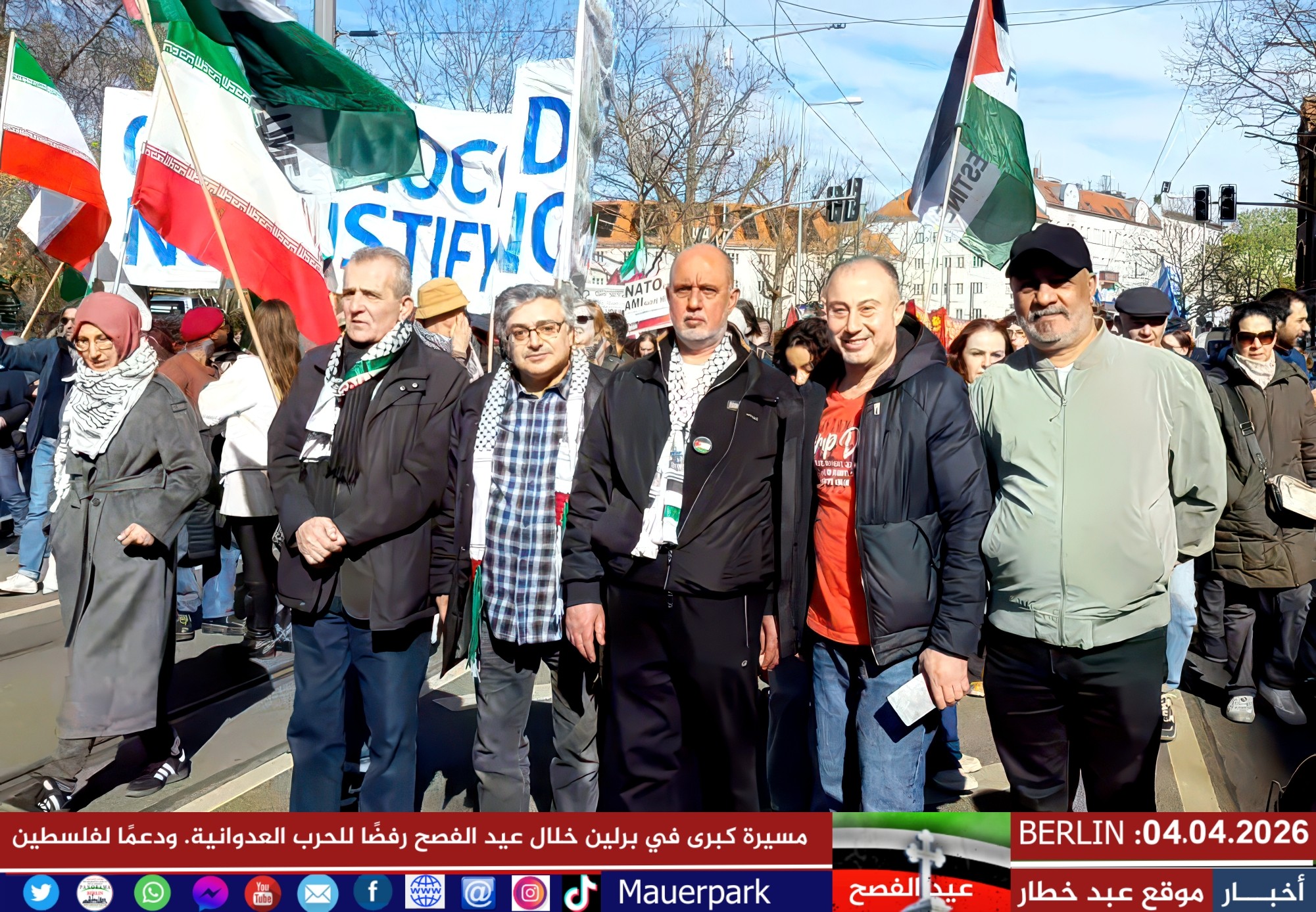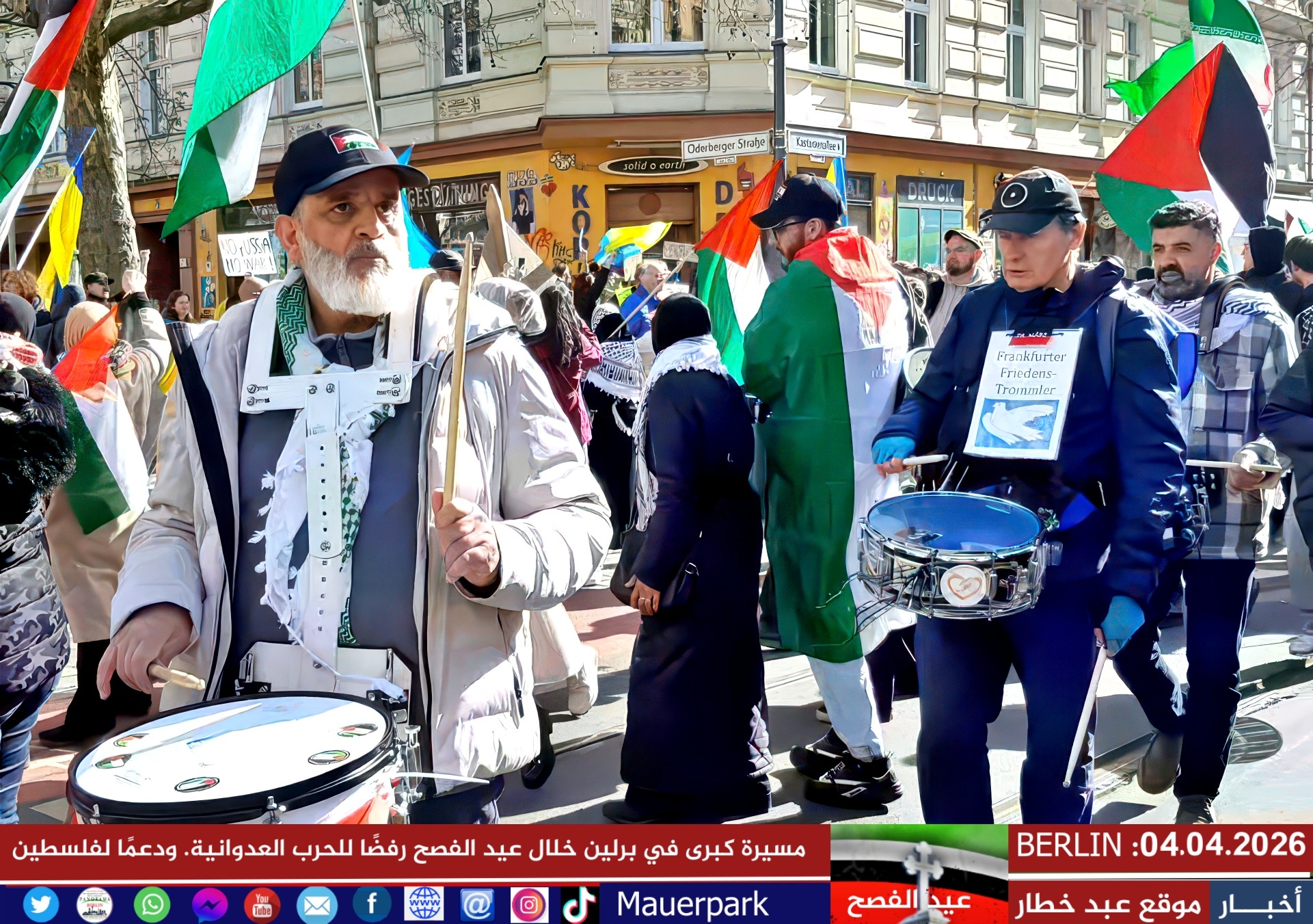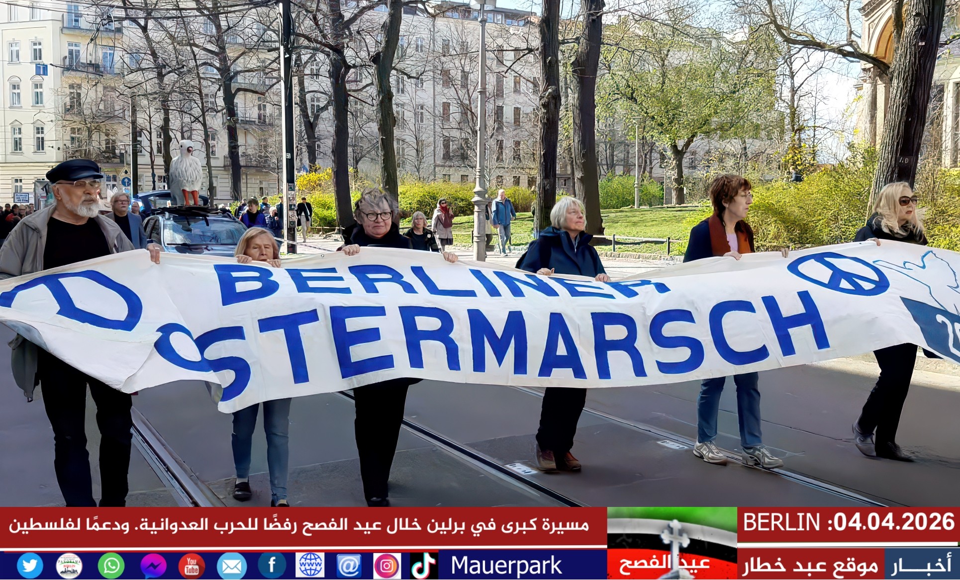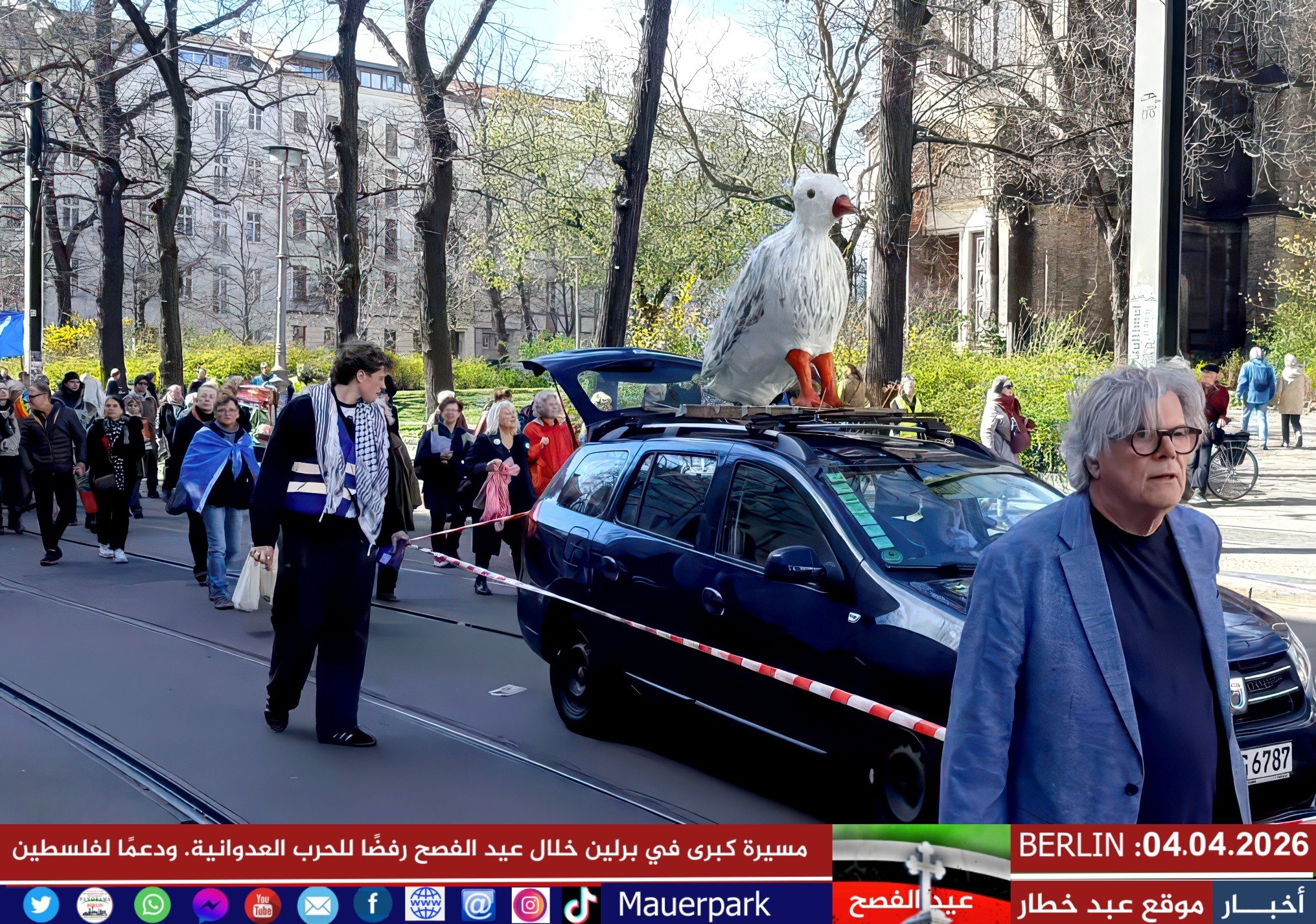 شهدت العاصمة الألمانية برلين اليوم السبت، الموافق 04 أبريل 2026، واحدة من أكبر المسيرات السياسية التي تشهدها المدينة خلال عطلة عيد الفصح، حيث احتشد آلاف المتظاهرين في شوارع وسط المدينة استجابة لدعوات أطلقتها عدة قوى سياسية واجتماعية ألمانية ودولية، من بينها حركة السلام الألمانية، ومجموعات يسارية وتقدمية مثل KDP، إضافة إلى اللجنة الوطنية الفلسطينية الموحّدة في برلين، والتحالف الأممي المناهض للإمبريالية والصهيونية.