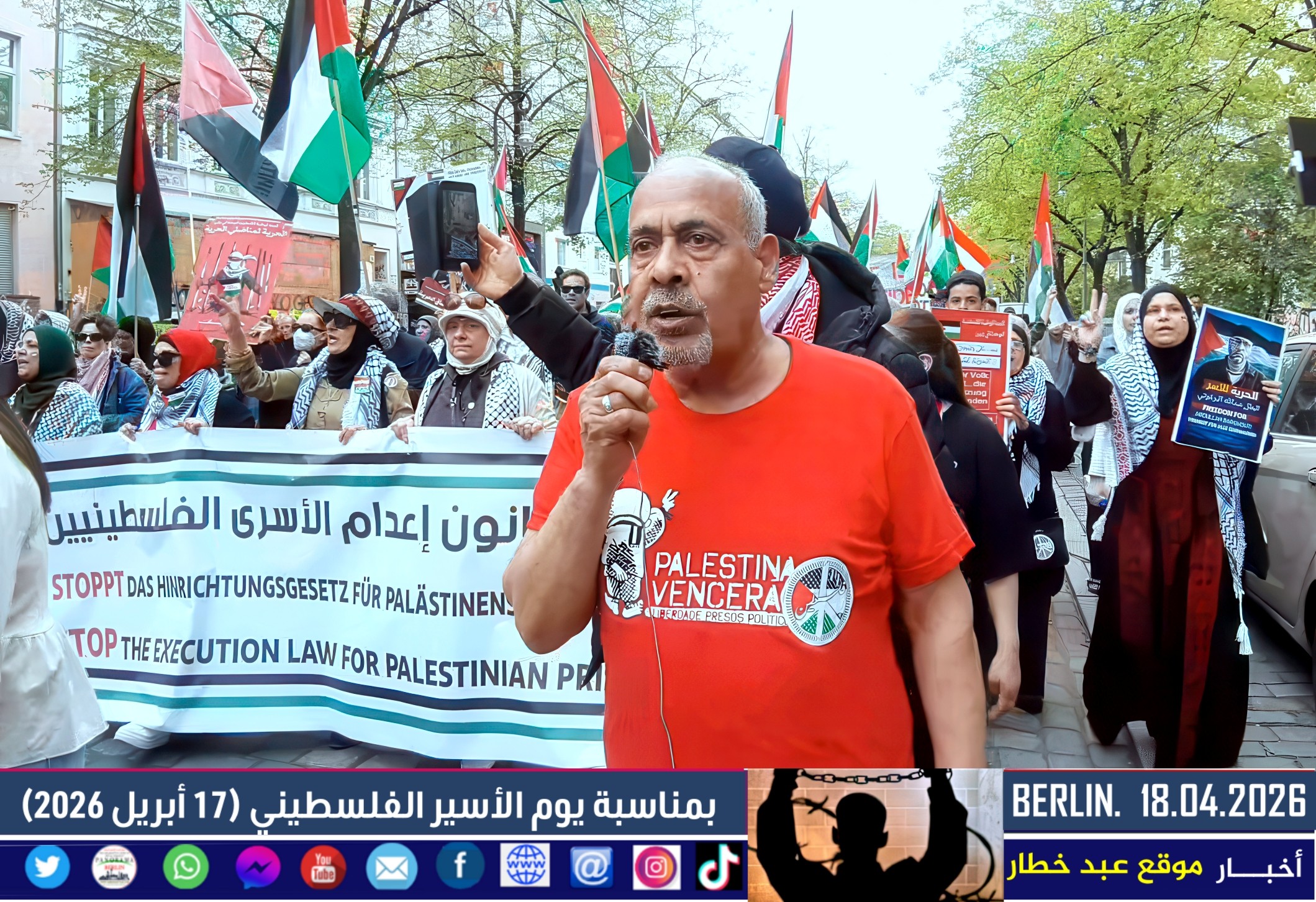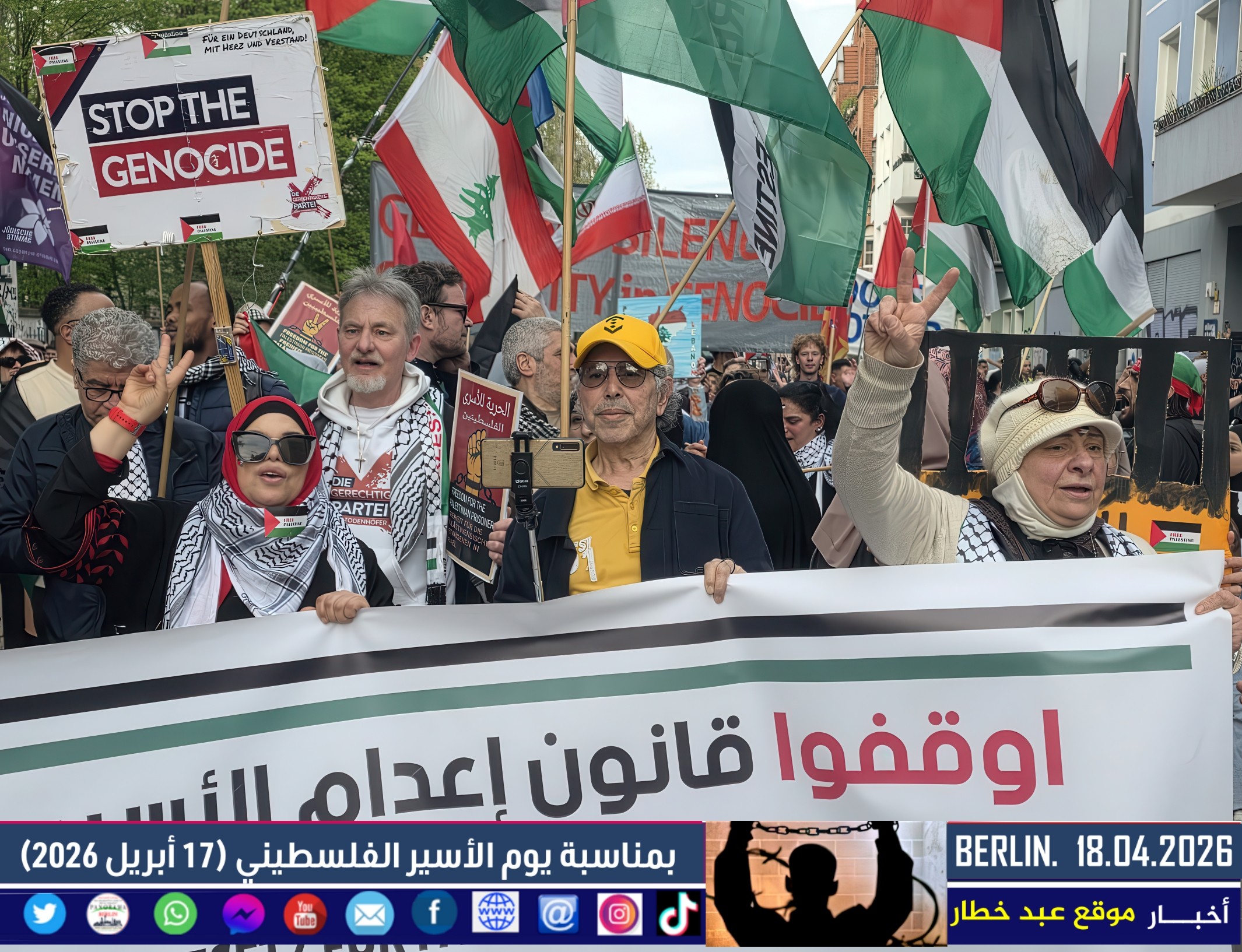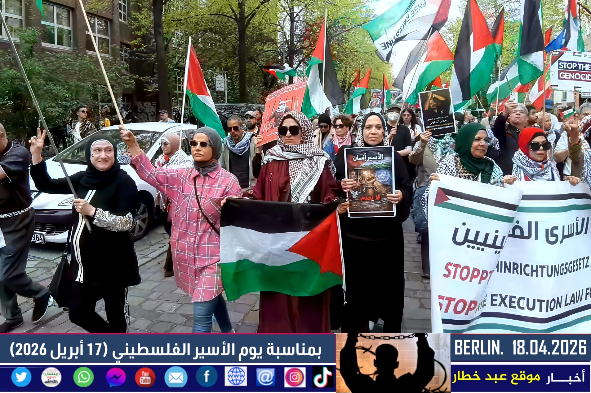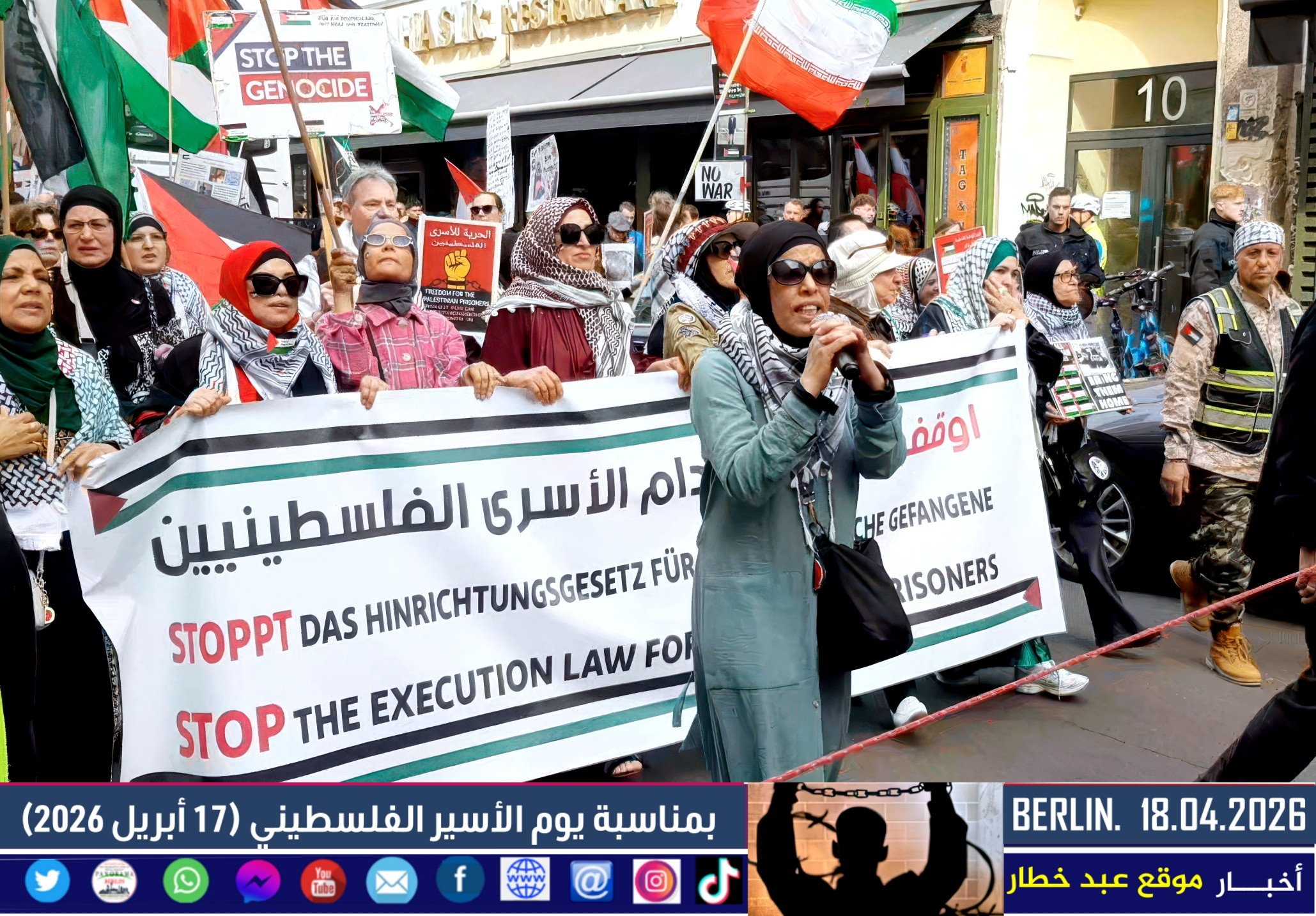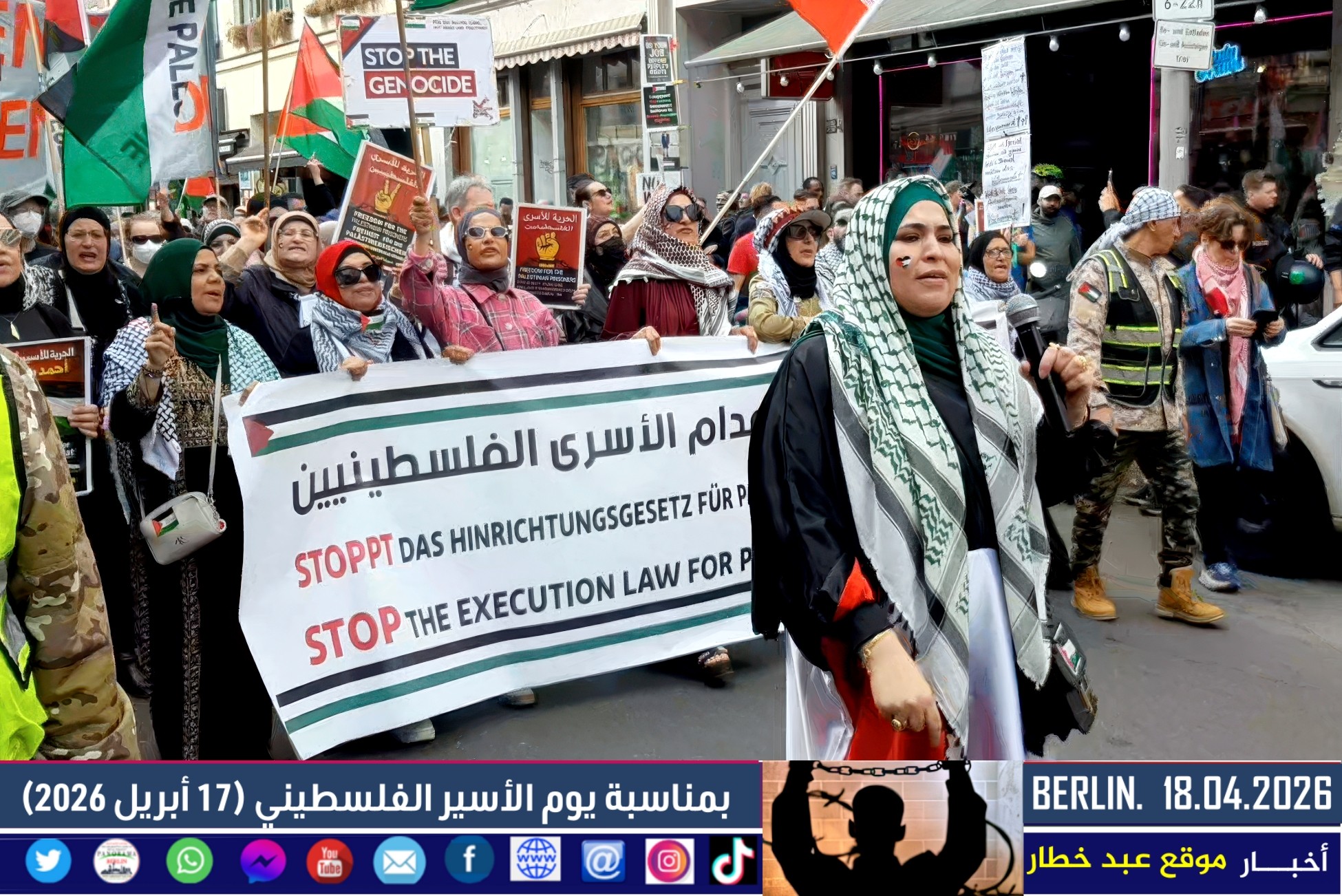 شهدت العاصمة الألمانية برلين اليوم مظاهرة حاشدة دعت إليها اللجنة الوطنية الفلسطينية الموحّدة، بمشاركة واسعة من أبناء الجالية الفلسطينية والعربية، إلى جانب ممثلين عن الاتحاد العالمي الذي يضم العديد من المجموعات الألمانية المناهضة للإمبريالية والصهيونية. وجاءت المسيرة تحت عنوان “لا لقانون إعدام الأسرى الفلسطينيين”، في رفض واضح للتشريع الذي أقرّه البرلمان الإسرائيلي مؤخرًا.