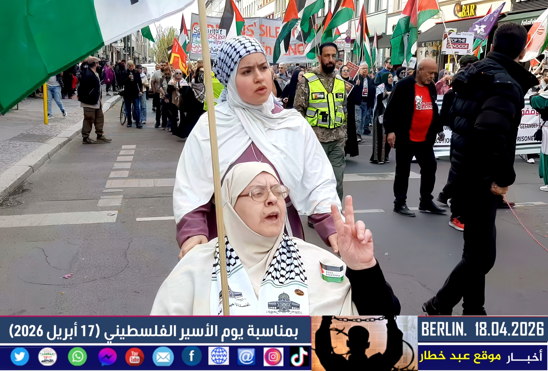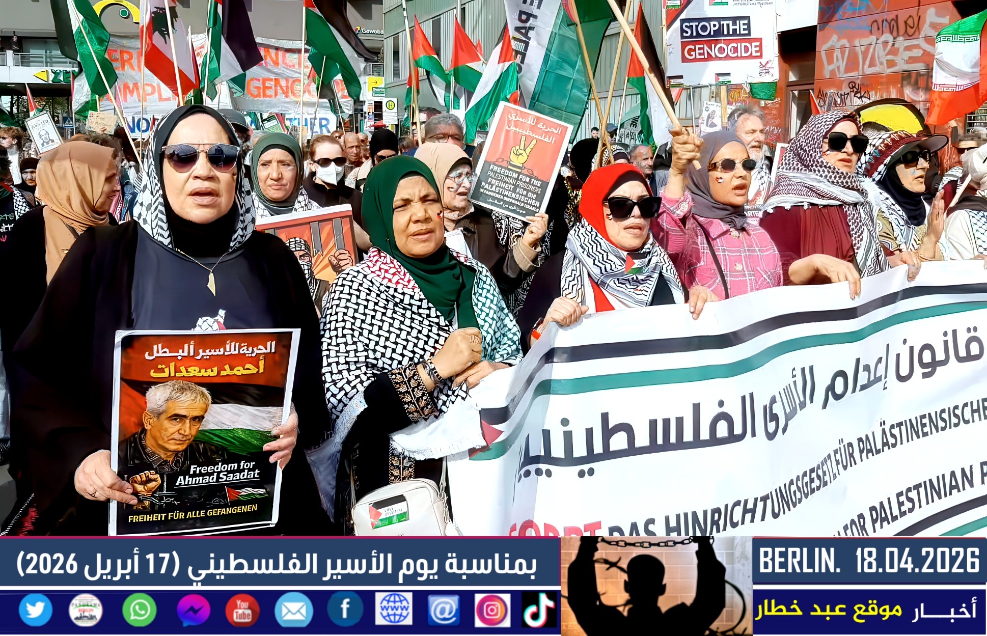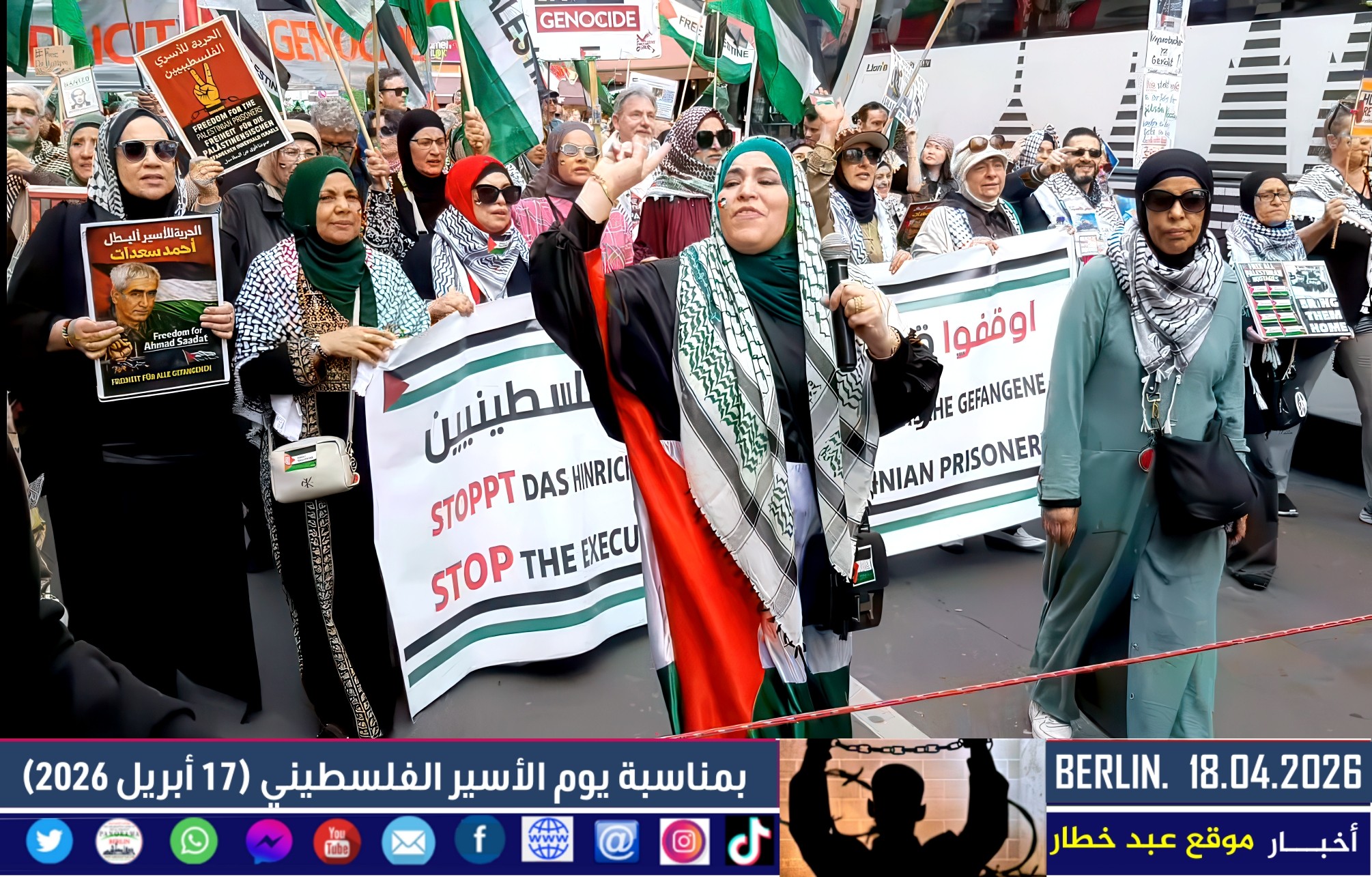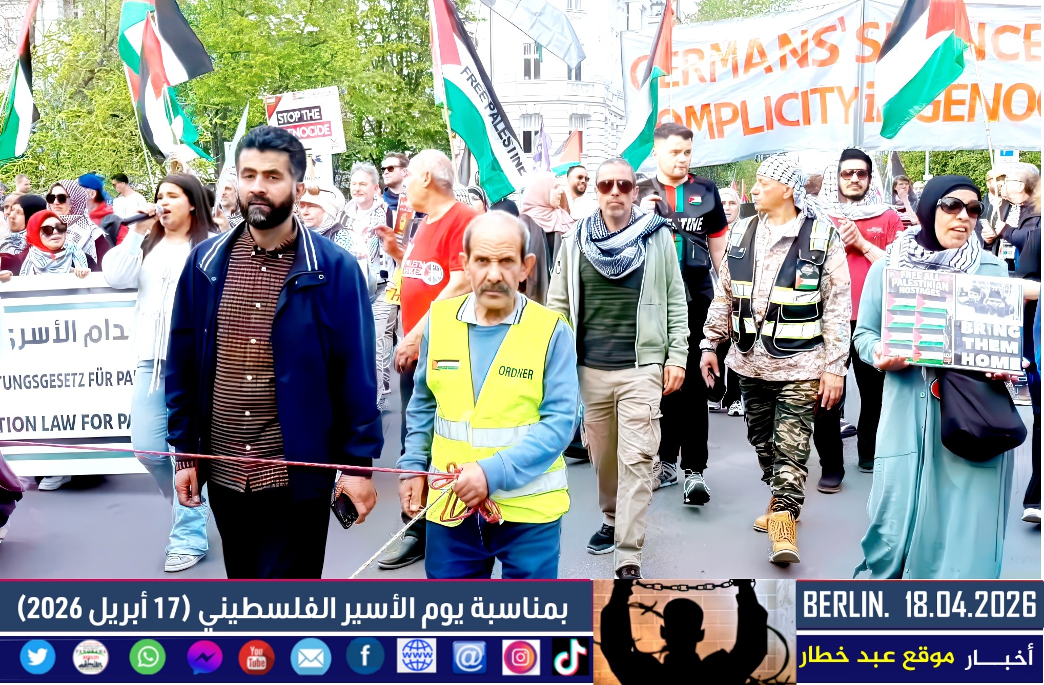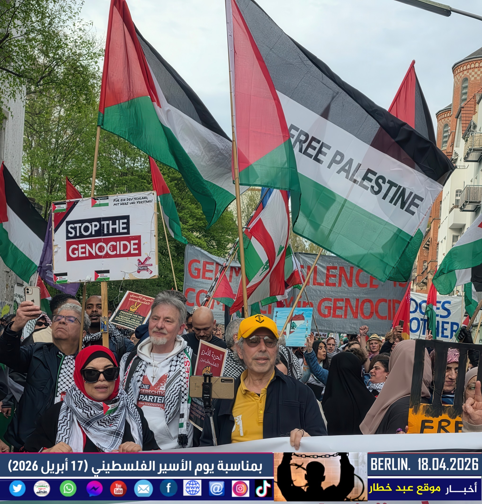 شهدت العاصمة الألمانية برلين اليوم مظاهرة حاشدة دعت إليها اللجنة الوطنية الفلسطينية الموحّدة، بمشاركة واسعة من أبناء الجالية الفلسطينية والعربية، إلى جانب ممثلين عن الاتحاد العالمي الذي يضم العديد من المجموعات الألمانية المناهضة للإمبريالية والصهيونية. وجاءت المسيرة تحت عنوان “لا لقانون إعدام الأسرى الفلسطينيين”، في رفض واضح للتشريع الذي أقرّه البرلمان الإسرائيلي مؤخرًا.
