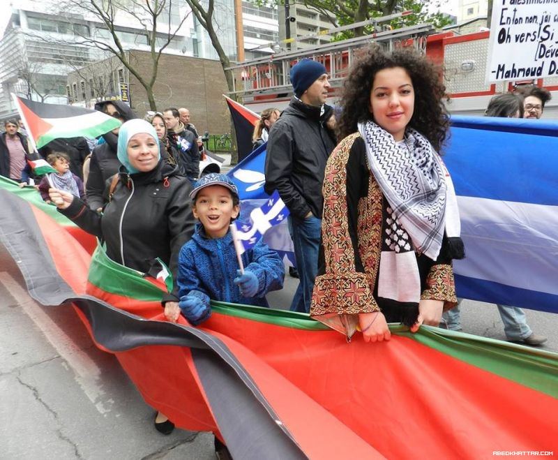 مونتريال : أحيا أبناء الجالية الفلسطينية والعربية وحشد من المتضامنين الكنديين، الذكرى الـ68 للنكبة، خلال مشاركتهم في مسيرة حاشدة انطلقت من قلب مدينة مونتريال الكندية في مقاطعة الكيبيك، ثم سارت لتطوف أبرز الشوارع الرئيسية في المدينة ، والمشاركون يرفعون ويحيطون بعلم ضخم صُمم بشكل مشترك بين العلمين الفلسطيني والكيبكي، للتعبير عن تضامن شعب الكيبك مع نضال الشعب الفلسطيني، وإحياء الذكرى الـ128 لاحتضان المقاطعة أول فلسطيني قدم إليها