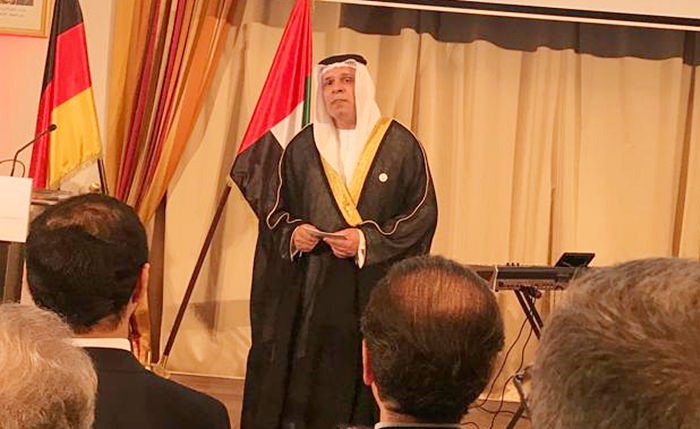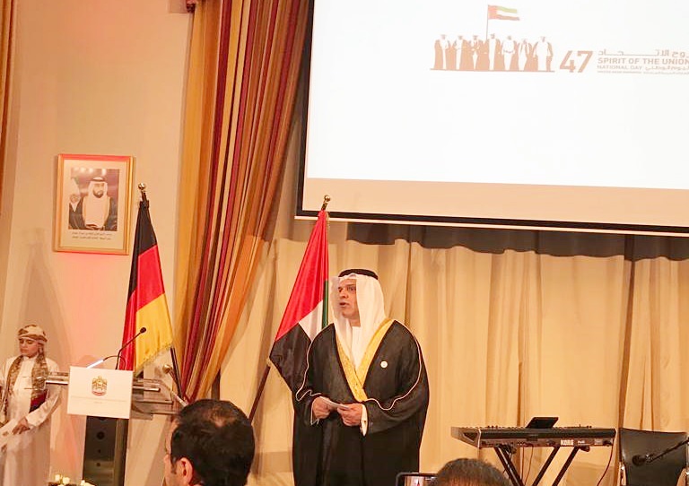 أقام سعادة سفير الإمارات العربية المتحدة لدى جمهوري ألمانيا الاتحادية علي عبد الله الأحمد في مقر السفارة في برلين 26/11/2018، حفل استقبال بمناسبة اليوم الوطني الـ 47 لقيام اتحاد ألإمارات حضره عدد من كبار المسئولين في وزارة الخارجية الألمانية والمسئولين الألمان وأعضاء الكتل ألبرلمانية ود. جمال المغربي مستشار البرلمان للشؤون العربية والإسلامية إلى جانب رؤساء ومحرري الصحف ألألمانية بجانب شخصيات سياسية واقتصاديه إضافة إلى رؤساء وأعضاء البعثات الدبلوماسية العربية والأجنبية، ونخبة من المجتمع الألماني ومواطني الدولة الموجودين في ألمانيا.