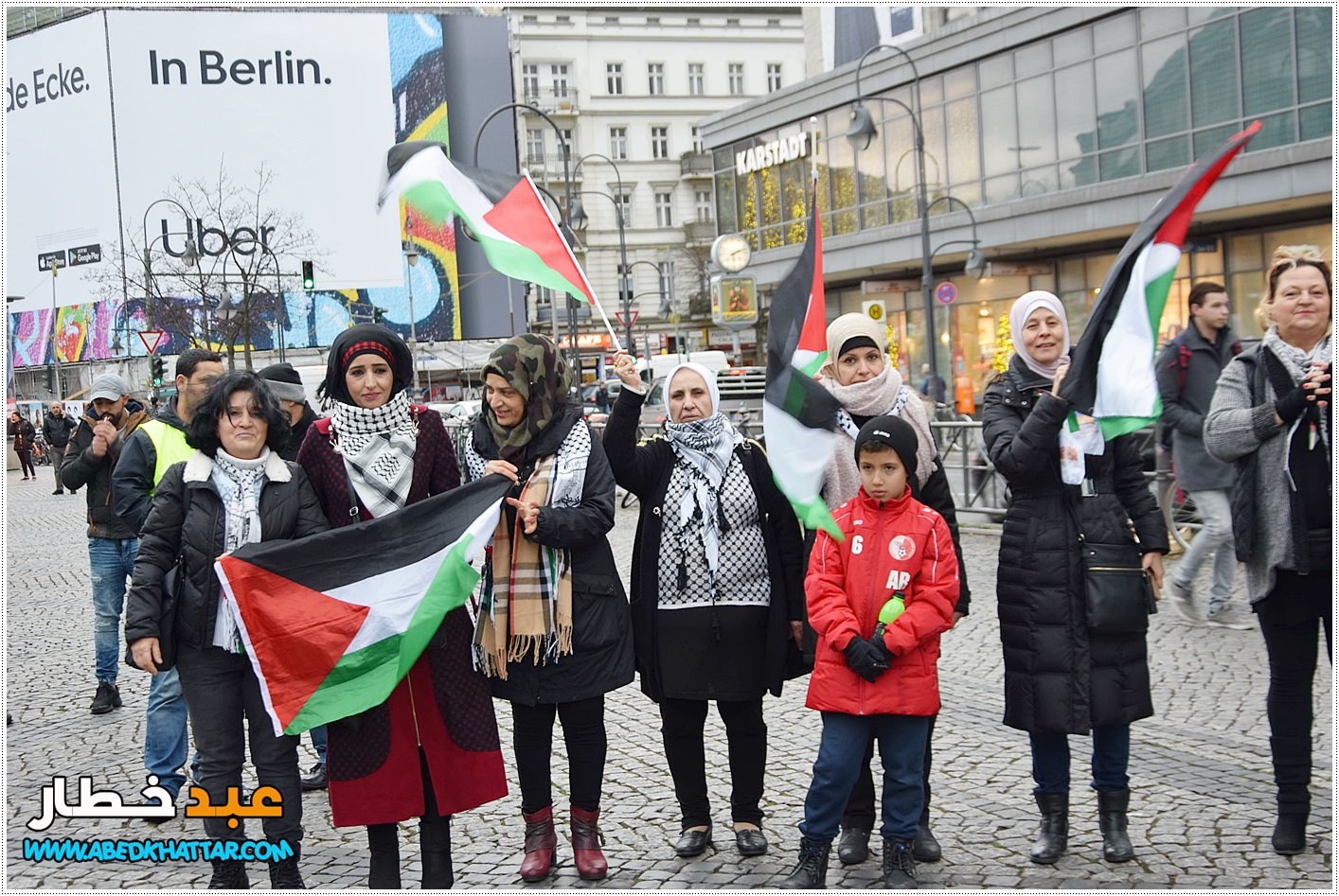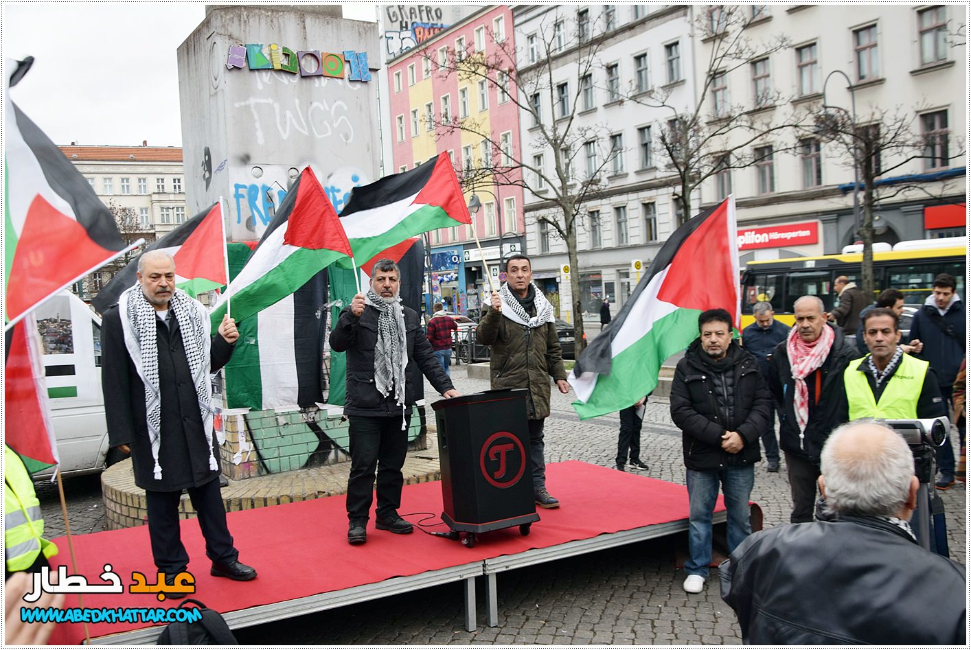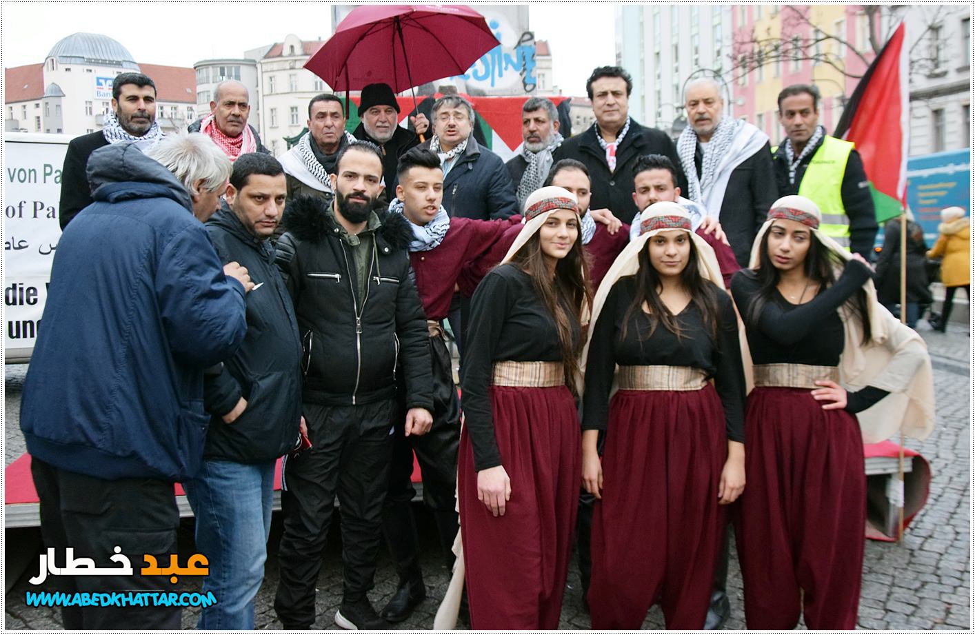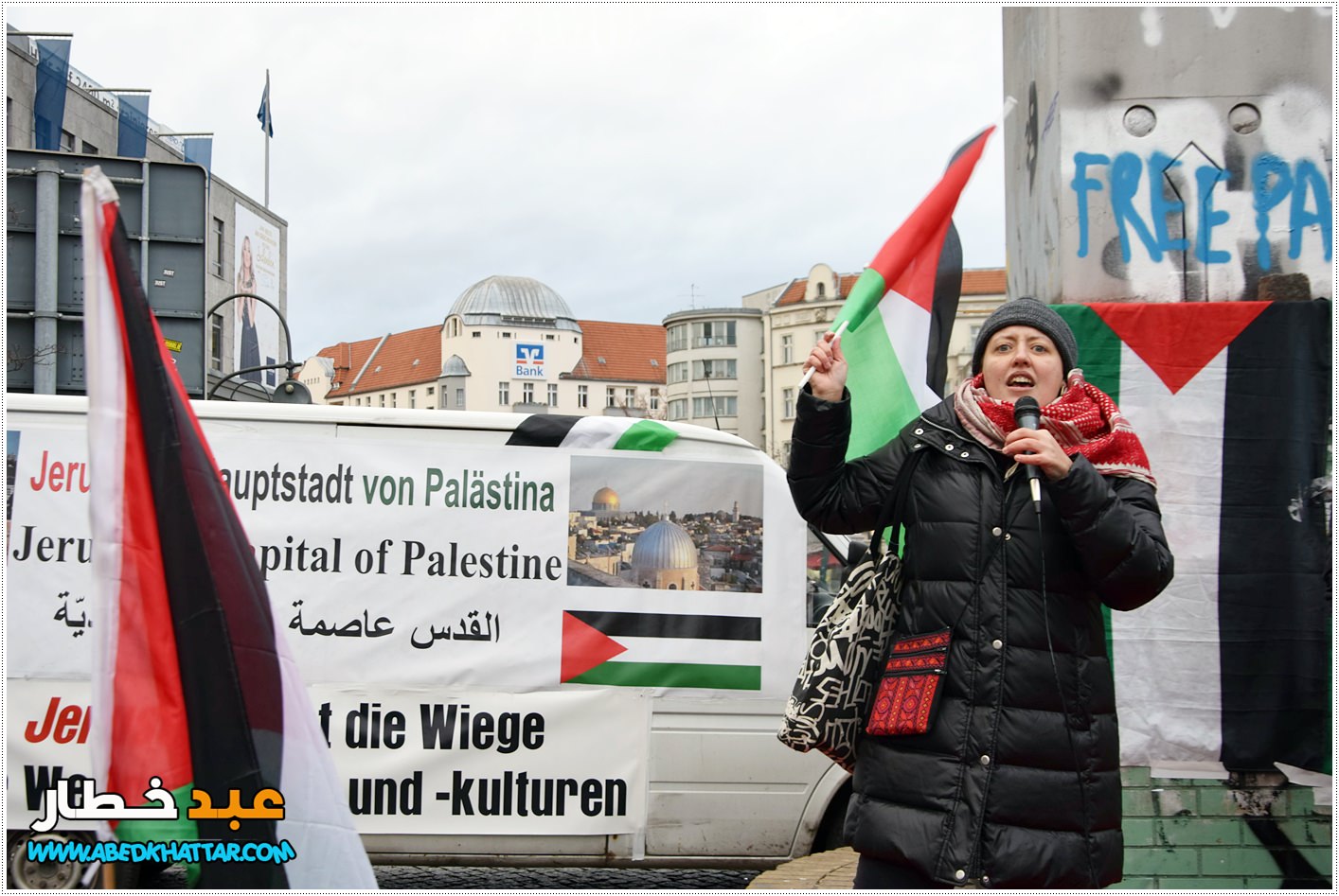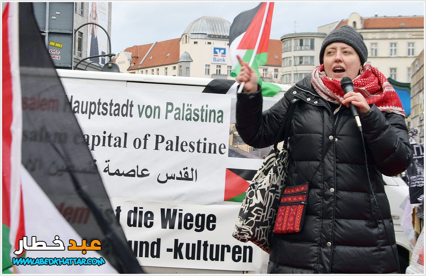 وقد شهدت الفعالية مشاركة جمهور من الجالية الفلسطينية والعربية في برلين الألمان الدّاعمين للحقّ الفلسطيني، وألقيت كلمات باللغة الألمانية والإنكليزية والعربية ورفعوا خلالها شعارات مناهضة لقرار الرئيس الأمريكي دونالد ترامب وللسياسة الأمريكية المنحازة لصالح الإحتلال الإسرائيلي، وطالبوا الإدارة الأمريكية بالتراجع عن القرار الجائر الذي يمس الحقوق الفلسطينية والمقدسات الإسلامية والمسيحية في مدينة القدس.