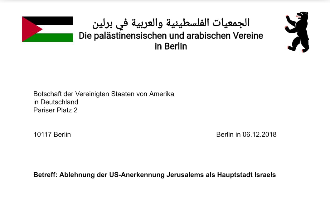 هذا وكانت اللجنة الوطنية الفلسطينية والعربية للدفاع عن القدس قد سلمت السفارة الأمريكية في برلين يوم 06.12.2018 رسالة إحتجاج قوية اللهجة بمناسبة مرور عام على إعلان ترامب المشؤوم القدس المحتلة عاصمة لدولة