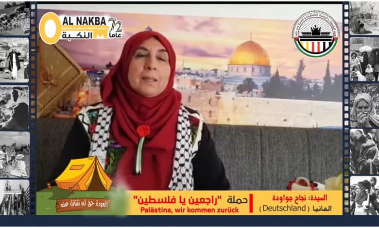 مساهمة الأخت السيدة نجاح جواودة (أم صدام) في حملة هيئة المؤسسات والجمعيات الفلسطينية والعربية في برلين (راجعين يا فلسطين) لإحياء ذكرى النكبة 72.