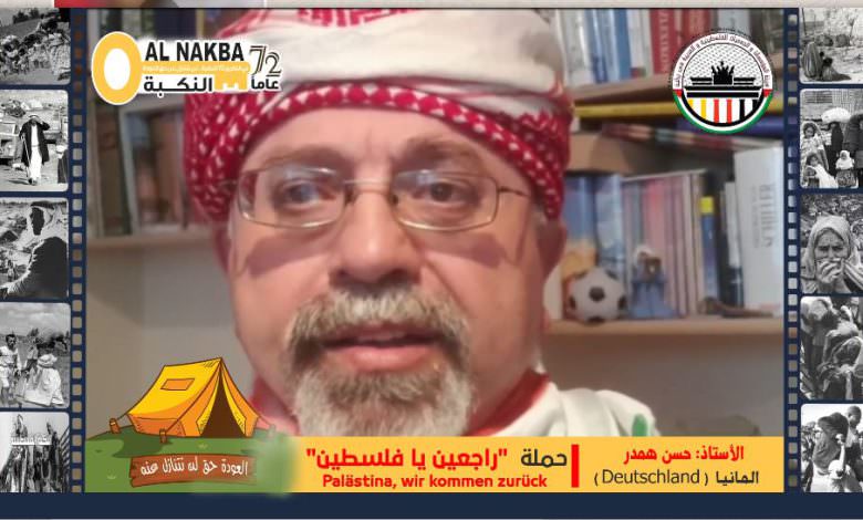 مساهمة الأخ الأستاذ حسن همدر مدينة برلين – ألمانيا في حملة هيئة المؤسسات والجمعيات الفلسطينية والعربية في برلين (راجعين يا فلسطين) لإحياء ذكرى النكبة 72.