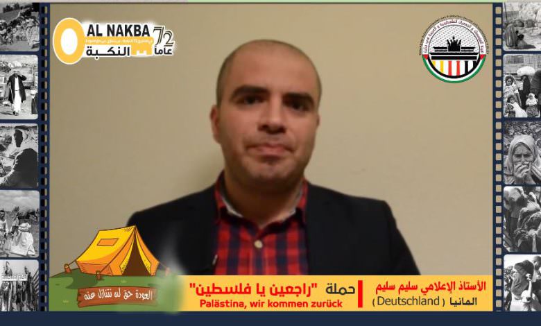 مساهمة الأخ الأستاذ الإعلامي سليم سليم في حملة هيئة المؤسسات والجمعيات الفلسطينية والعربية في برلين (راجعين يا فلسطين) لإحياء ذكرى النكبة 72.