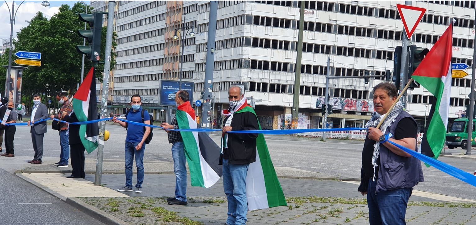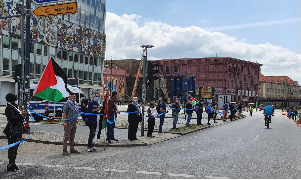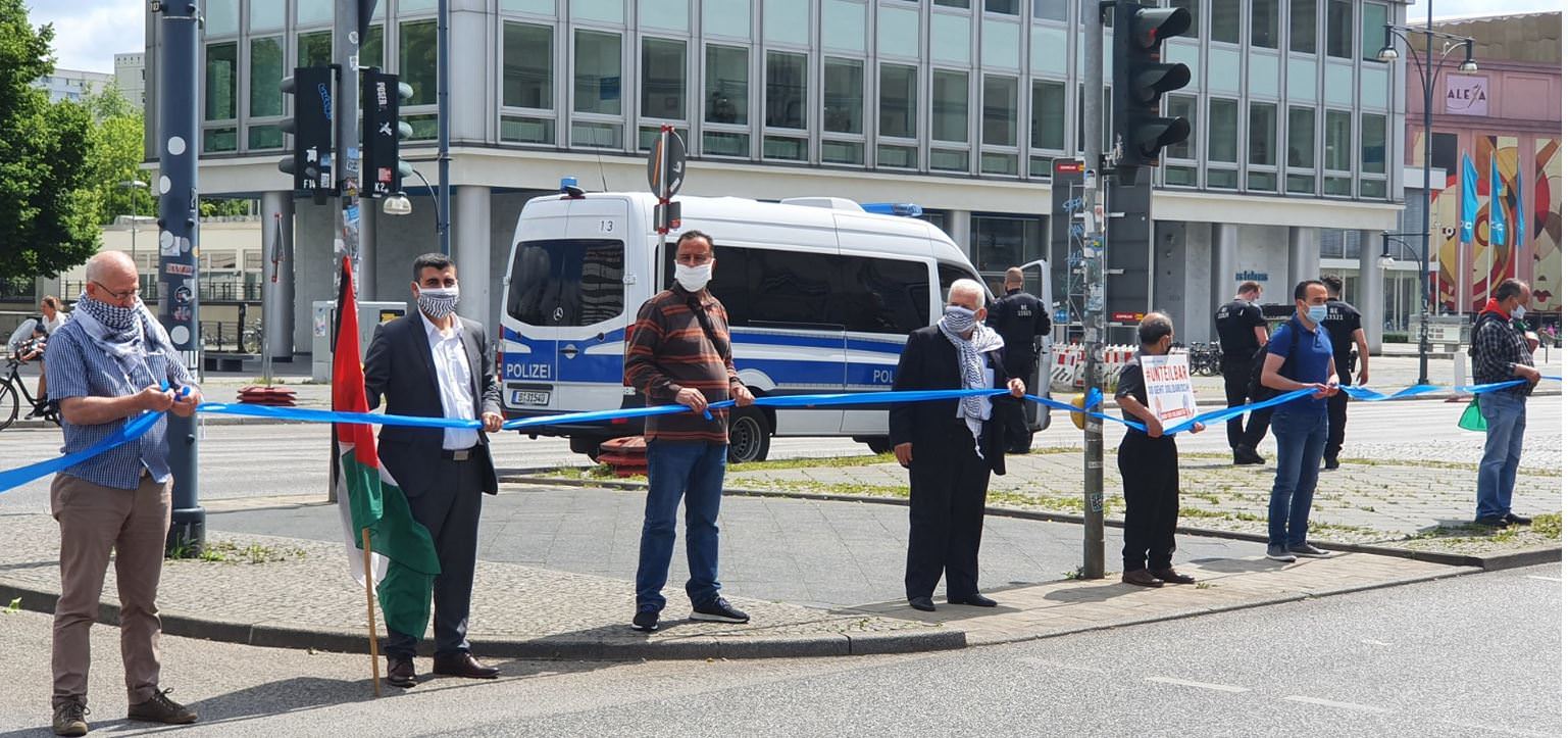 وقد رفع المحتجّون الّذين اصطفّوا يداً بيد في سلسلة بشريّة .. إخترقت عدّة مناطق في العاصمة الألمانيّة برلين .. وهم يرتدون الكمّامات الواقية .. هي اليافطات الّتي رُفعت والّتي تستنكر وتدين وتُندد بعنصريّة الشّرطة الأمريكيّة .. كما ورفع المتظاهرون الصّور والّلافتات الّتي كُتب عليها شعارات عديدة .. تدين العنصريّة وجريمة قتل المواطن الأمريكي جورج فلويد .. ورُفِعت الأعلام الفلسطينيّة والشّعارات والصّور الّتي تفضح ممارسات الإحتلال .. حيث كان علم فلسطين يُرفرف في أكبر تقاطع للشّوارع في قلب برلين في ساحة الكسندر بلاتس ..