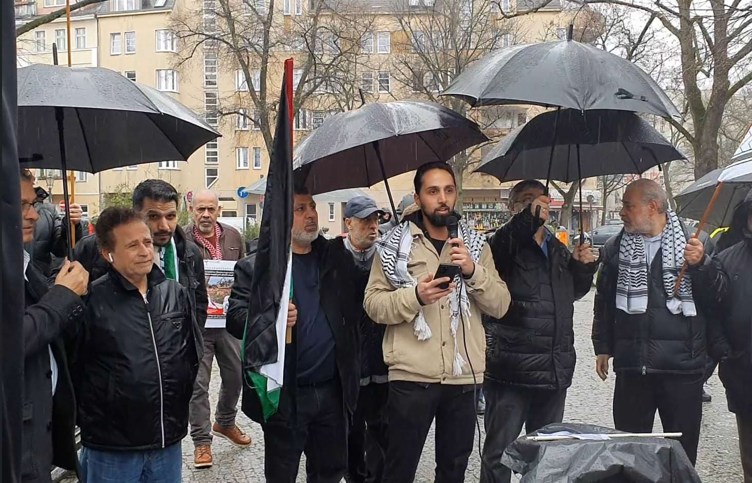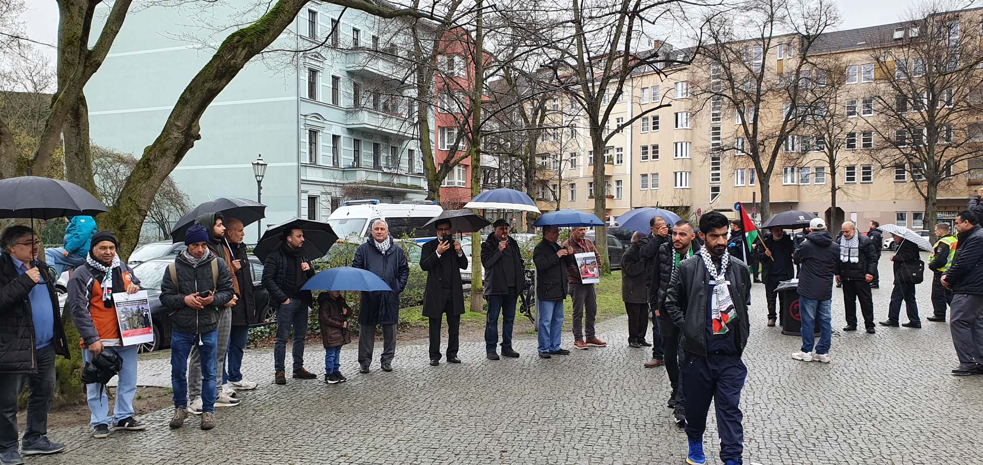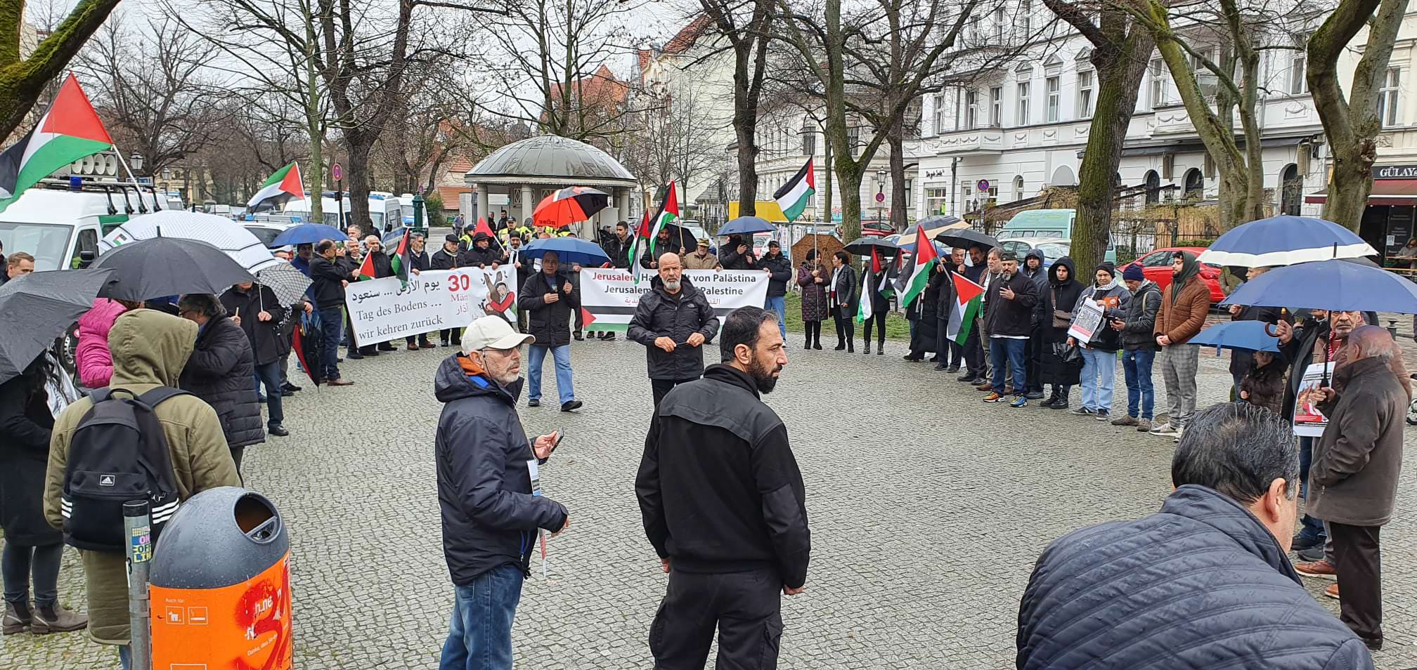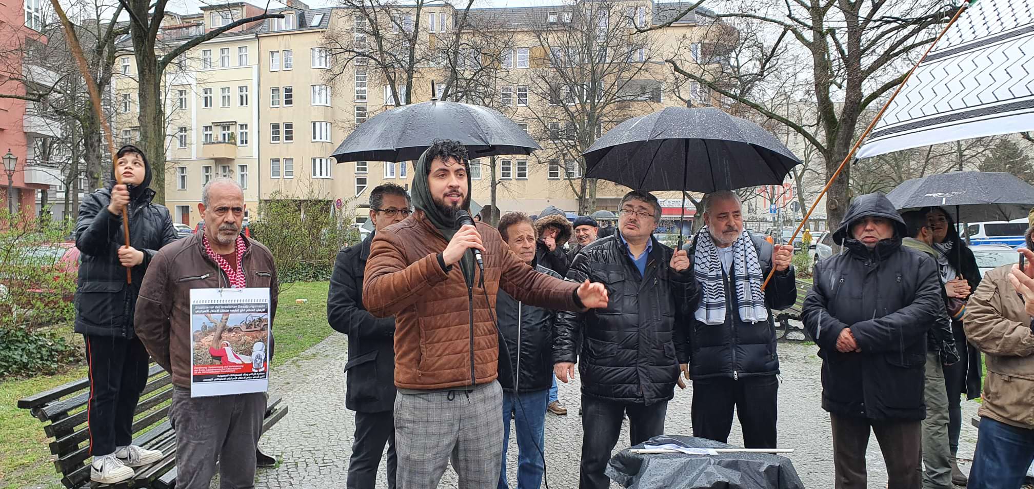 وجّه المتظاهرون تحيّة من برلين لأهل الأرض .. أبناء الشعب العربي الفلسطيني في الداخل الفلسـطيني المحتل عام 48 .. وحيثما تواجد .. يشدّون على أياديهم … ويحيون صمودهم … ومعهم … حتى العودة والتحرير وتقرير المصير .. ويرددون كما قال شاعرنا الكبير محمود درويش … وأسد فلسطين الشيخ رائد صلاح إنا هنا في فلسطيننا باقون .. ما بقي الزعتر والزيتون … راسخون هنا راسخون … حجر وشجر وبشر… ونحن الباقون وسنكون ..