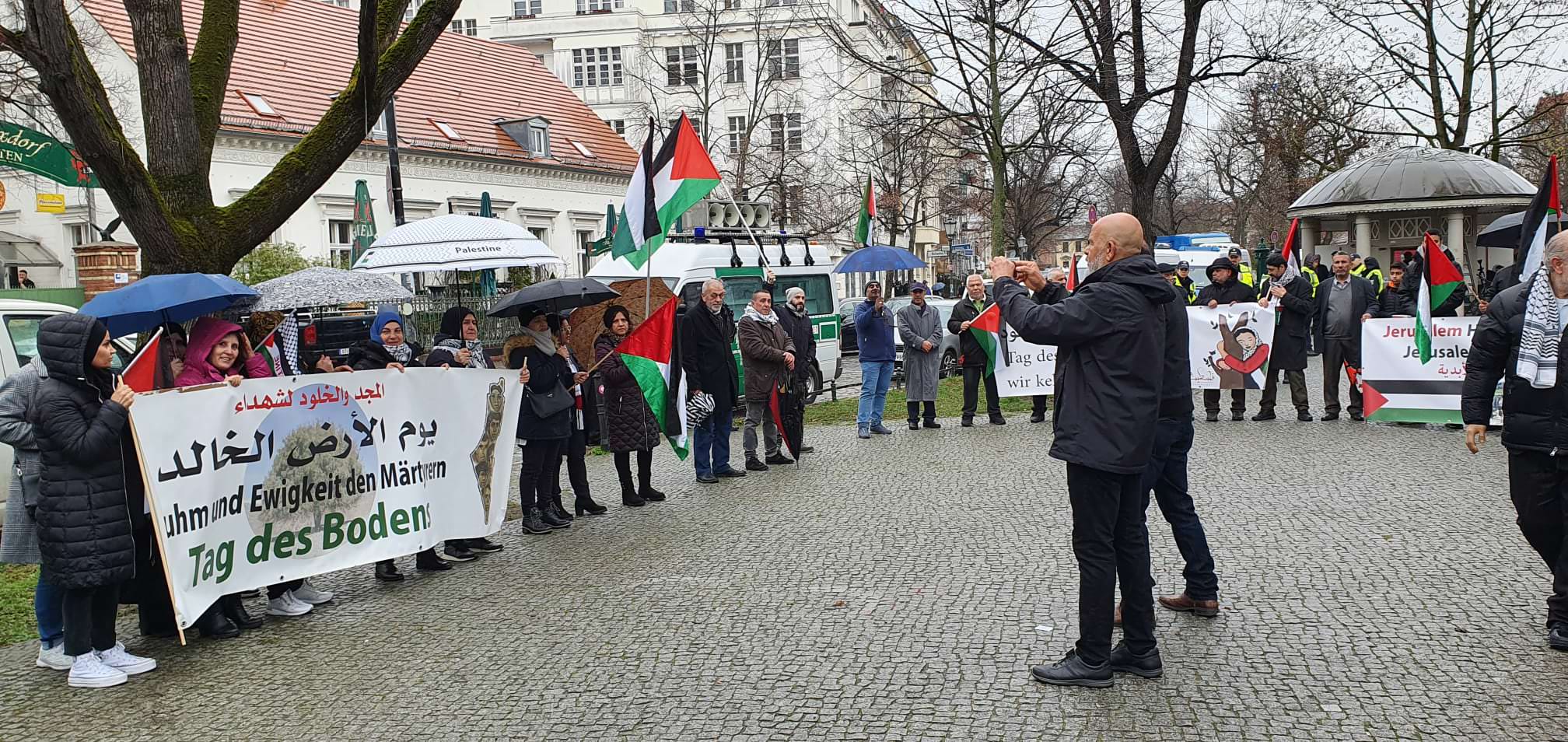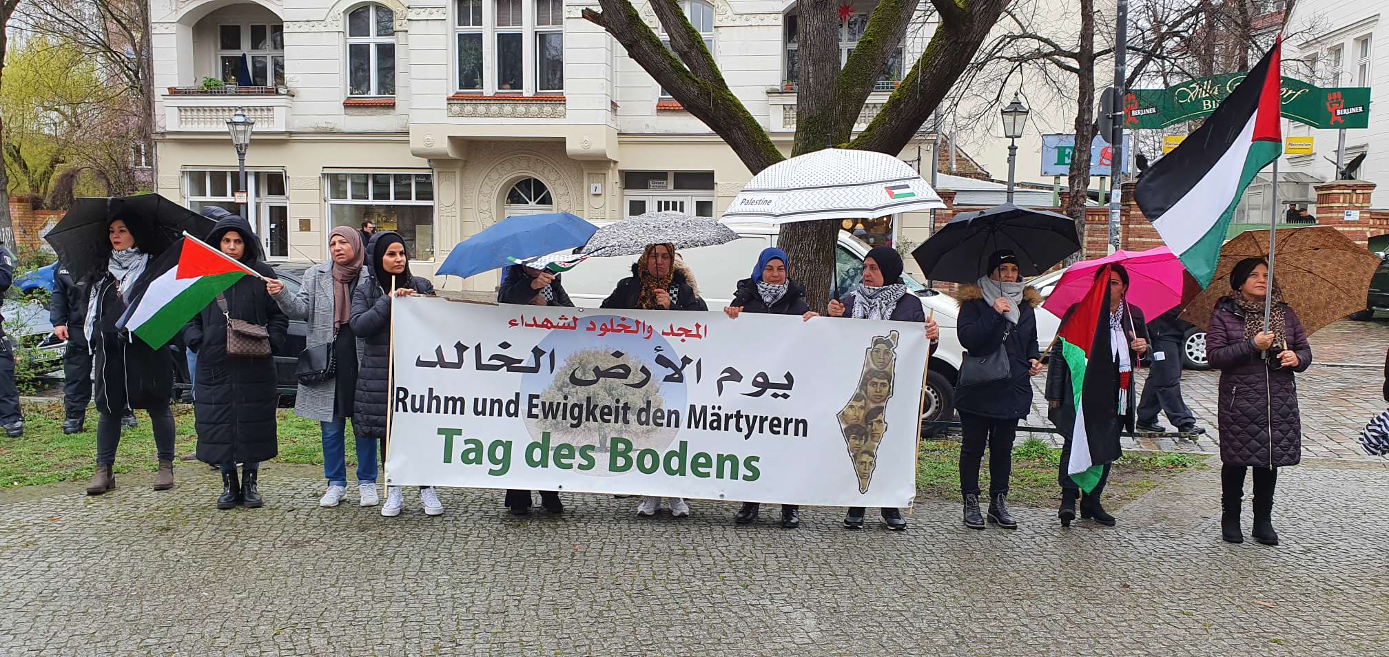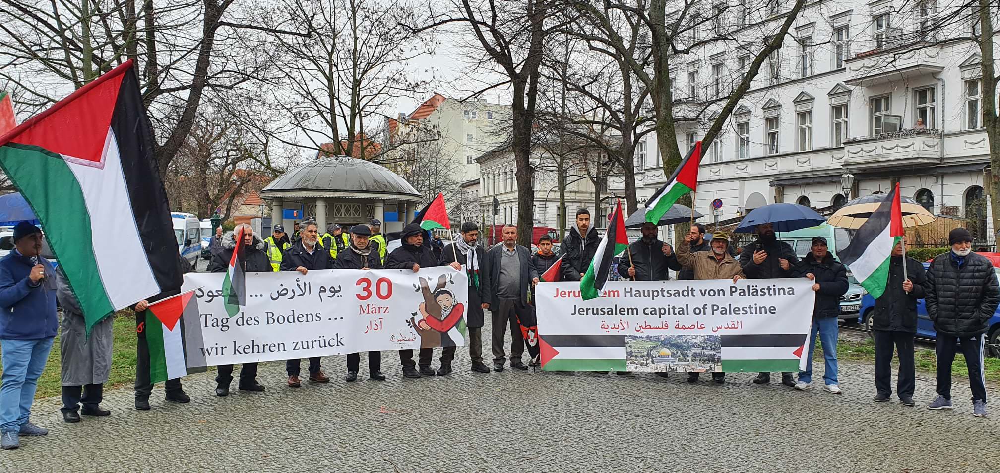 أحيت هيئة المؤسّسات والجمعيّات الفلسطينيّة والعربيّة في برلين ولجنة العمل الوطني .. ذكرى يوم الأرض في قلب برلين .. حيث خرج أبناء الشعب الفلسطيني في برلين في الذكرى السابعة والأربعين ليوم الأرض الخالد .. وهو اليوم الذي يُحييه أبناء الشعب الفلسطيني في كل عام .. رمزاً للّدّفاع عن ثوابته وعن أرضه وكرامته.. حيث يصادف الثلاثين من آذار من كل عام ذكرى إحياء يوم الأرض الخالد .. اليوم الوطني الّذي تصدّت فيه الجماهير العربية الفلسطينية في النّقب والمثلّث والجليل والسّاحل عام 1976.. لمشاريع مُصادرة الأراضي والتّهويد والتّهجير.. بصدورهم العارية وبإرادتهم وبعزيمتهم وبإيمانهم بحقوقهم .. وأعلنت فيه جماهير الشّعب الفلسطيني النّفير والإضراب العام .. وتصدّى فيه الشعب الفلسطيني لقوّات عدوان المحتلّ دفاعاً عن عروبة فلسطين .. وقدّمت فلسطين ستّة شهداء من أبنائها ومئات الجرحى والمعتقلين ..على درب نيل الحرّيّة والتّحرير والإستقلال ..