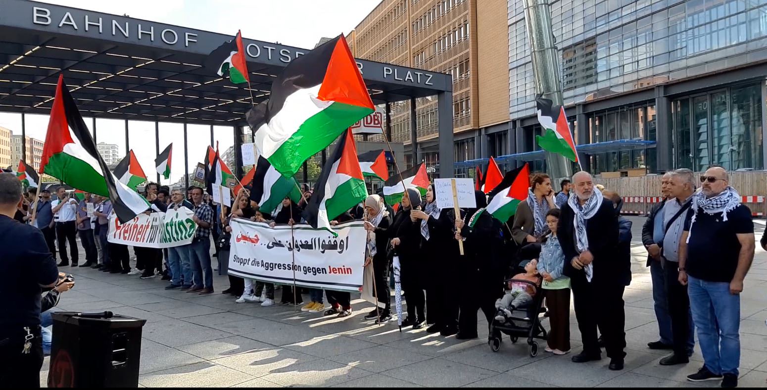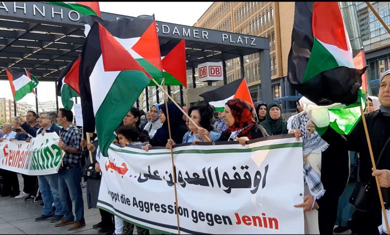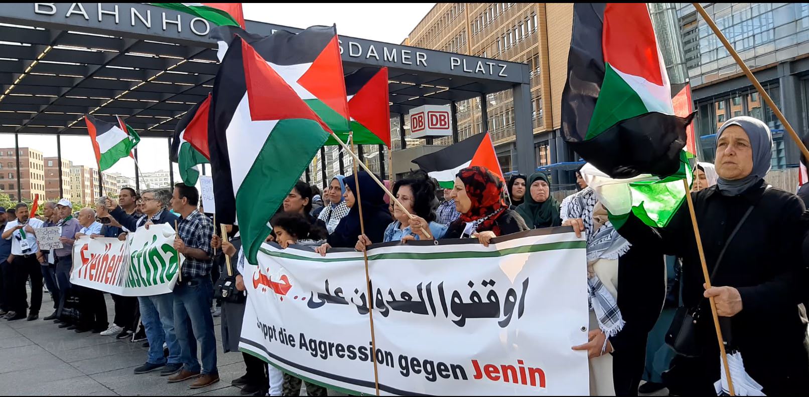 تضامناً وإسناداً لصمود ابناء شعبنا الفلسطيني في جنين ضد الهجمة الصهيونية العسكرية الإجرامية التي شنها جيش الاحتلال الاسرائيلي أقامت لجنة العمل الوطني المشترك بالتشارك مع هيئة المؤسسات العربية والفلسطينية في برلين وقفة جماهيرية داعمة ومساندة لجنين.