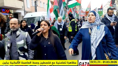 مظاهرة حاشدة وسط العاصمة الألمانية برلين للمطالبة بوقف الإعتداءات على غزة والضفة الغربية.